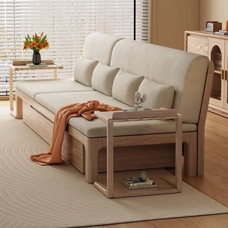 高級感溢れる新中式ウッコウムクの無垢材ソファセット|冬夏兼用の貴妃ソファと収納機能付き|スタイリッシュなリビングに最適なティーテーブル付き!