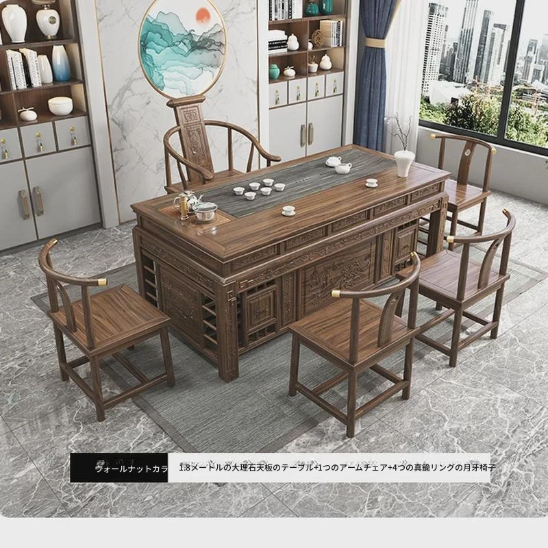 新中式の無垢材製ティーテーブル&チェアセット - オフィスや家庭に最適な一体型のティーテーブル。伝統的な功夫茶を楽しむための古典的な茶台で、心安らぐひとときをお届けします。