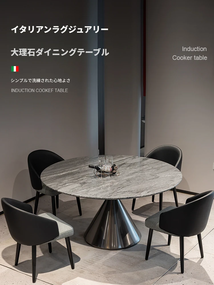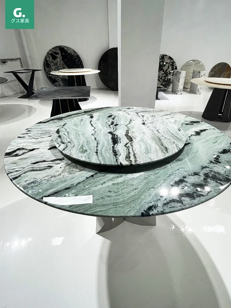 イタリアンスタイルのラグジュアリー、ブルースグレーの大理石丸テーブル - 現代的なシンプルさを兼ね備えた高級ダイニングテーブル、別荘や家庭に最適!