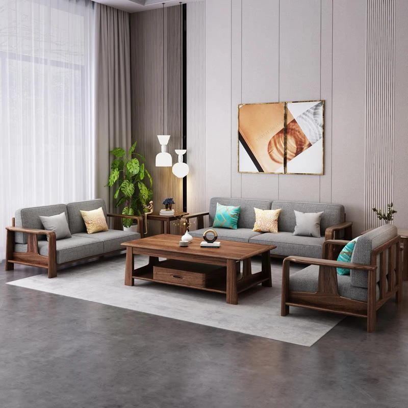 Modern Chinese Style Solid Wood Sofa Set - 1+2+3 Configuration, Elegant Wu Jin Wood and Fabric Design for Living Room Furniture, Perfect Blend of Tradition and Comfort