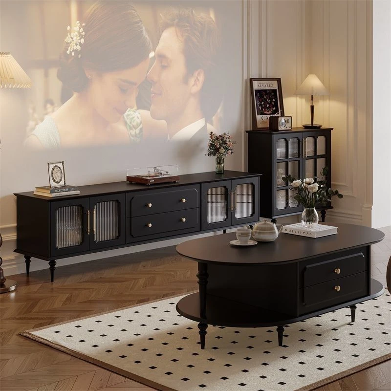 2023 New Vintage American TV Stand & Coffee Table Set - French Style, Perfect for Small Living Rooms, Solid Wood Black TV Cabinet