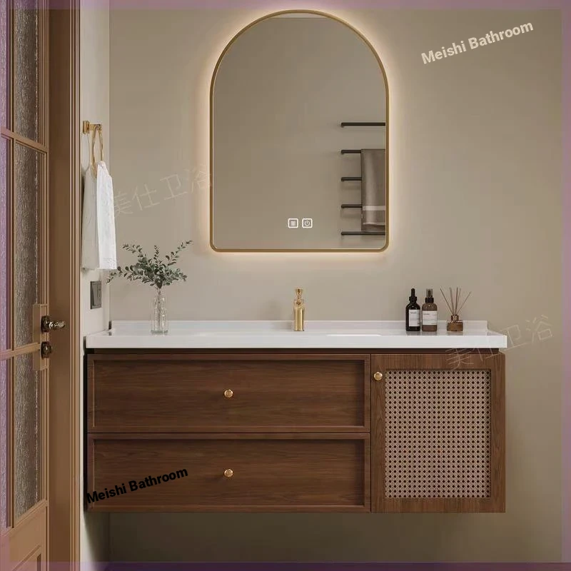 French Vintage Rattan Bathroom Cabinet with Red Oak Combination - Elegant Ceramic Integrated Basin for Handwashing and Daily Grooming