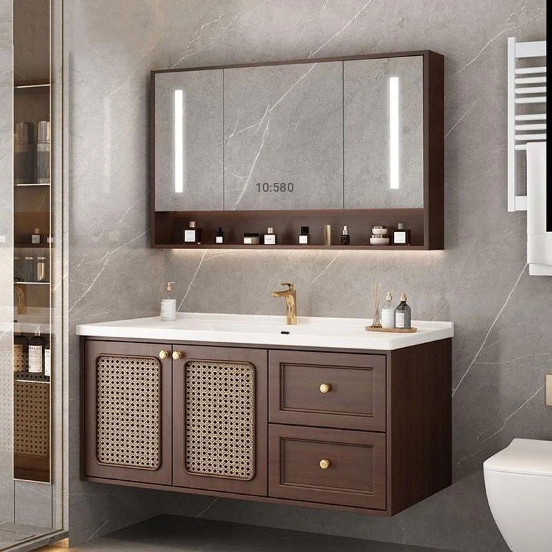 New Chinese Style Oak Rattan Bathroom Vanity Set with Integrated Ceramic Sink - Vintage Wash Basin for Stylish Bathing and Grooming Experience
