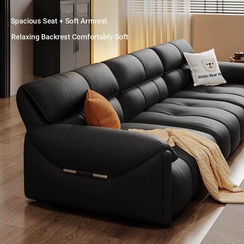 SENHUA Italian Minimalist Genuine Leather Black Sofa - Luxurious Top-Grain Cowhide Couch with Stylish Tofu Block Design for Your Living Room