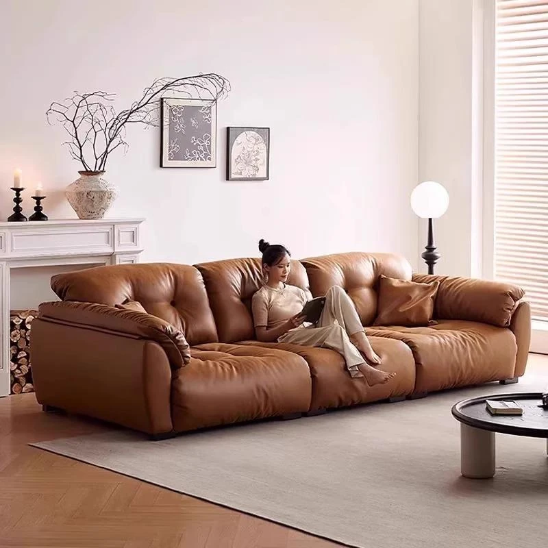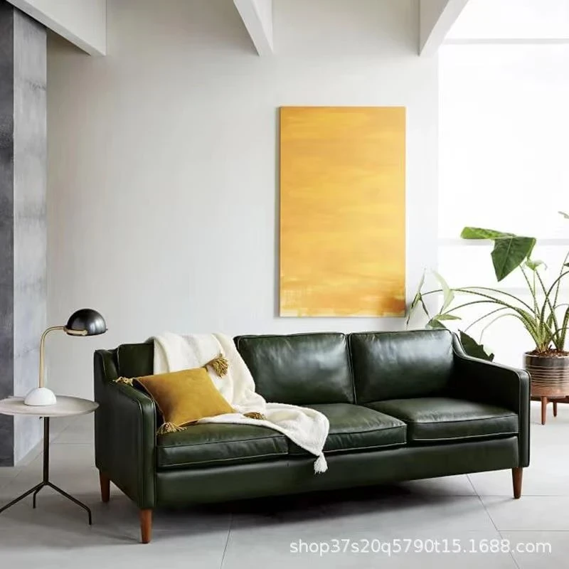 Nordic Vintage Genuine Leather Sofa - Minimalist Solid Wood Living Room Set for Small Spaces, Featuring Top Grain Cowhide Upholstery and Straight Line Design