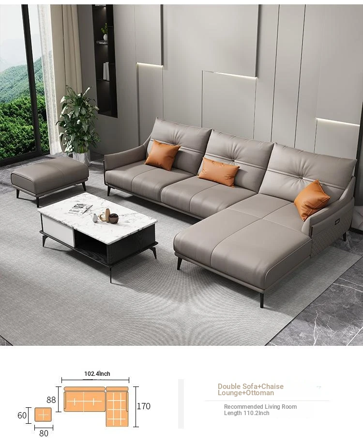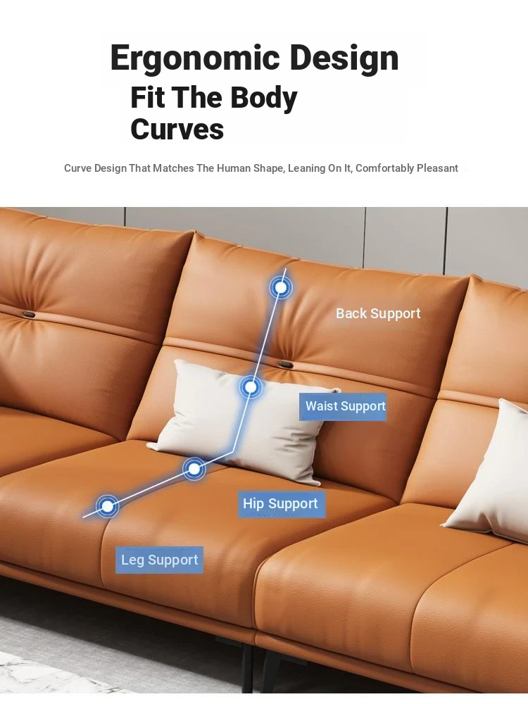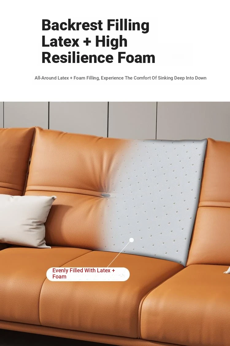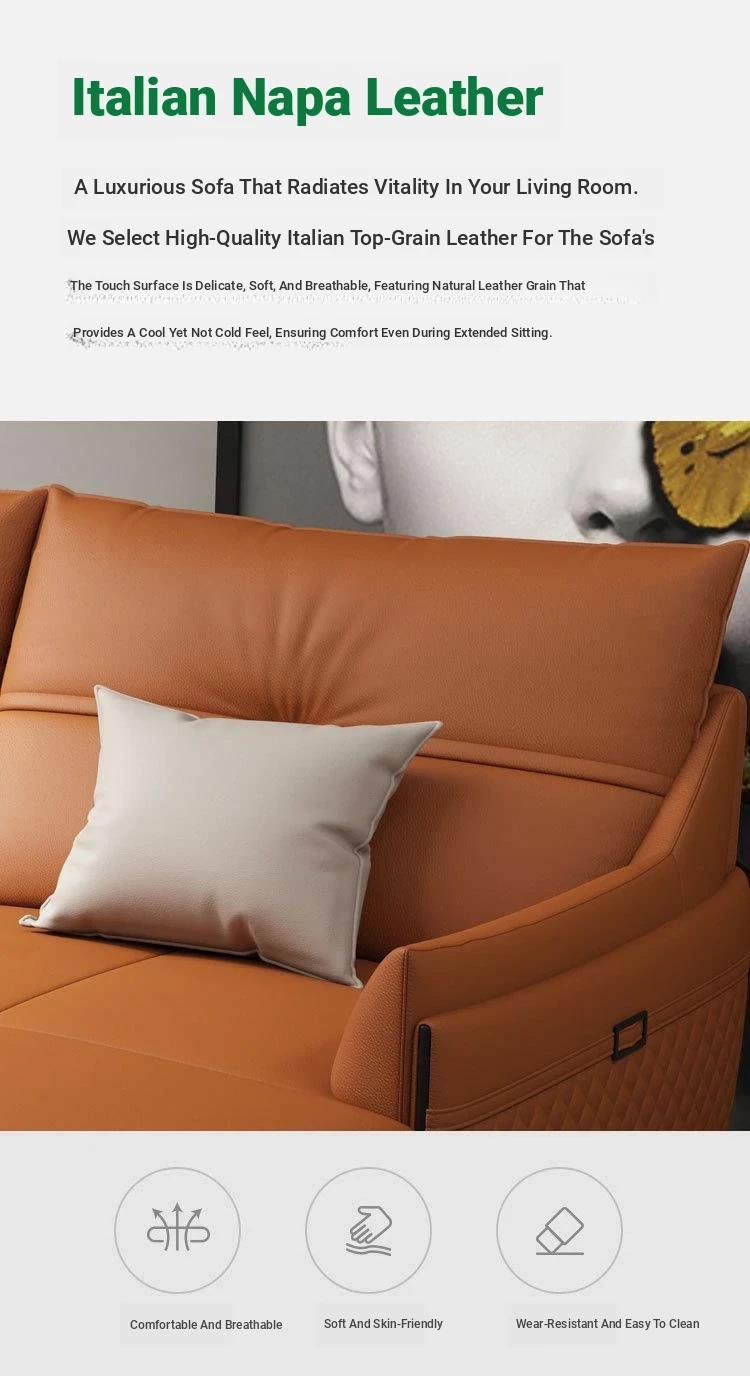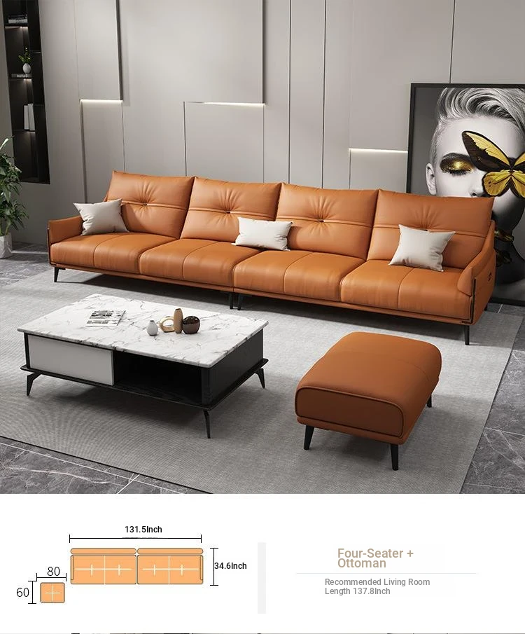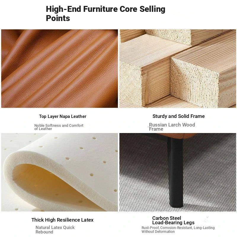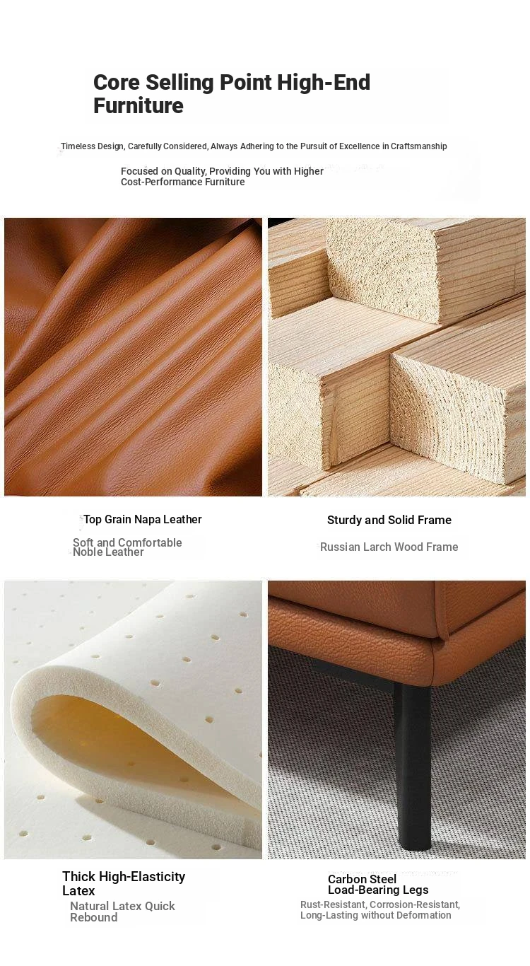 Contact surface (Import) leather + all solid wood inner frame + high density sponge + electroplating process sofa feet