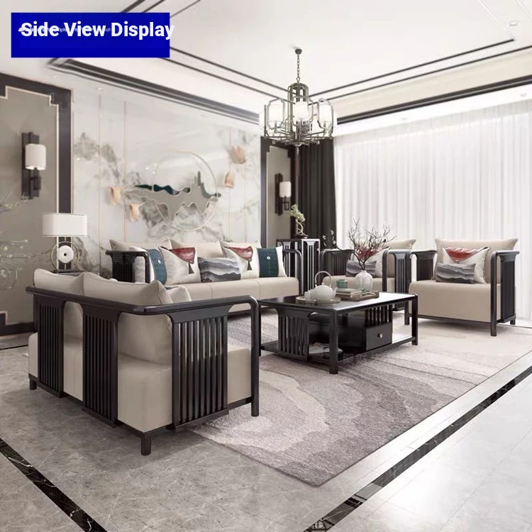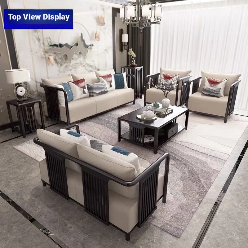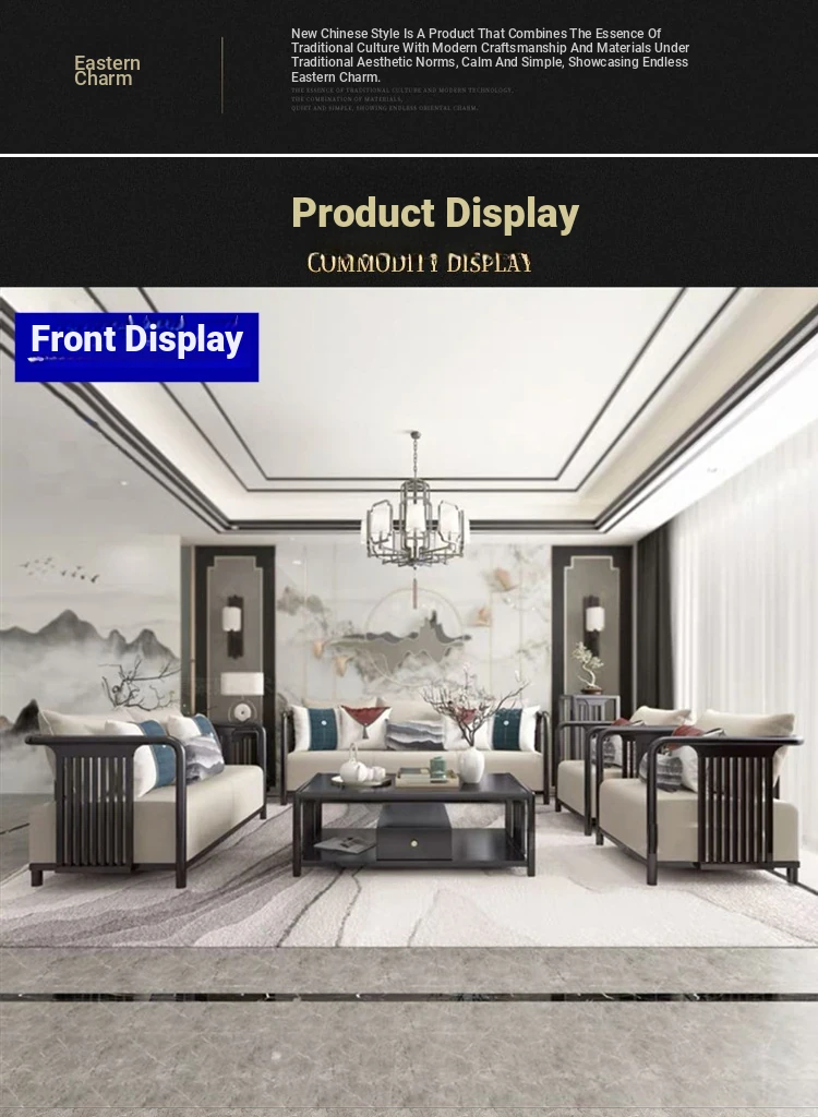 Modern Chinese Style Solid Wood Sofa Set - Elegant Minimalist Design for Small Spaces, Complete Living Room Furniture for Showrooms and Cozy Homes.
