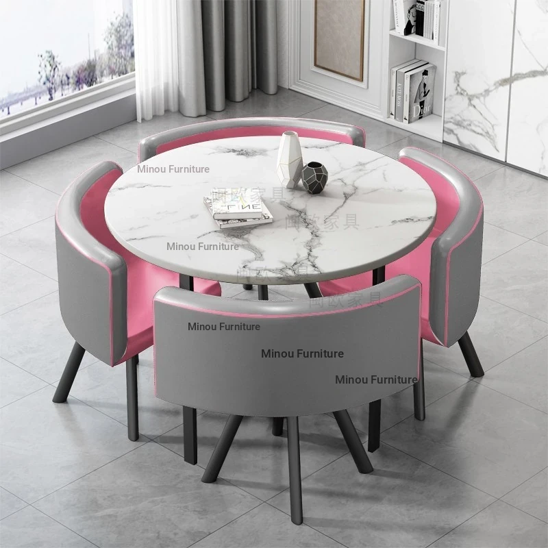 White Round Table with Imitation Stone Pattern in Powder and Grey Leather Chair