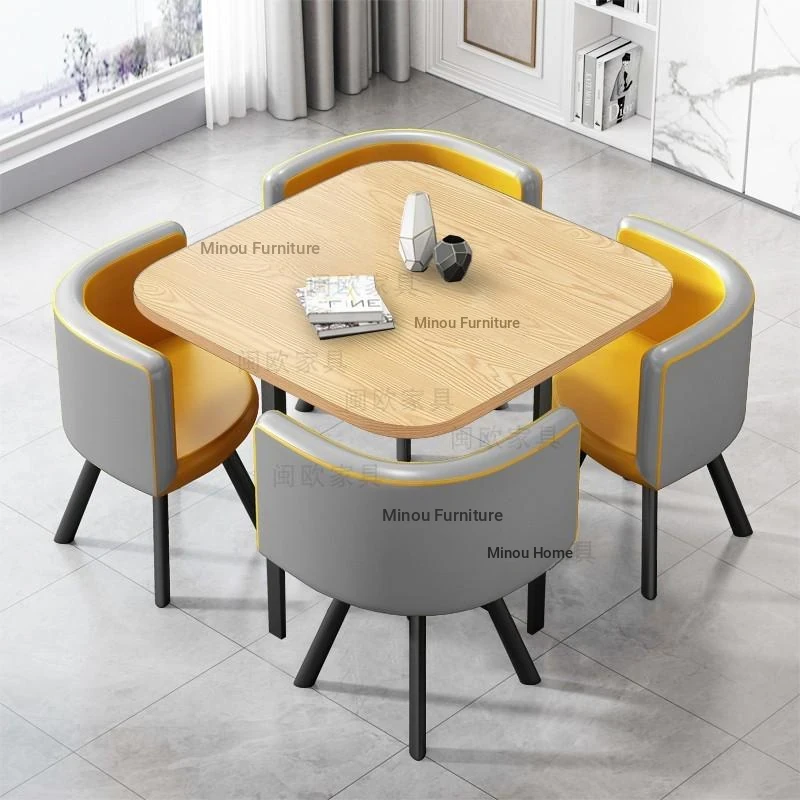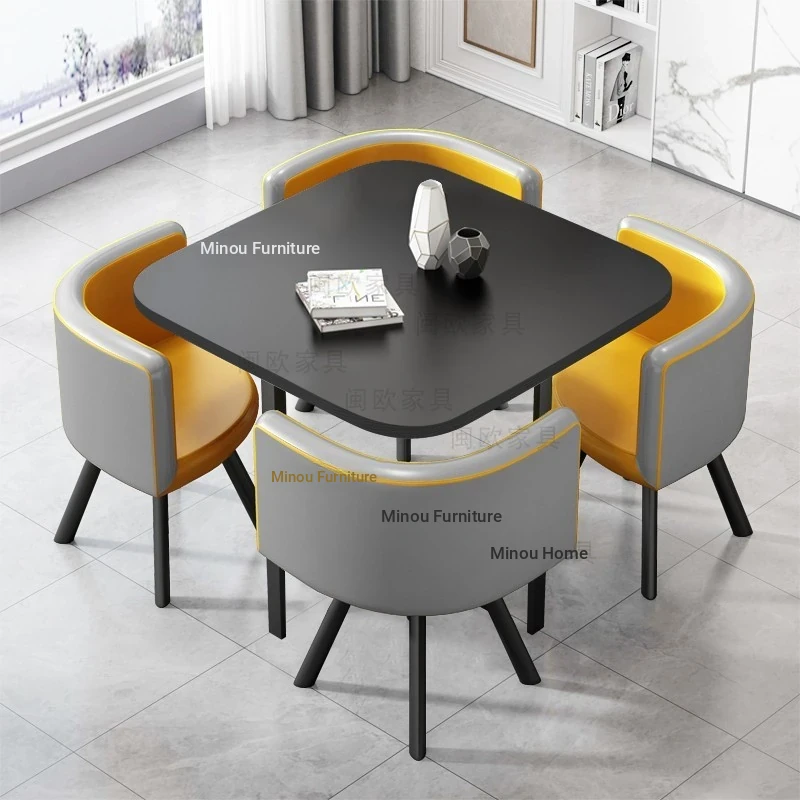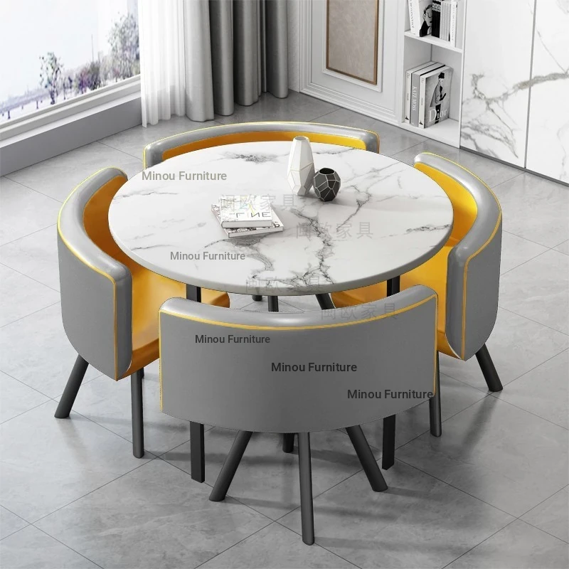 Inner Yellow Outer Grey Leather Chair Imitation Stone White Round Table