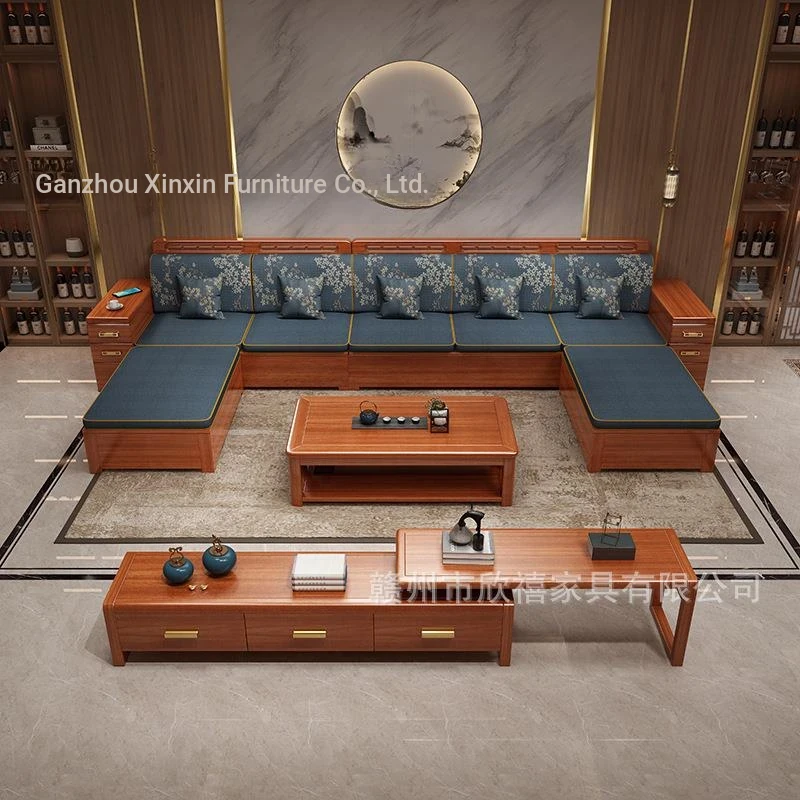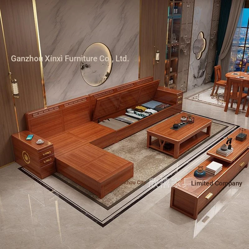 Modern Minimalist Sofa in Golden Walnut Wood - New Chinese Style, Solid Wood, Perfect for Small Living Rooms, Featuring a Convenient Chaise Lounge with Storage Solutions.