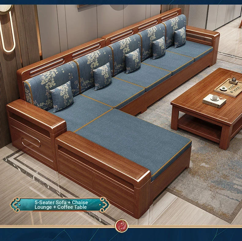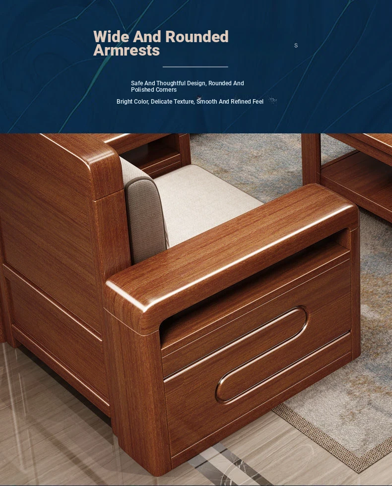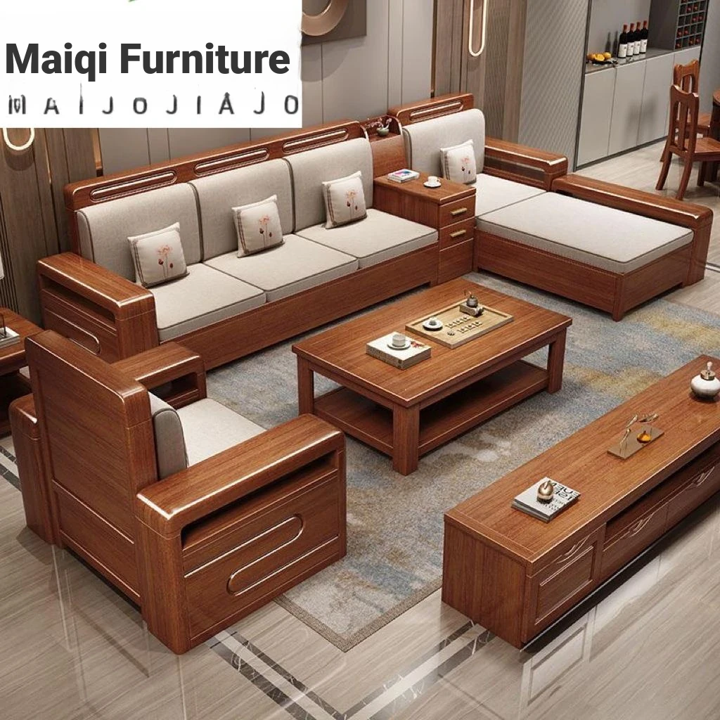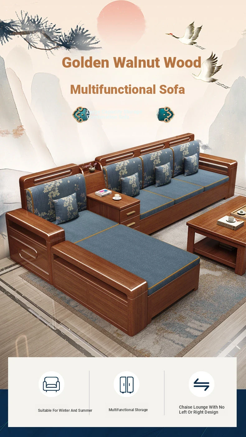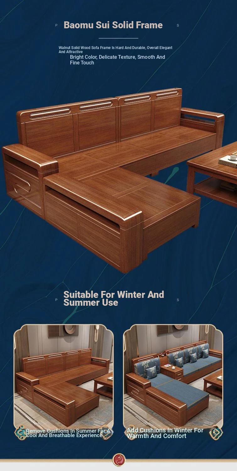 Walnut Solid Wood Sofa Set for Small Living Rooms – Versatile Chinese-Style Chaise Lounge with Corner Storage, Perfect for Year-Round Comfort