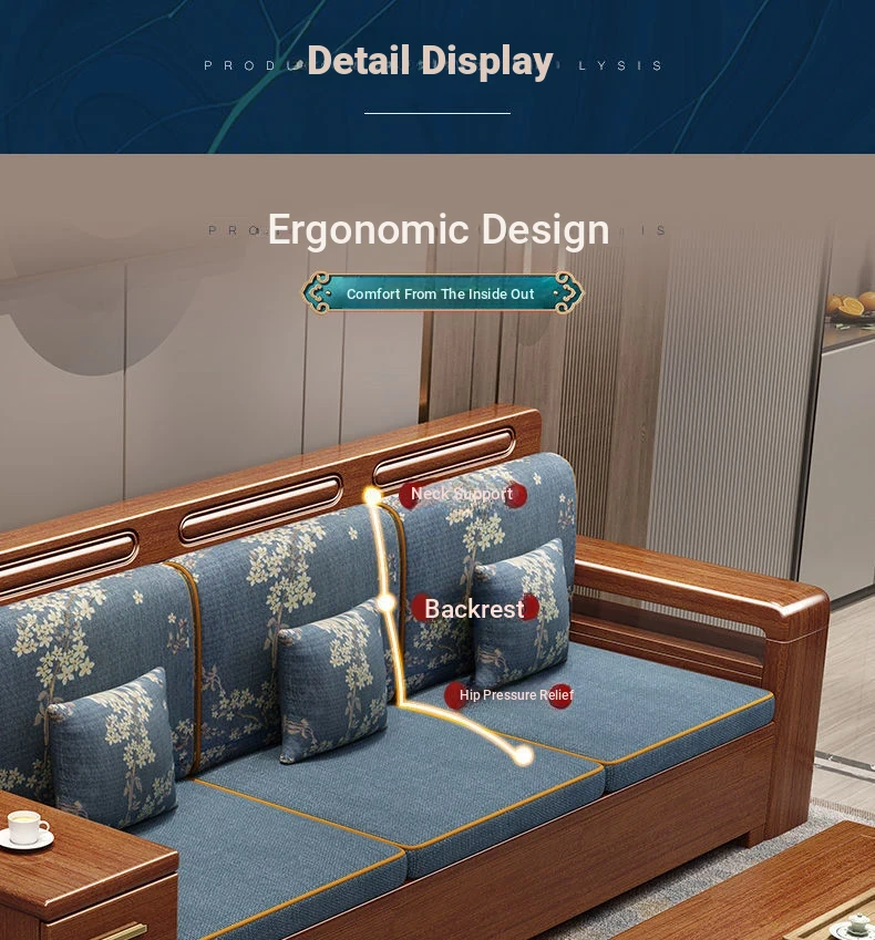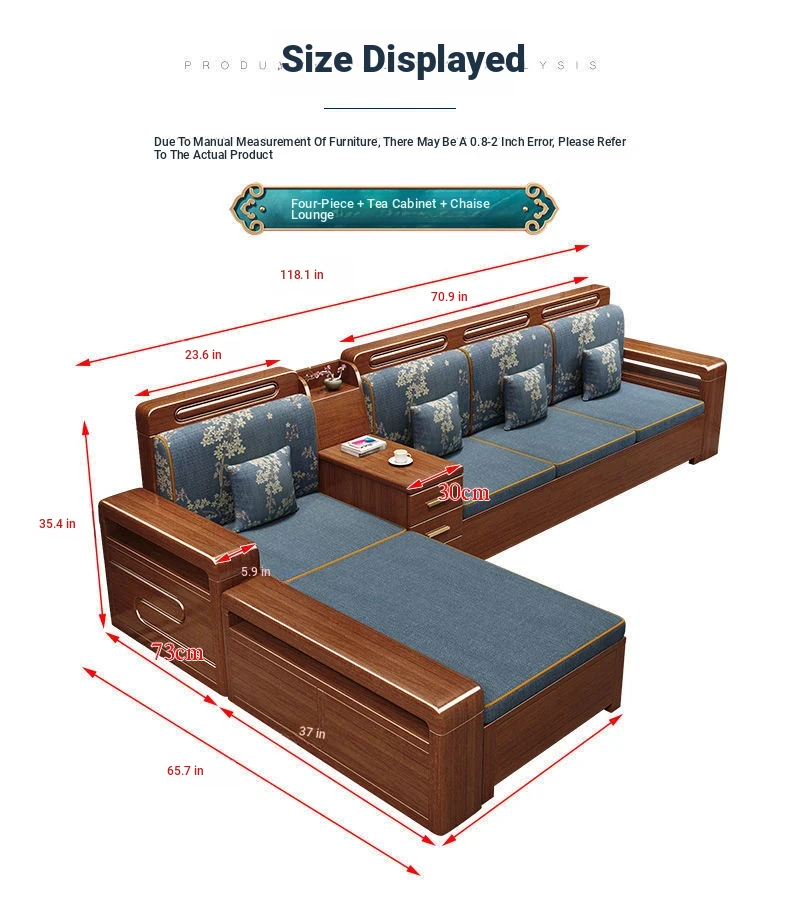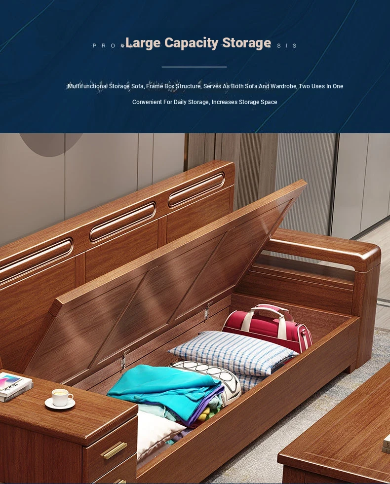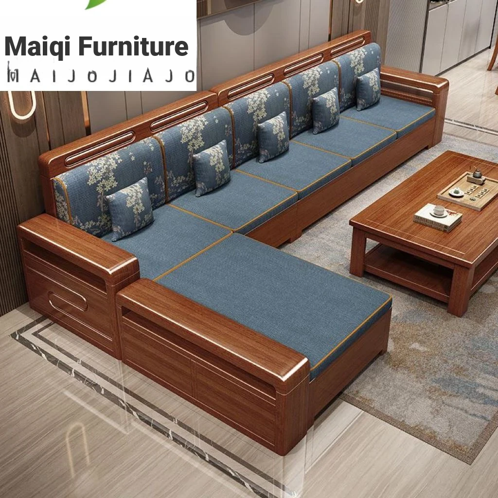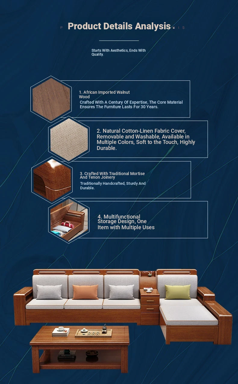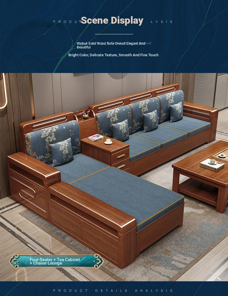 Walnut Solid Wood Sofa Set for Small Living Rooms – Versatile Chinese-Style Chaise Lounge with Corner Storage, Perfect for Year-Round Comfort