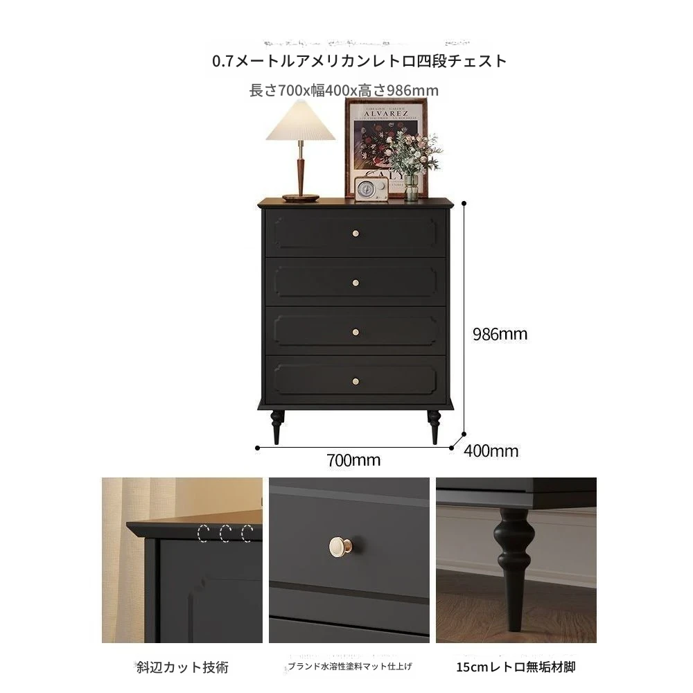 0.7メートルアメリカンレトロ4段チェスト(ディープスカ黒)