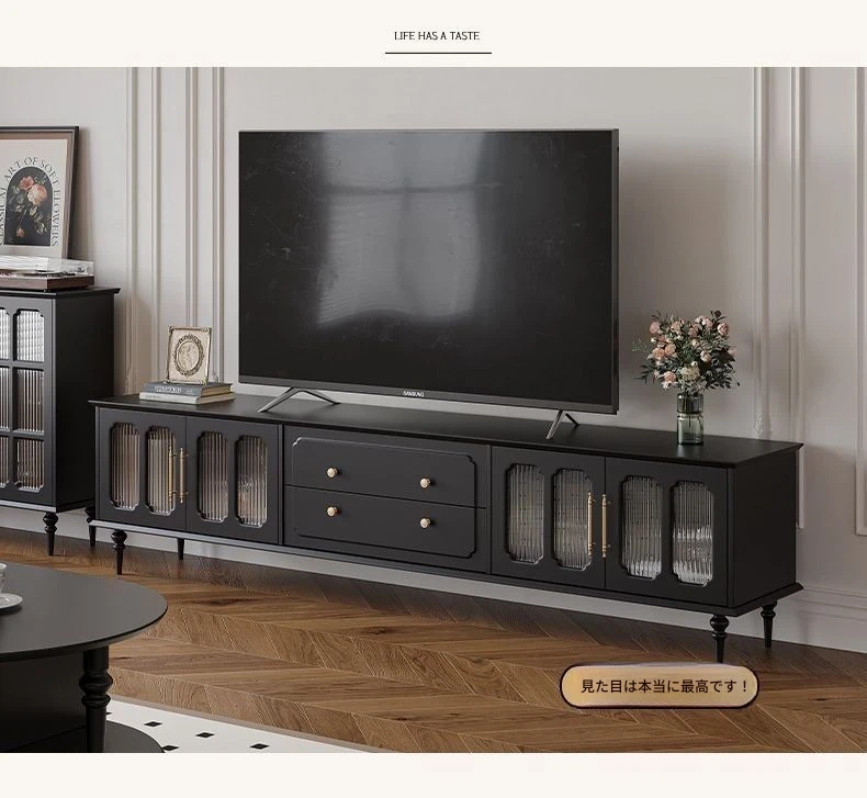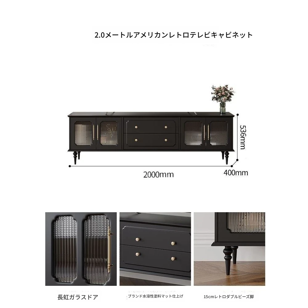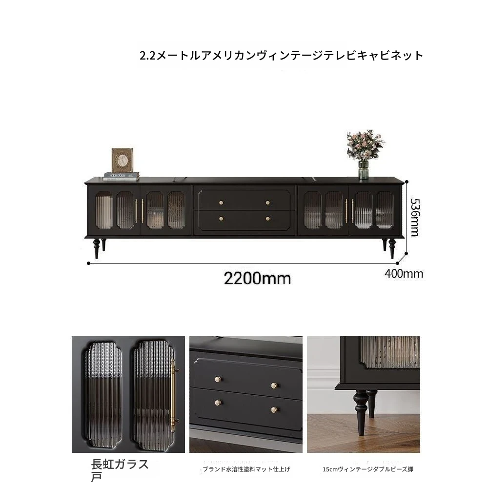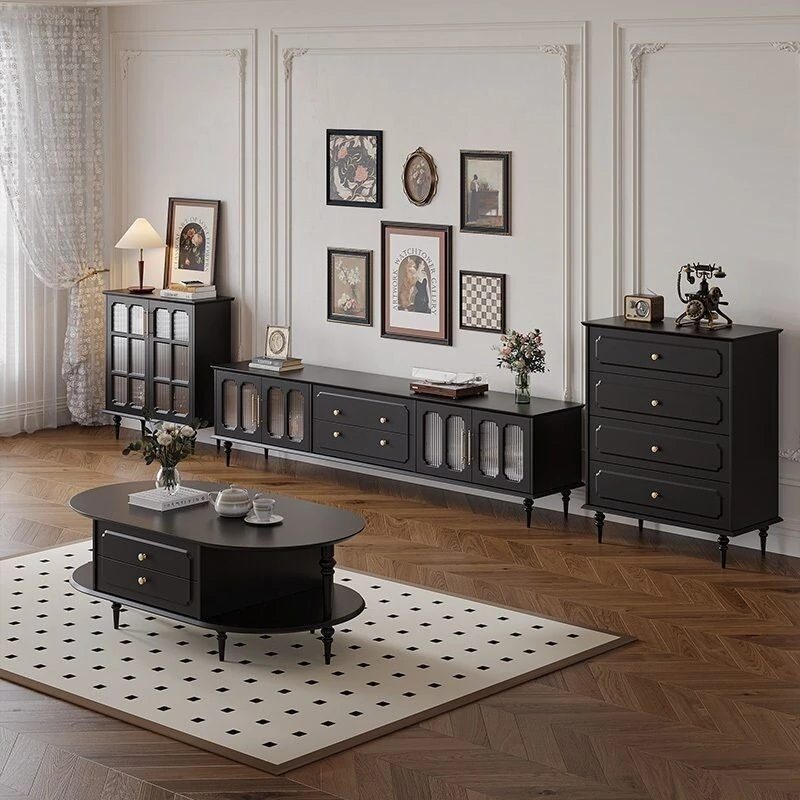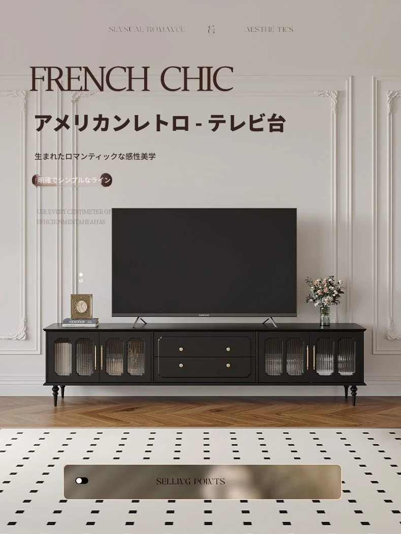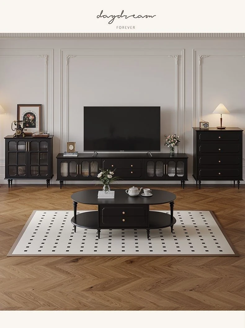 2023年新作!アメリカンレトロテレビ台&コーヒーテーブルセット - フランス風デザインの小型リビングにぴったりな本格的な木製ブラックテレビボード!おしゃれで機能的、理想の空間を演出します。
