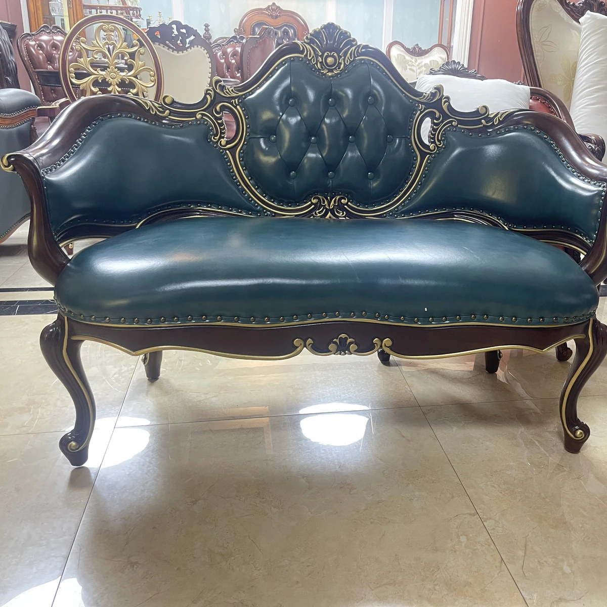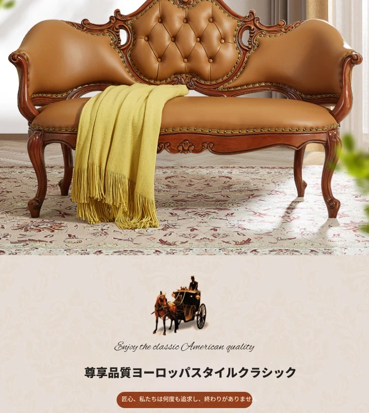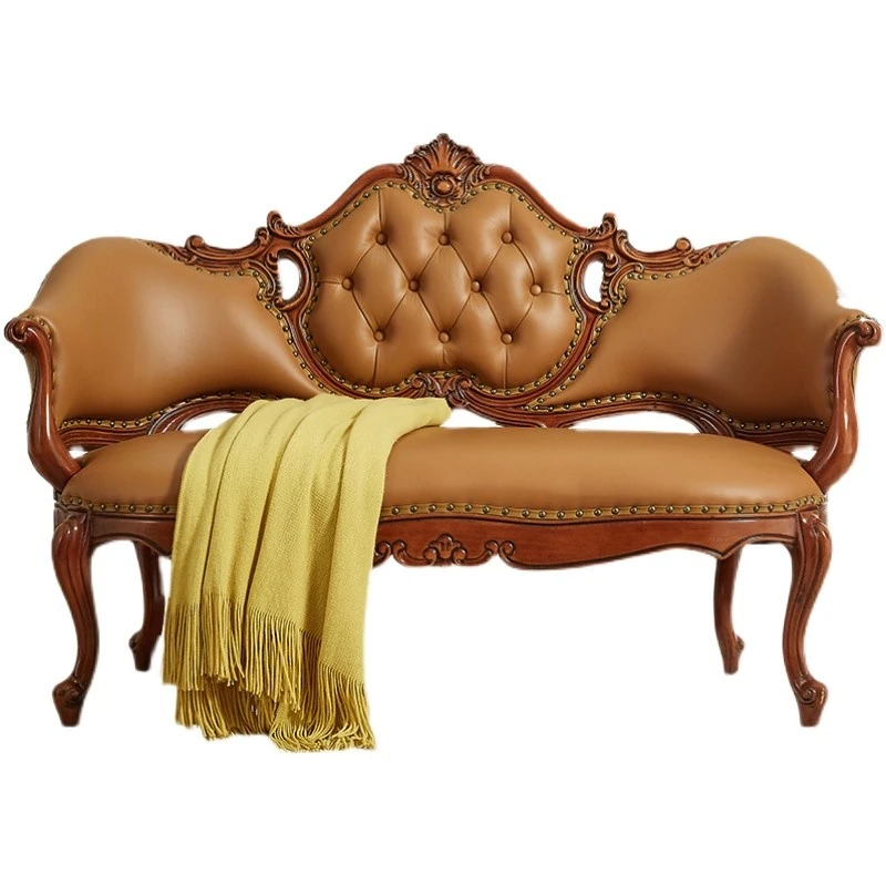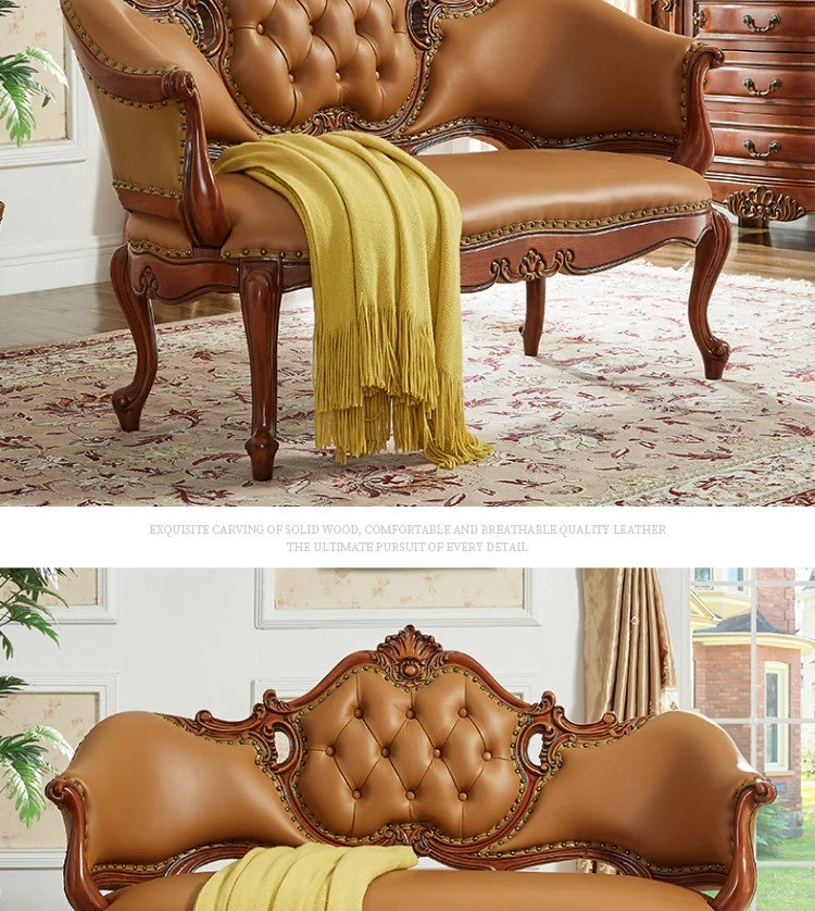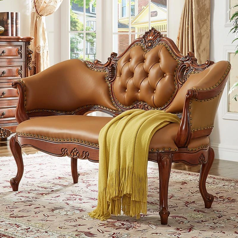 アメリカンスタイルの全木製フットレスト付き本革ソファチェア - 彫刻デザインのリビングルーム用談話椅子、リラックスできるヨーロピアンスタイルのレイジーチェア、ベッドサイドベンチにも最適!