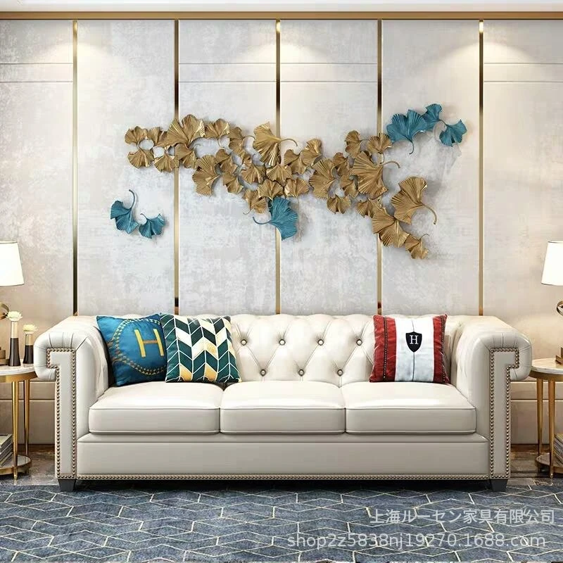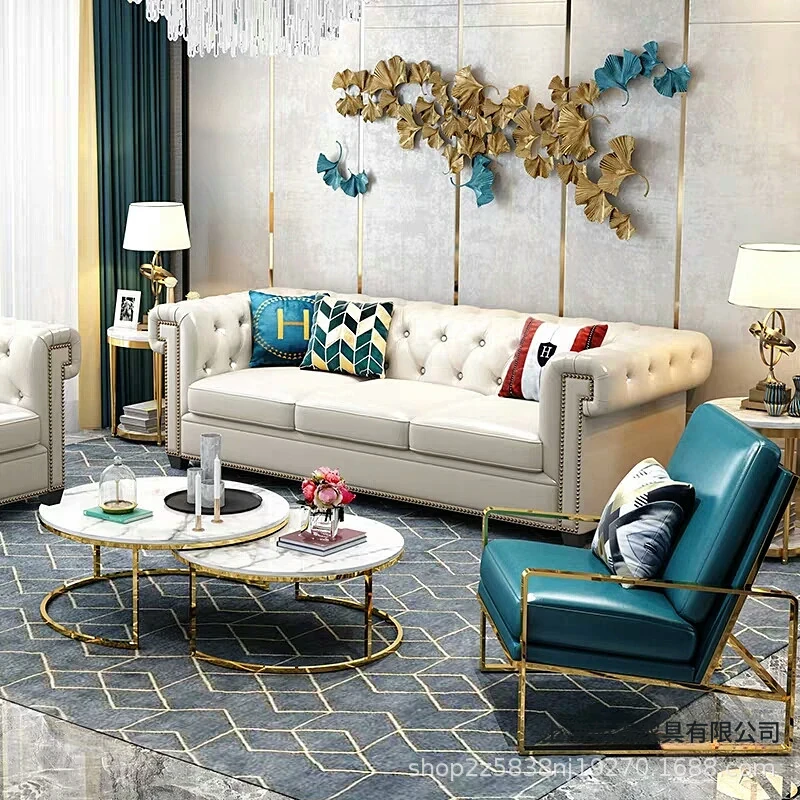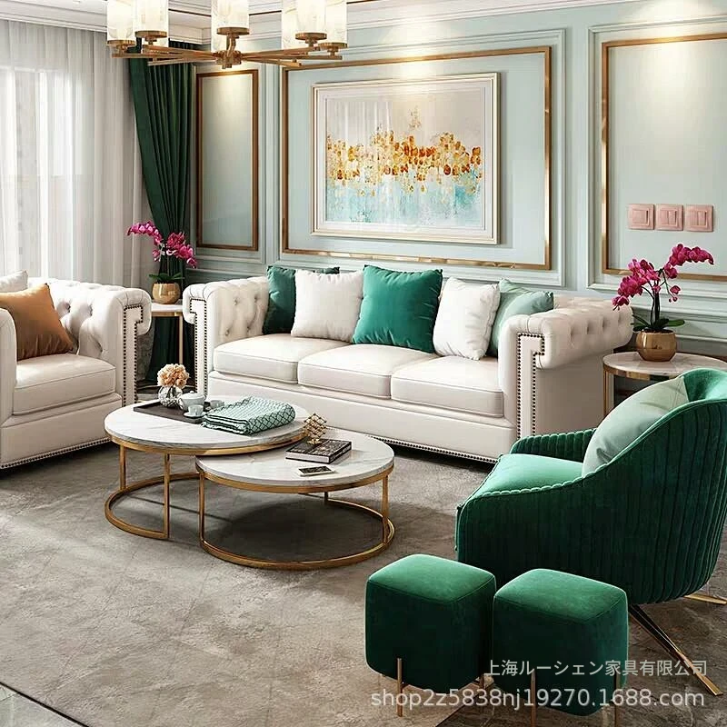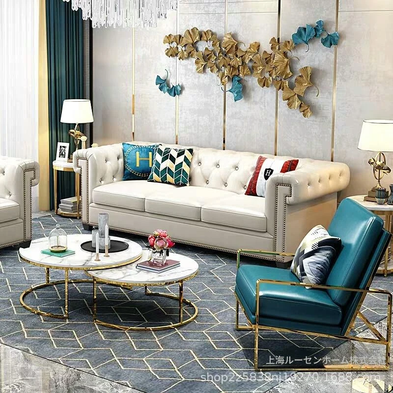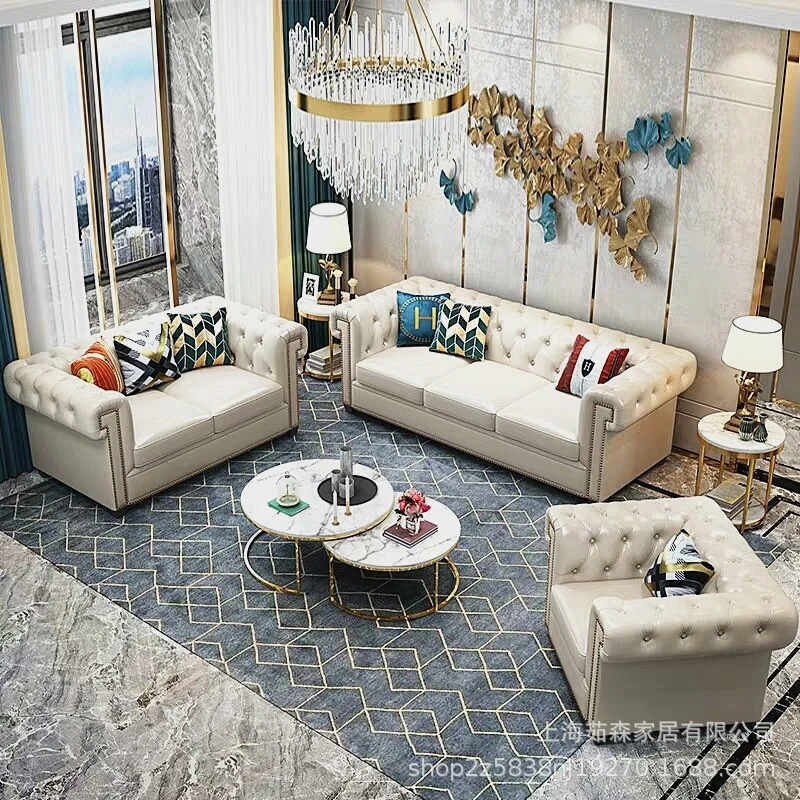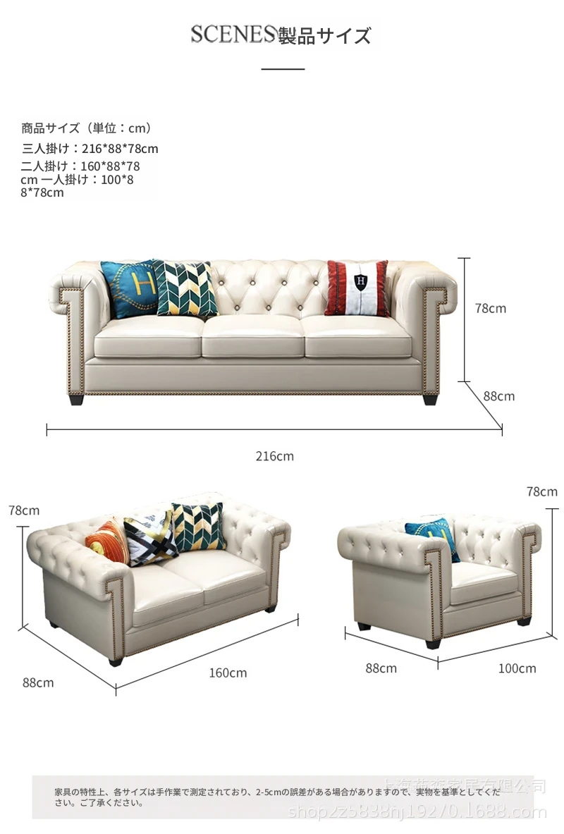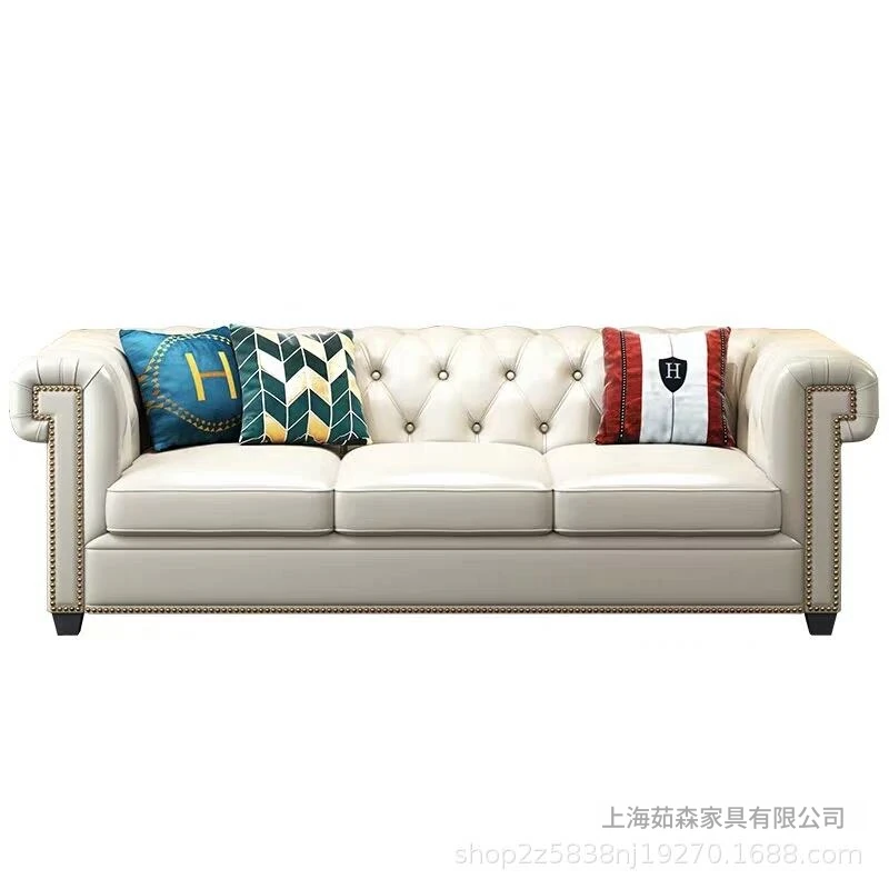 アメリカンスタイルのラグジュアリー・レザーソファセット|香港スタイルの大小兼用リビングに最適!シンプルなデザインで、ボタン付きの3人掛けソファ。おしゃれで快適な空間を演出します。
