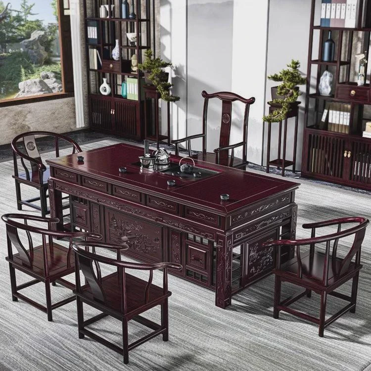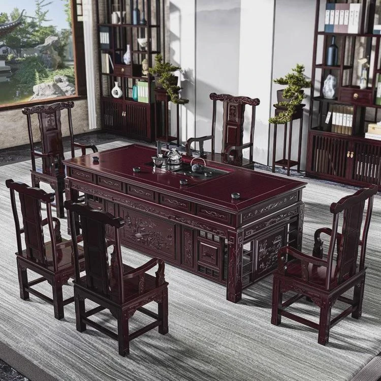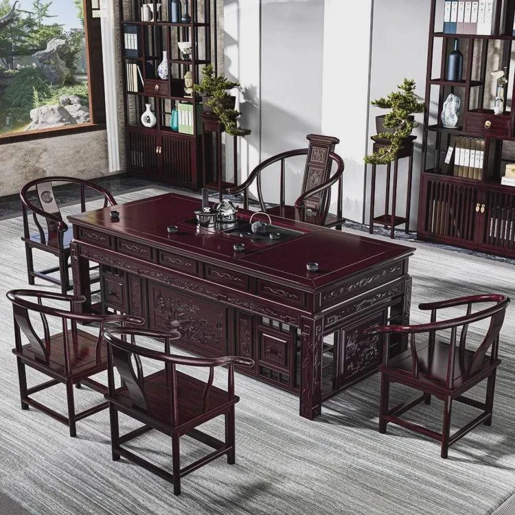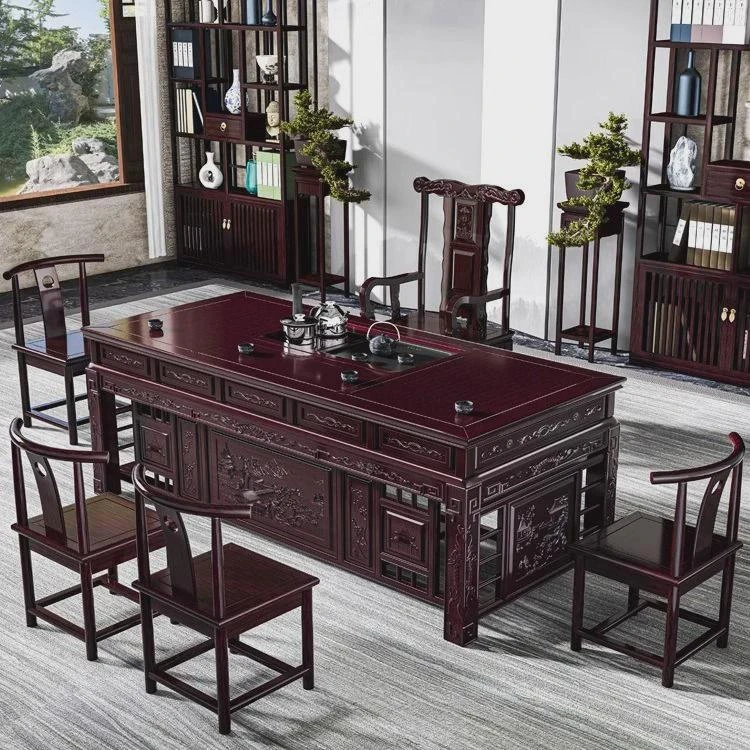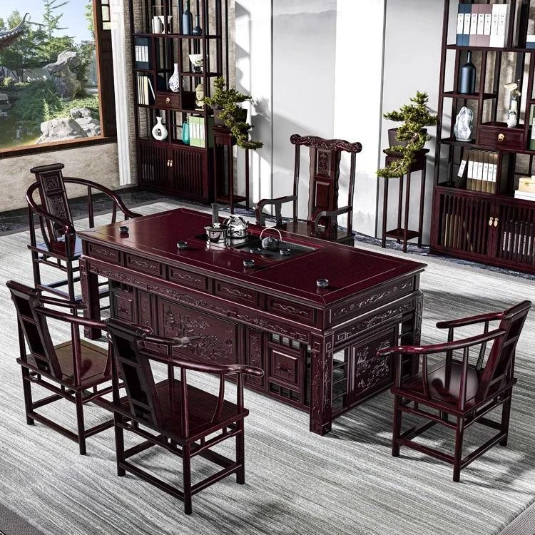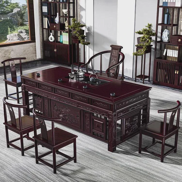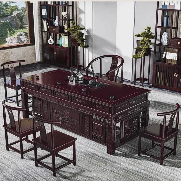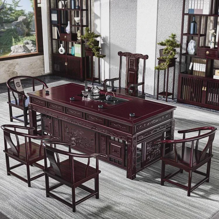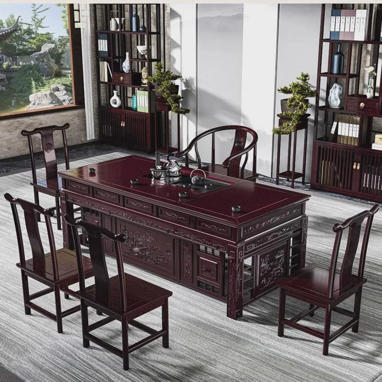 中華スタイルの無垢材製茶卓セット!楡の木を使用した高級感あふれるデザイン。オフィスや家庭での功夫茶体験に最適な一体型茶卓。リラックスしたひとときをお楽しみください!