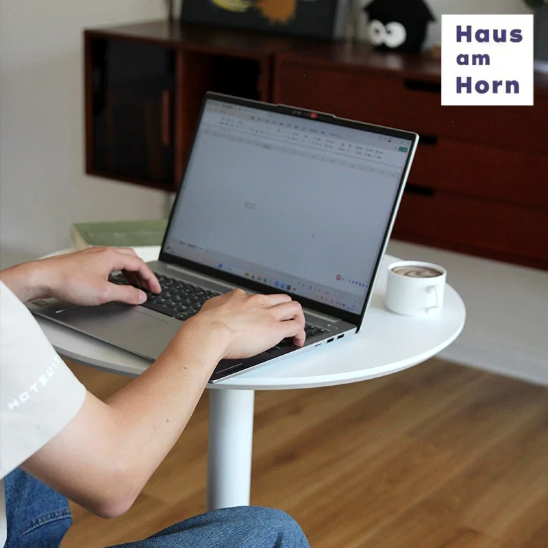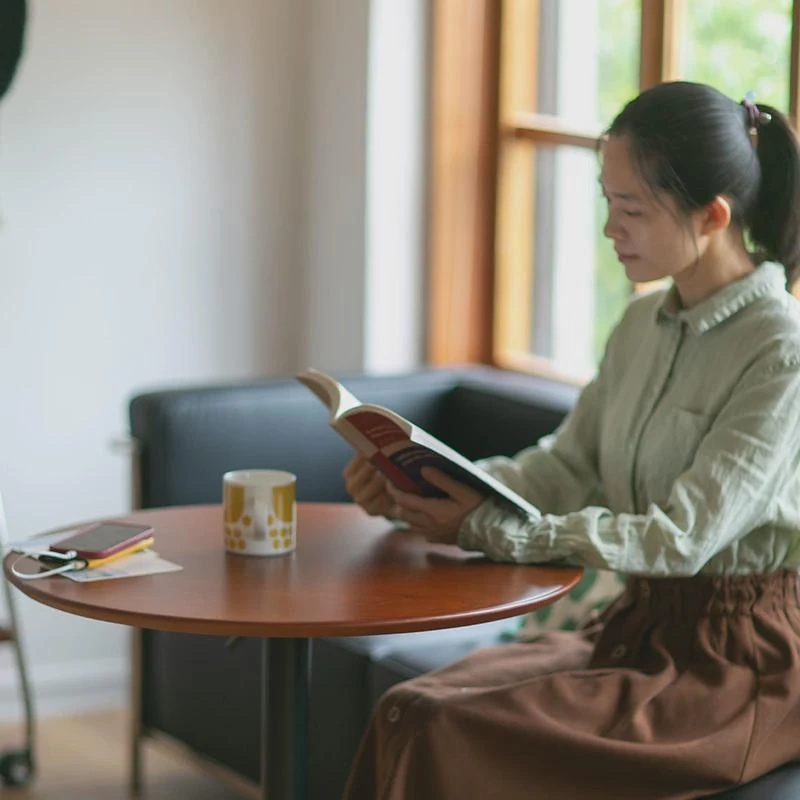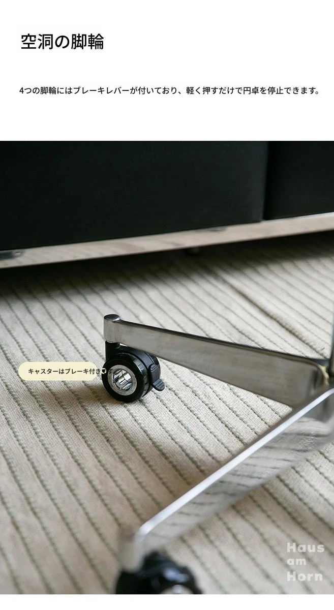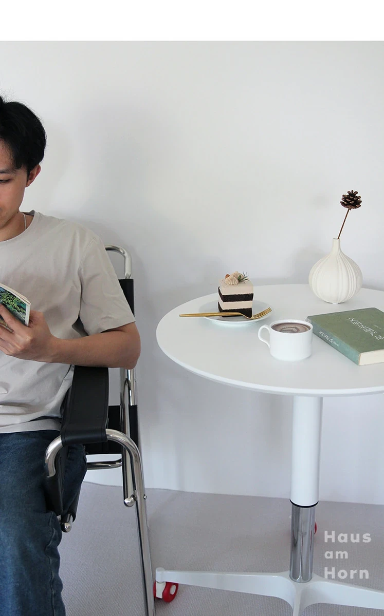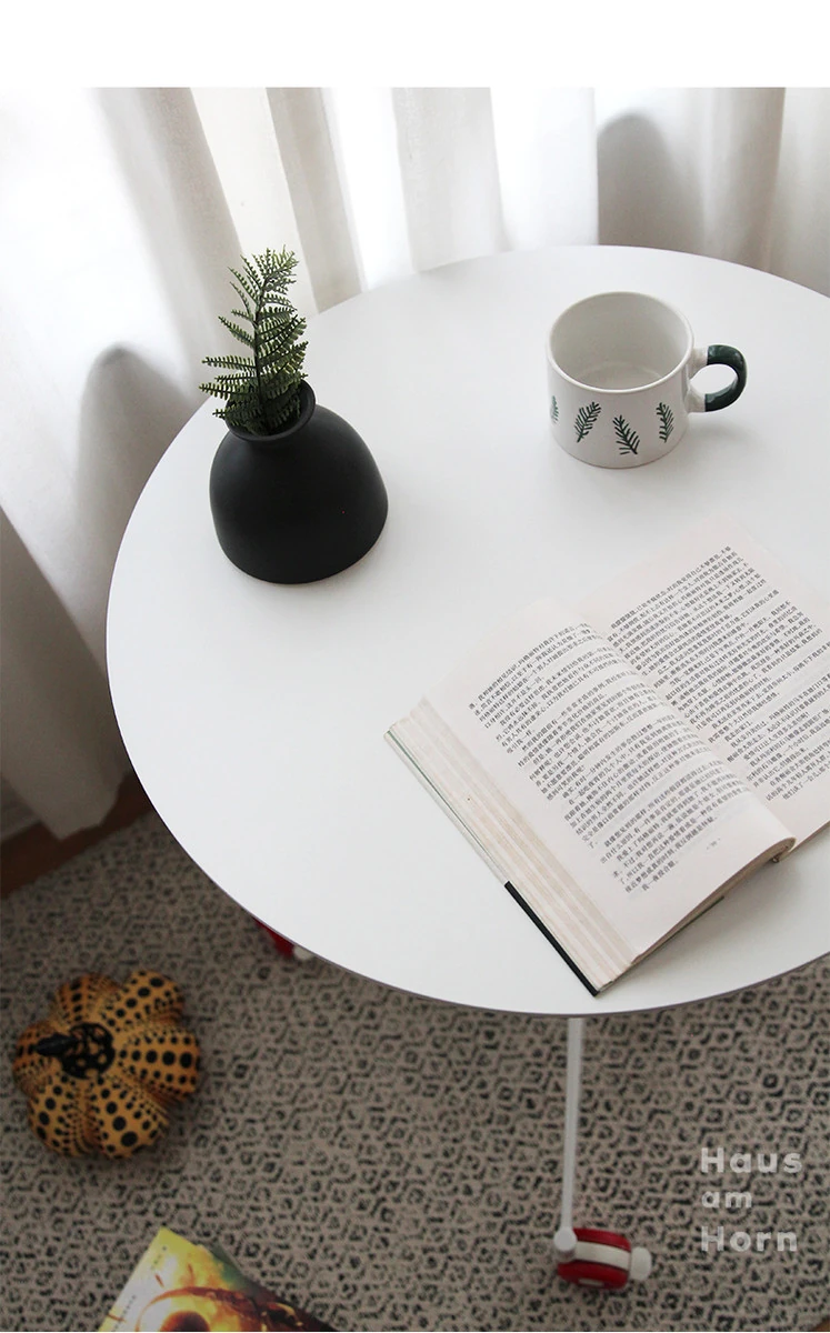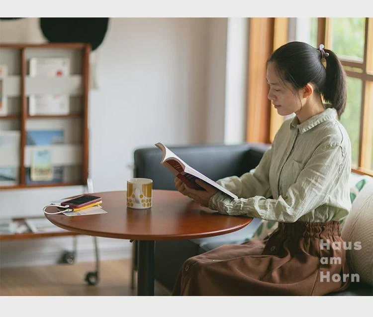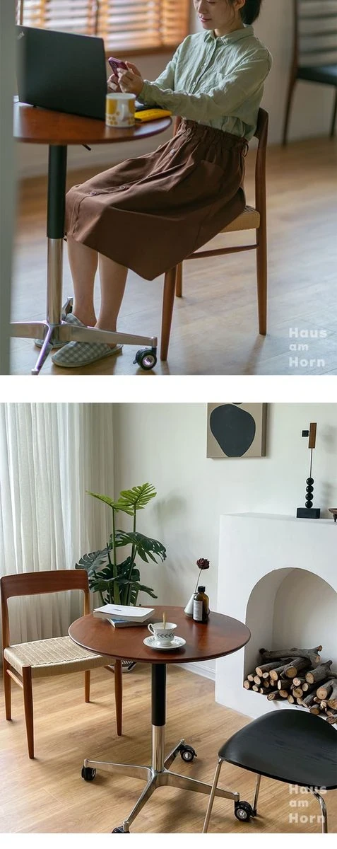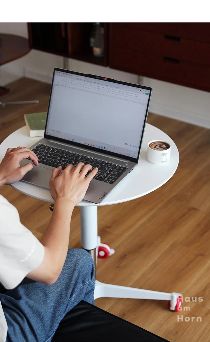 『号角屋 奥白小円卓』クリーミーな風合いの円形昇降式テーブル、移動も簡単!家庭用のリラックススペースにぴったりなサイドテーブル。