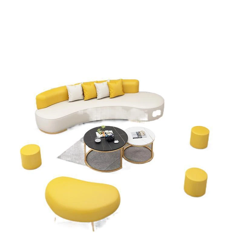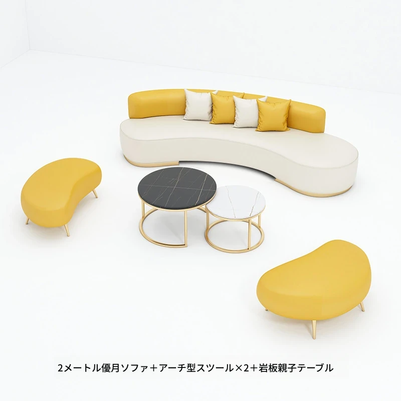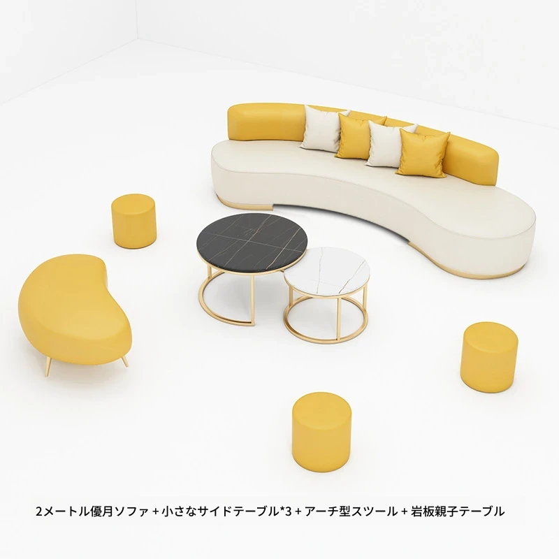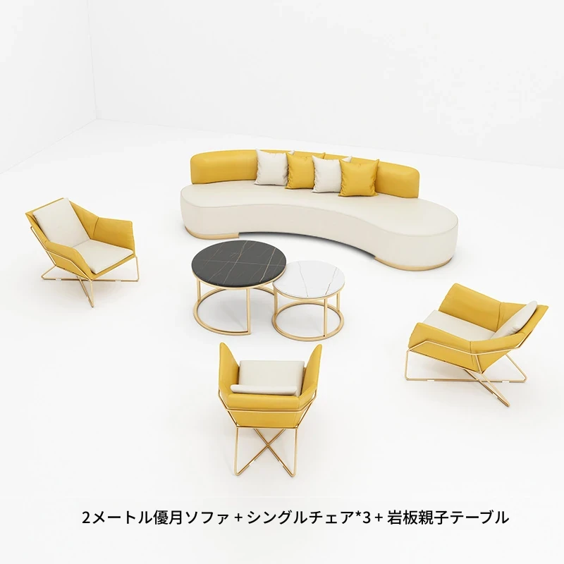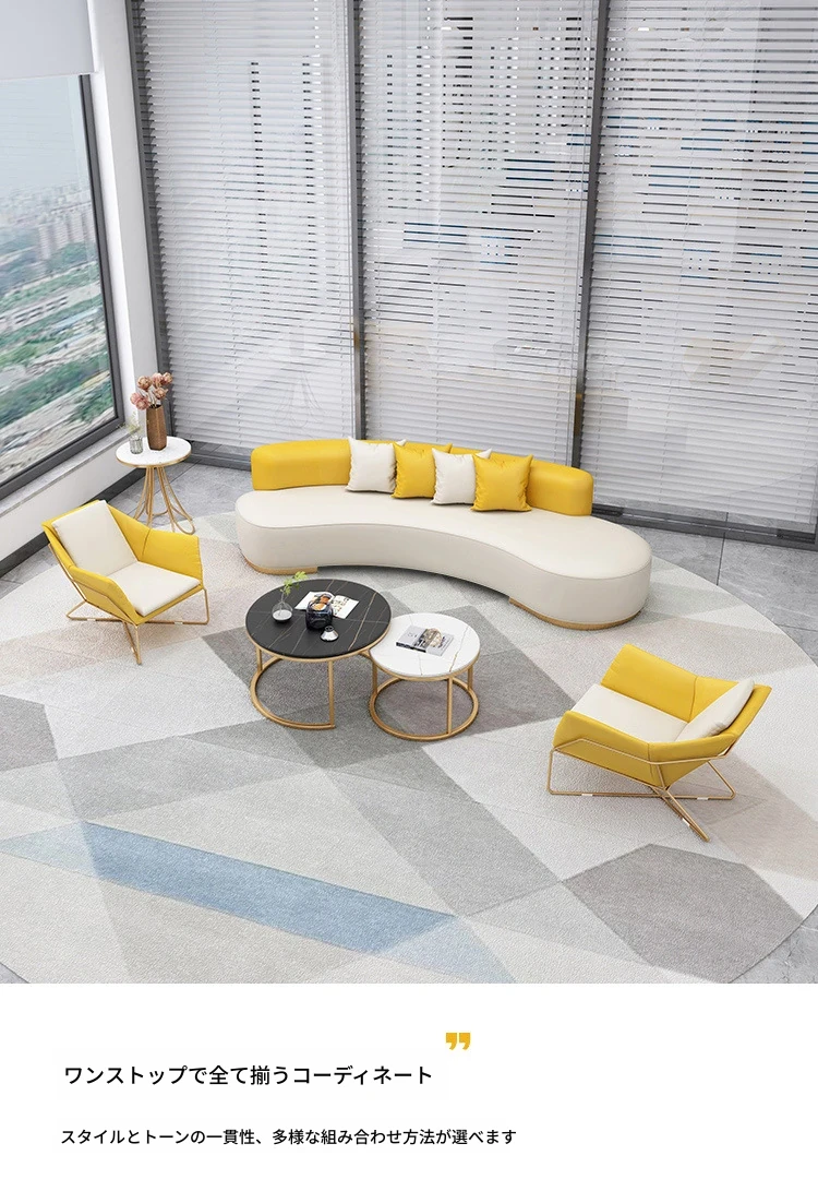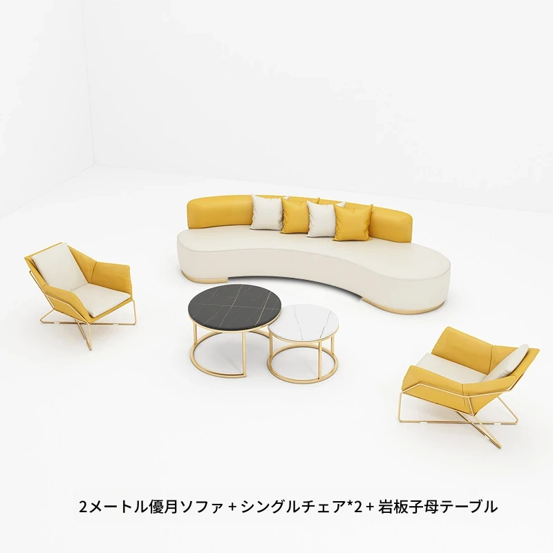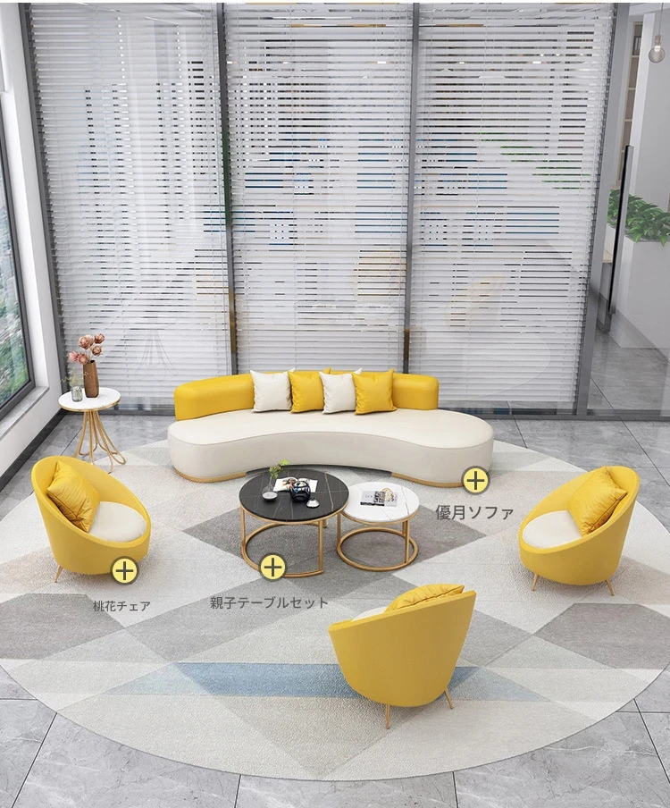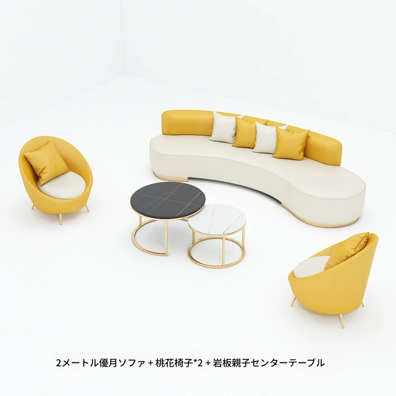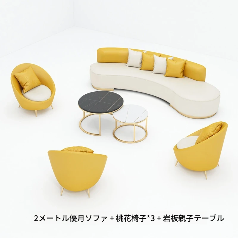 リビングルームにぴったり!優雅なアーチ型レザーソファとコーヒーテーブルのセット。ビジネスシーンにも最適な一人用ピーチフラワーラウンジチェア。ファッション店にも映える高級感あふれるレザーソファです!