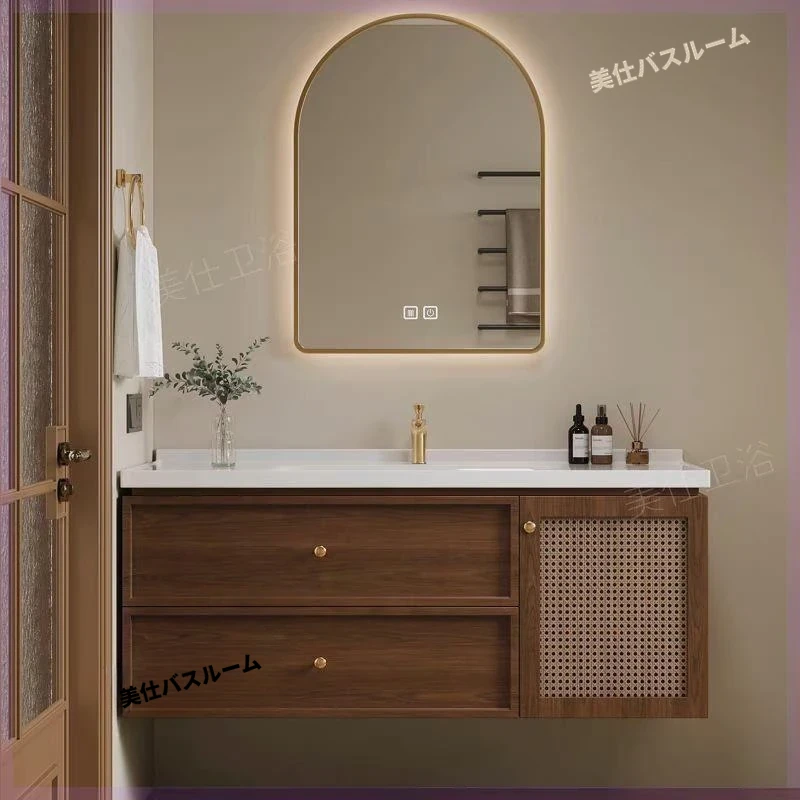 スマートミラーキャビネット+岩板熱曲げボウル-レッドオーク100cm