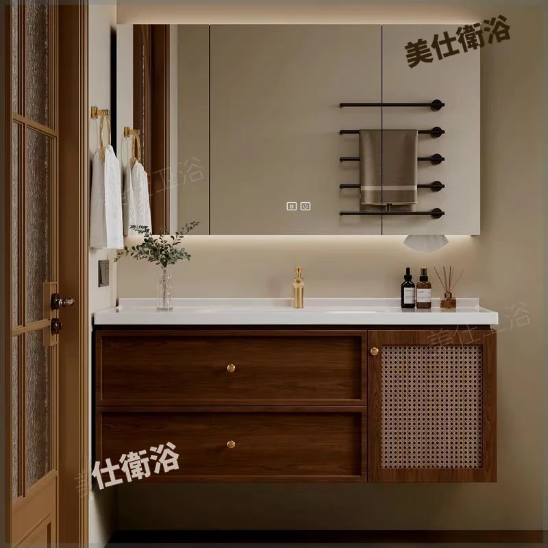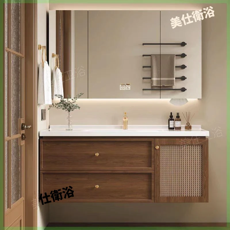 フレンチヴィンテージ風のラタン編みバスルームキャビネット - 赤オークのコンビネーション、陶器製の一体型シンク付き洗面台。おしゃれで機能的なデザインで、あなたのバスルームを美しく演出します!