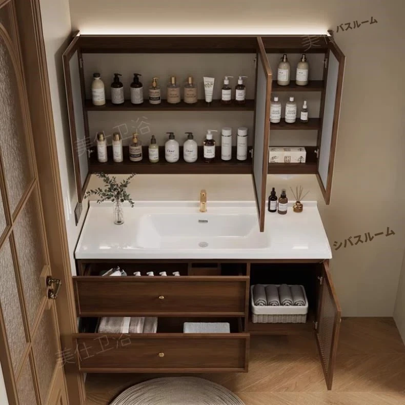 スマートミラーキャビネット+セラミック一体型ボウル-オーク90cm