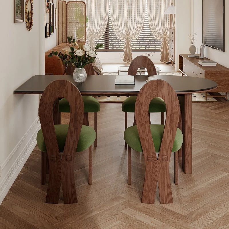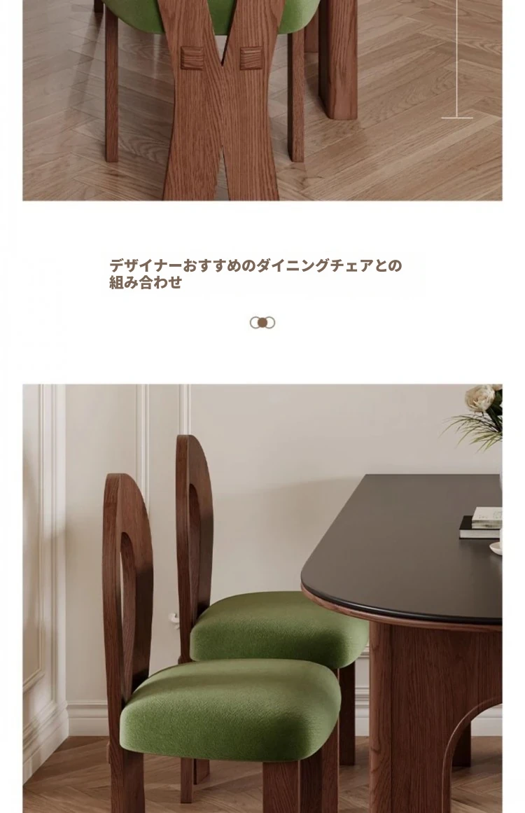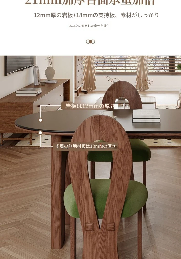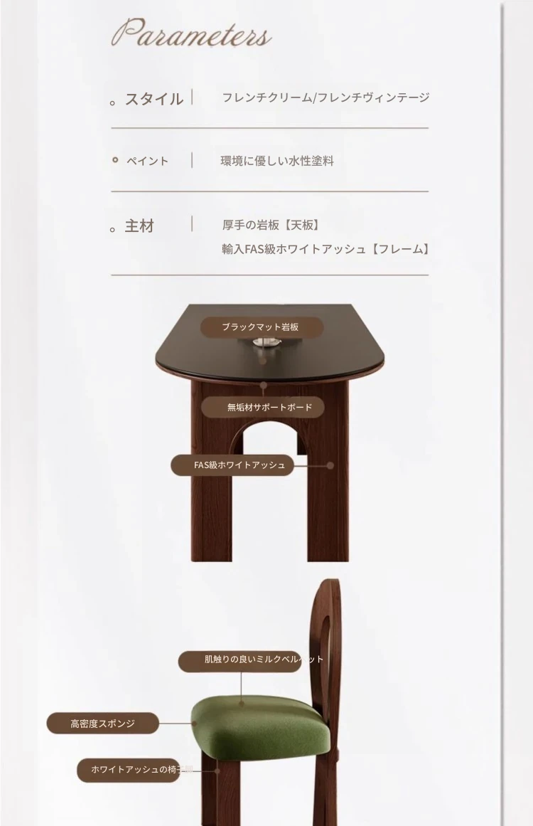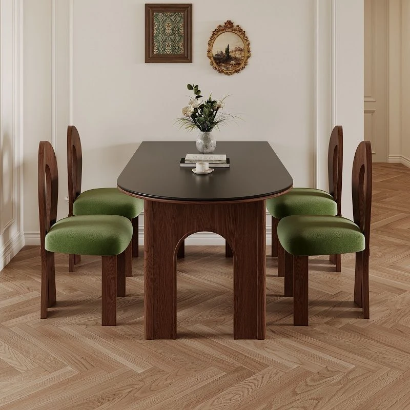 フレンチヴィンテージスタイルの壁付け半円形楕円アイランドダイニングテーブル - レトロな無垢材と岩板使用、コンパクトな小型住宅にぴったりの食卓セット!