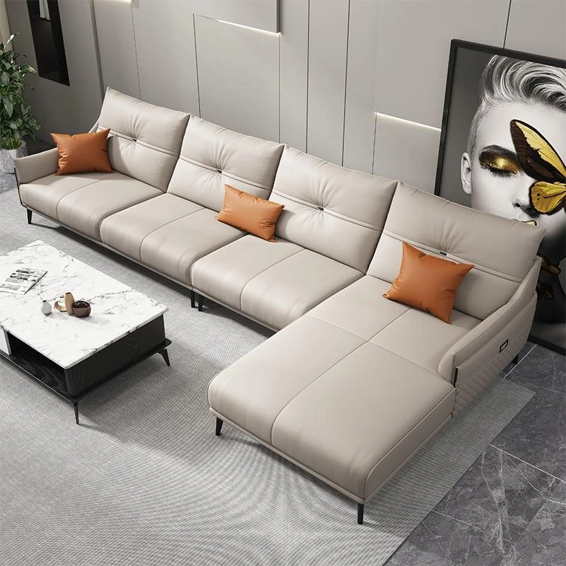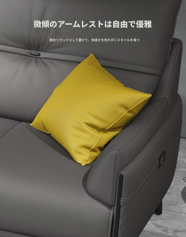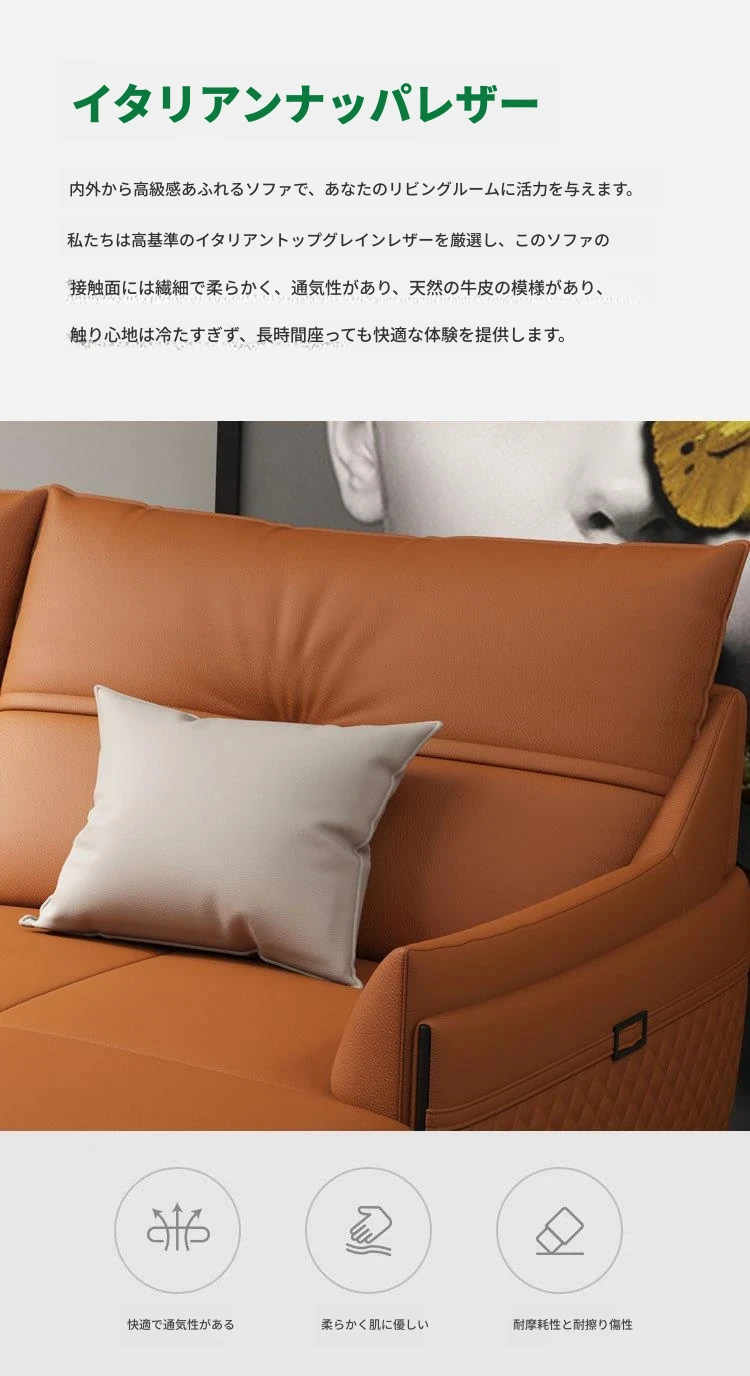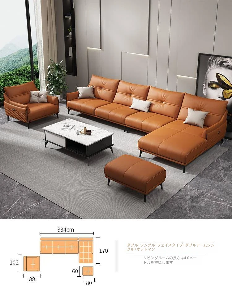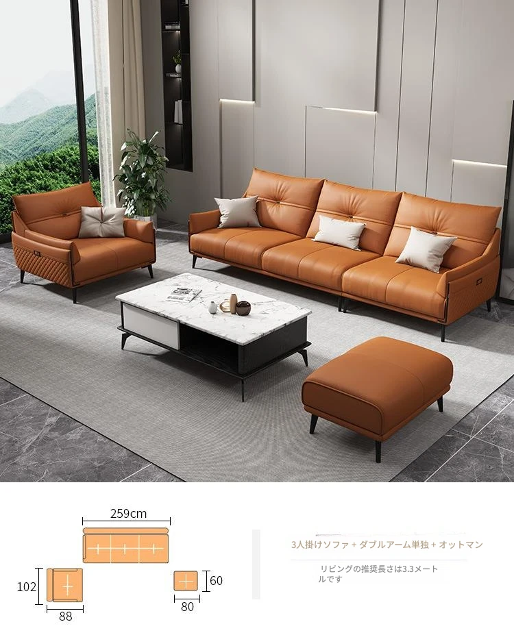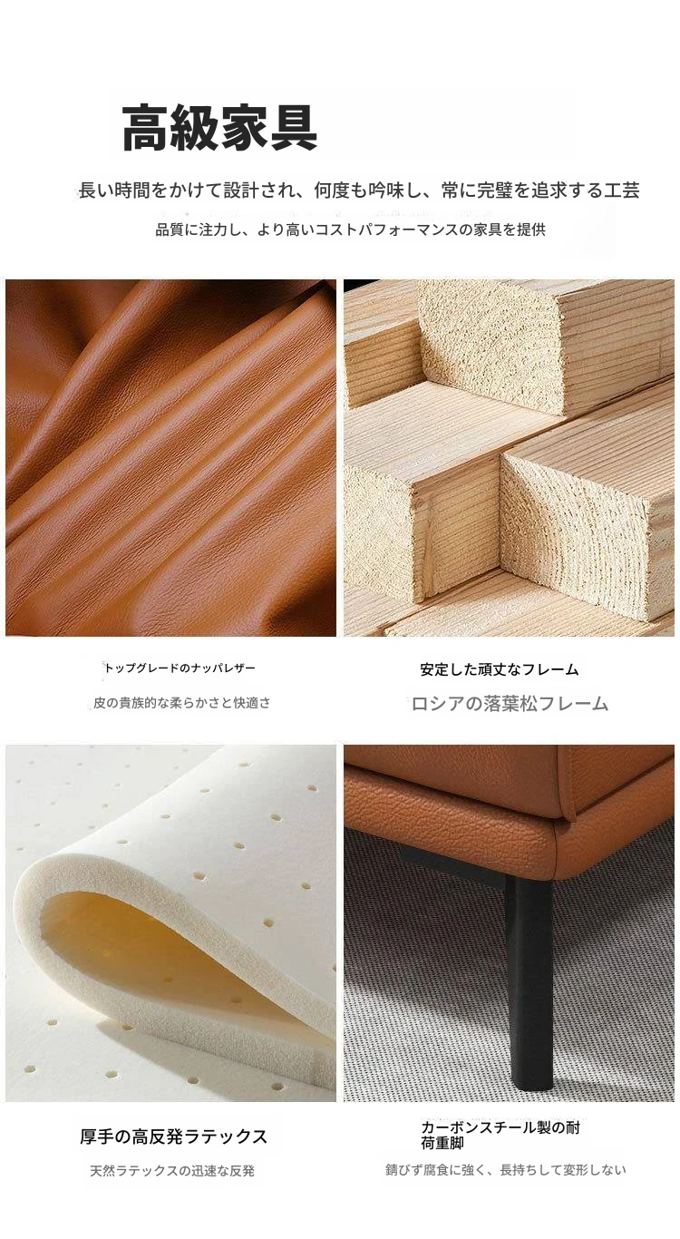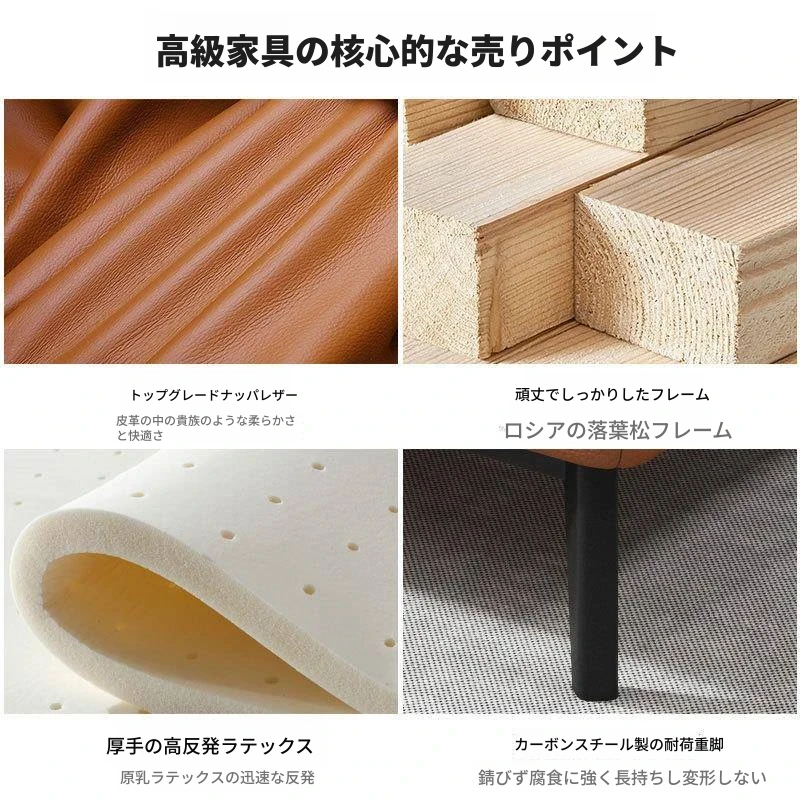 接触面本革+全実木内枠+高密度スポンジ+電鍍加工ソファ脚