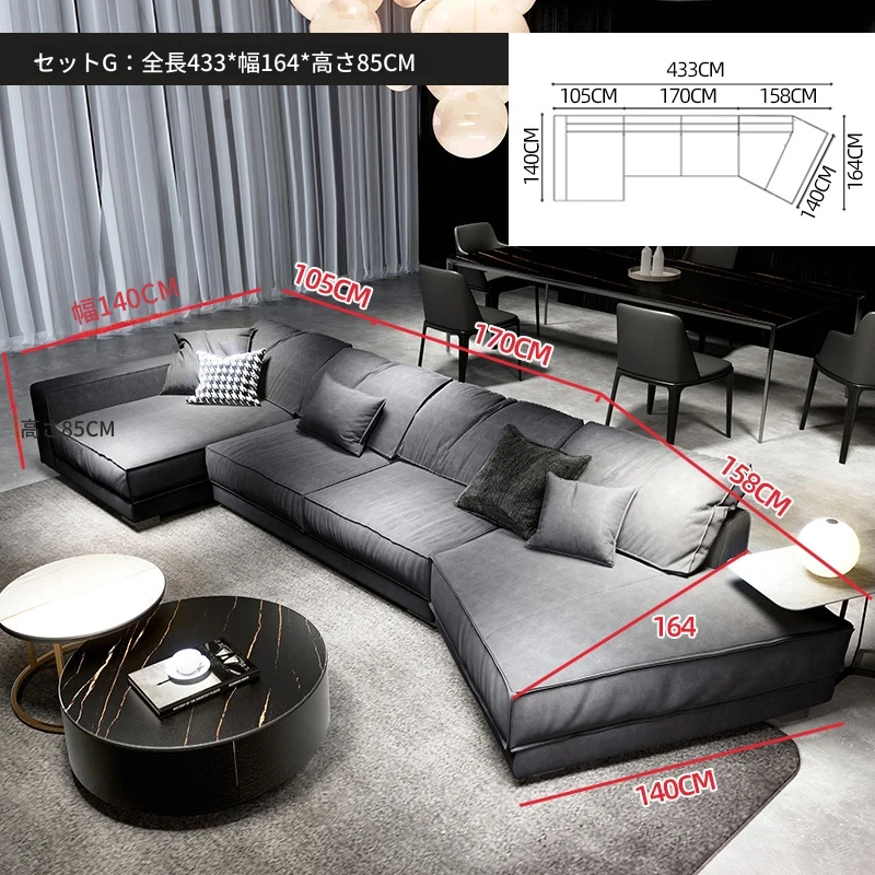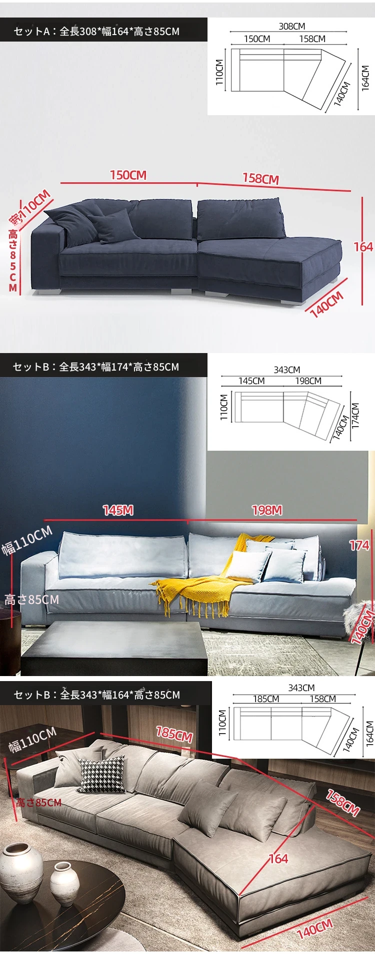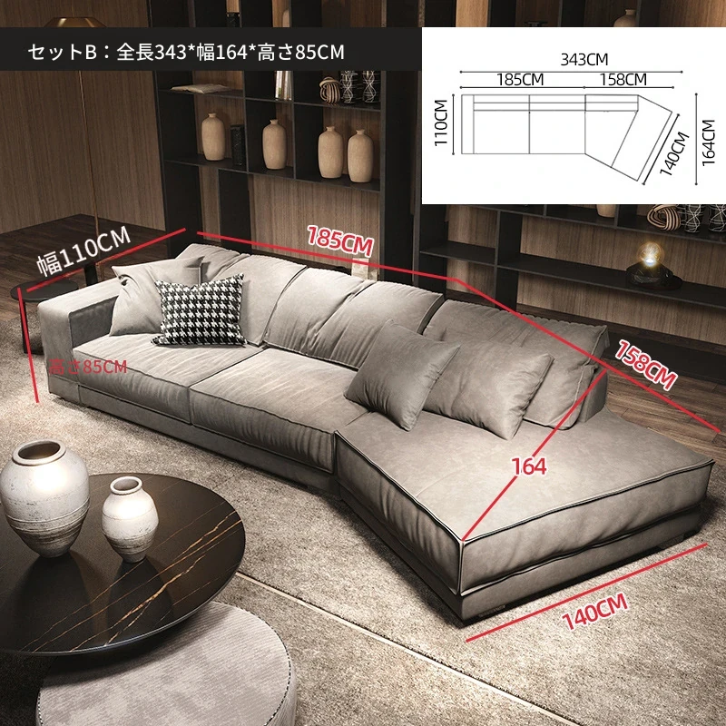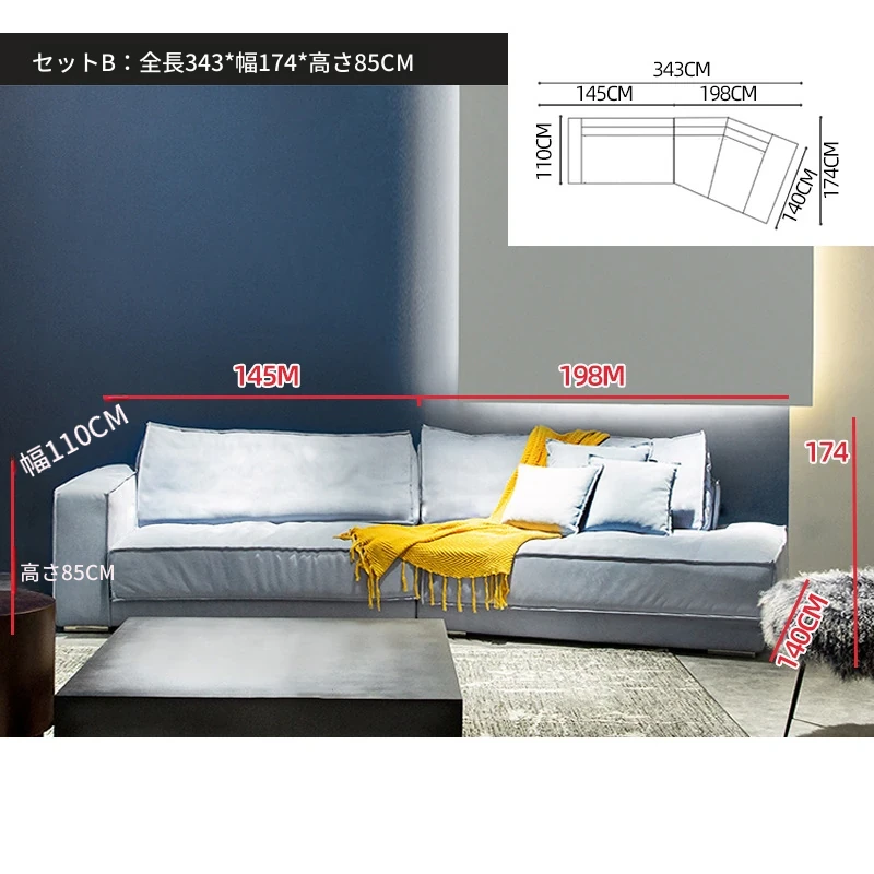 セットB:3.43メートル(直線1.85メートル(2つの座包)+コーナー1.58メートル)