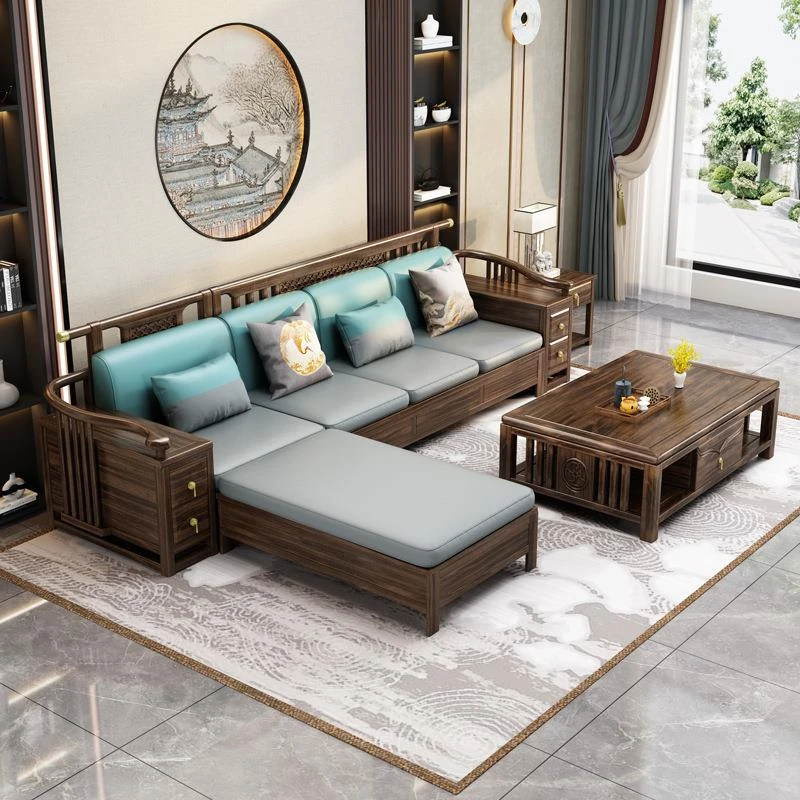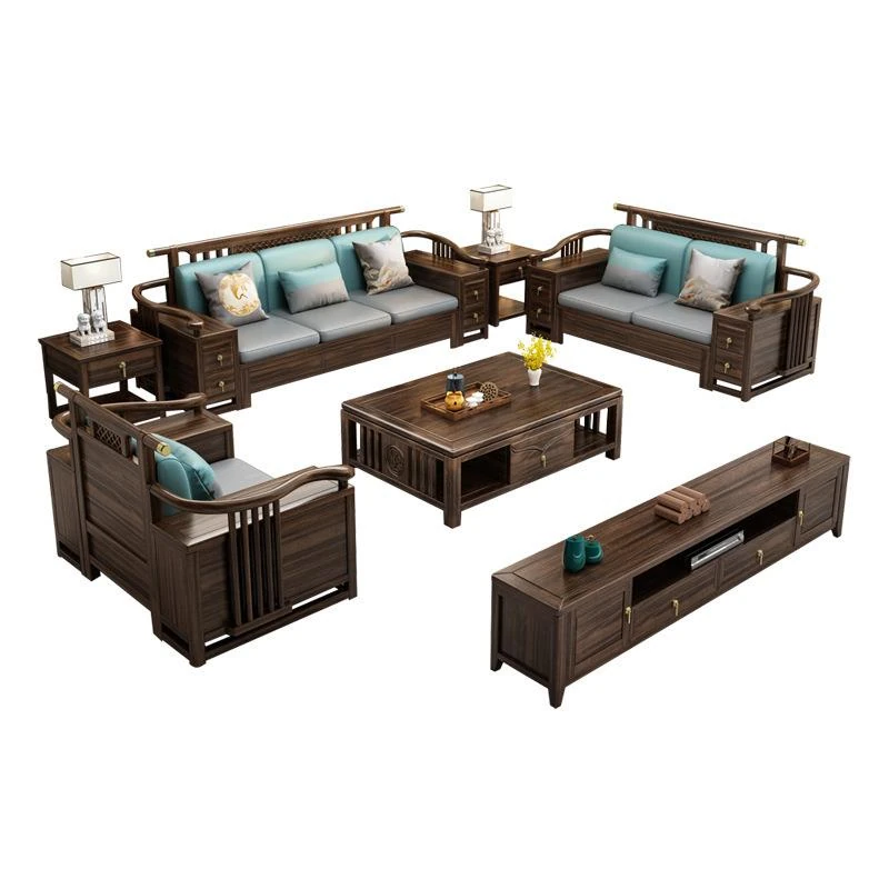 ウッディーなウコン材使用!全実木ソファセット - モダンで高級感あふれる新中式家具。リビングにぴったりなサイズ展開で、どんなお部屋にもフィット!贅沢なひとときをお楽しみください。