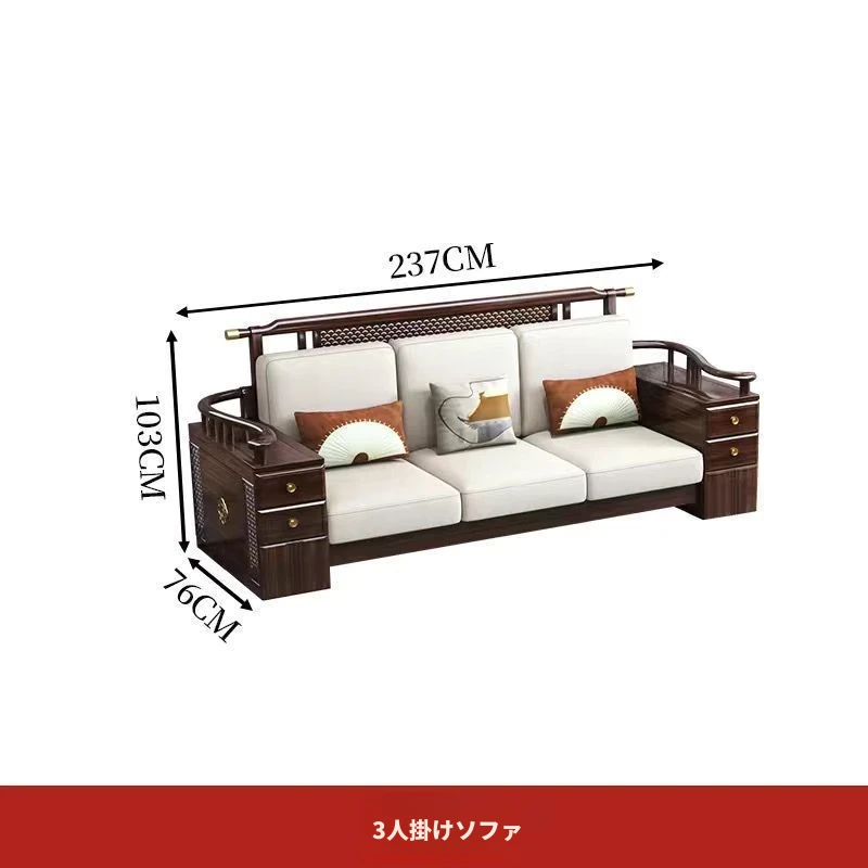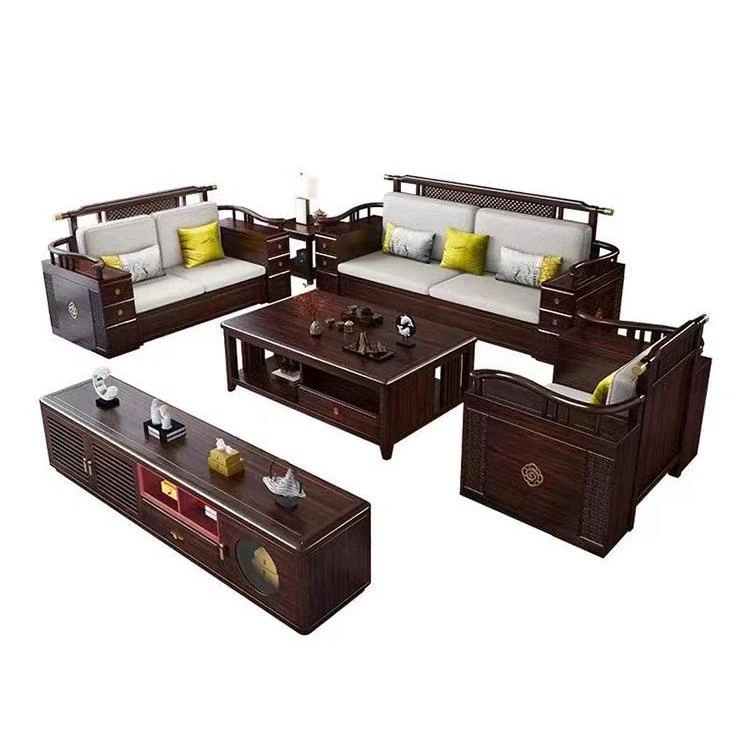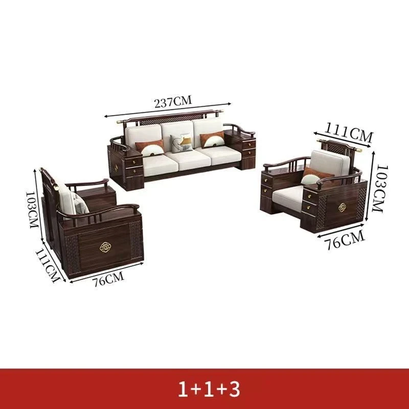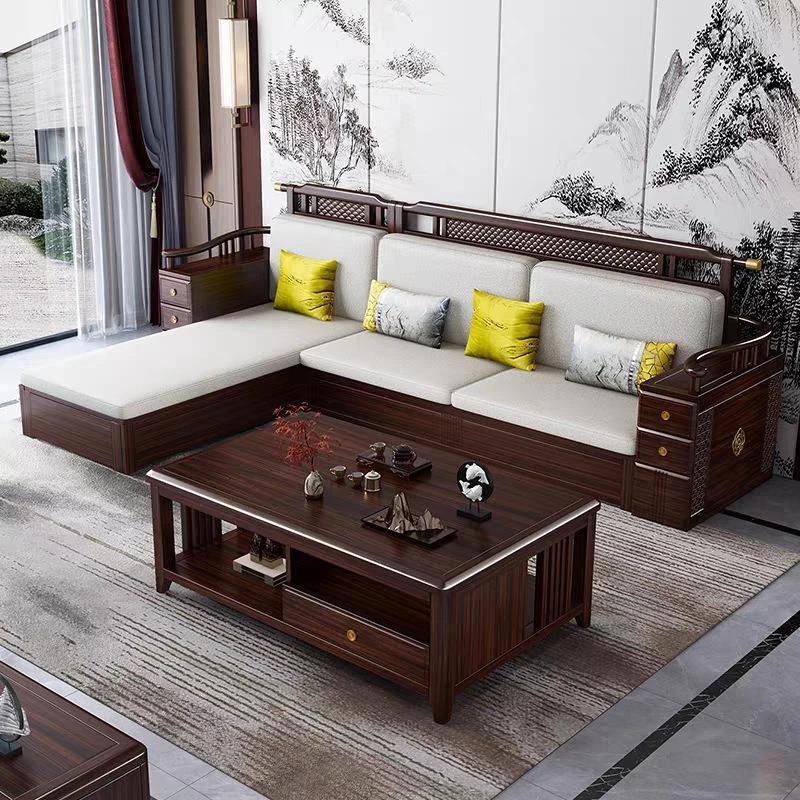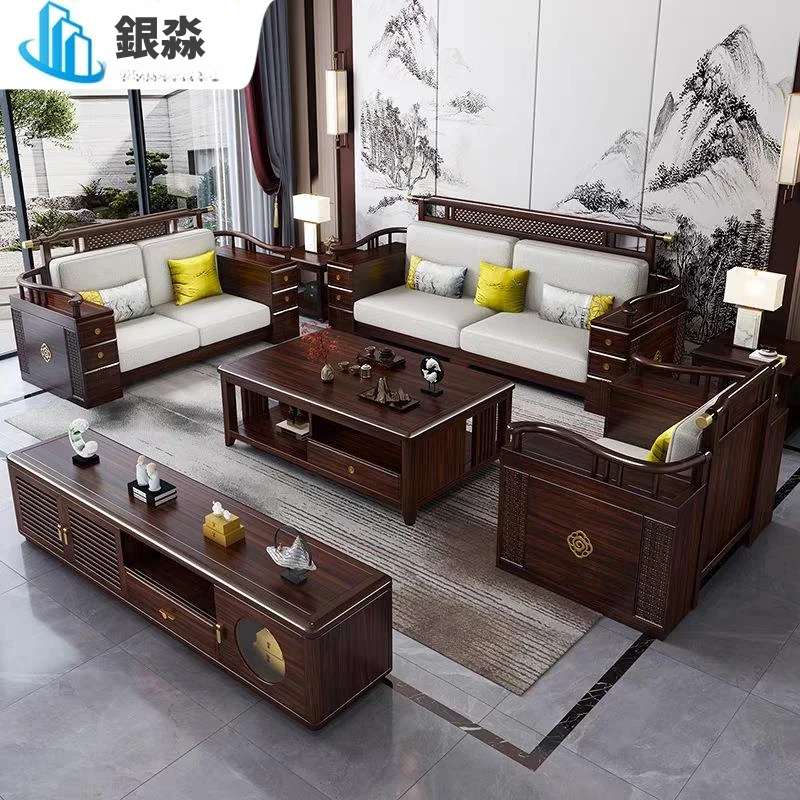 新中式ウッディウッドソファセット - 現代的なシンプルスタイル、大小様々な部屋に最適な禅の心を感じるリビング用フルセット家具。あなたの空間に優雅さと落ち着きをプラスします!