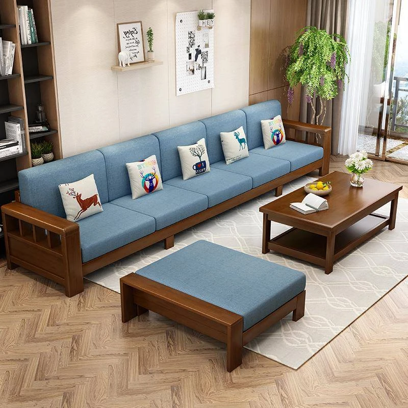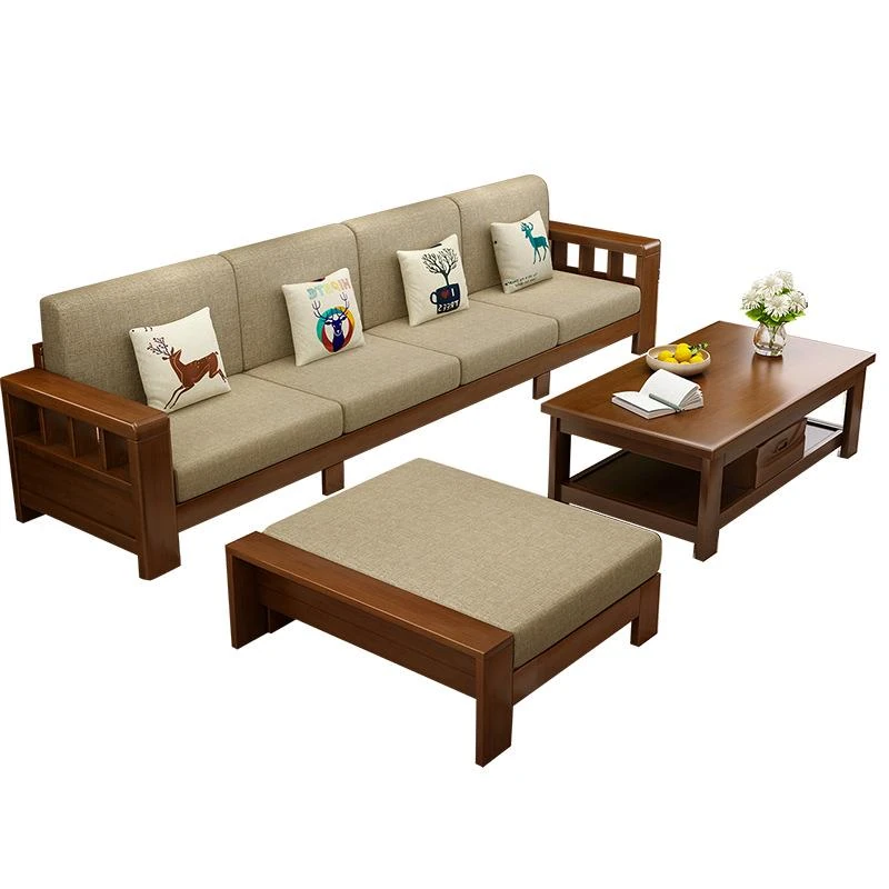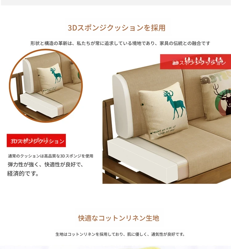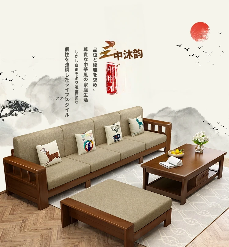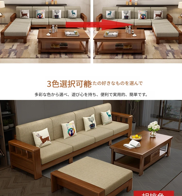 現代中式デザインの天然木製ソファセット01A - スタイリッシュなL字型布張り、リビングルームにぴったりのコンパクトサイズ!小さなお部屋にも最適な家具です。