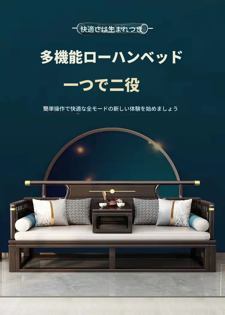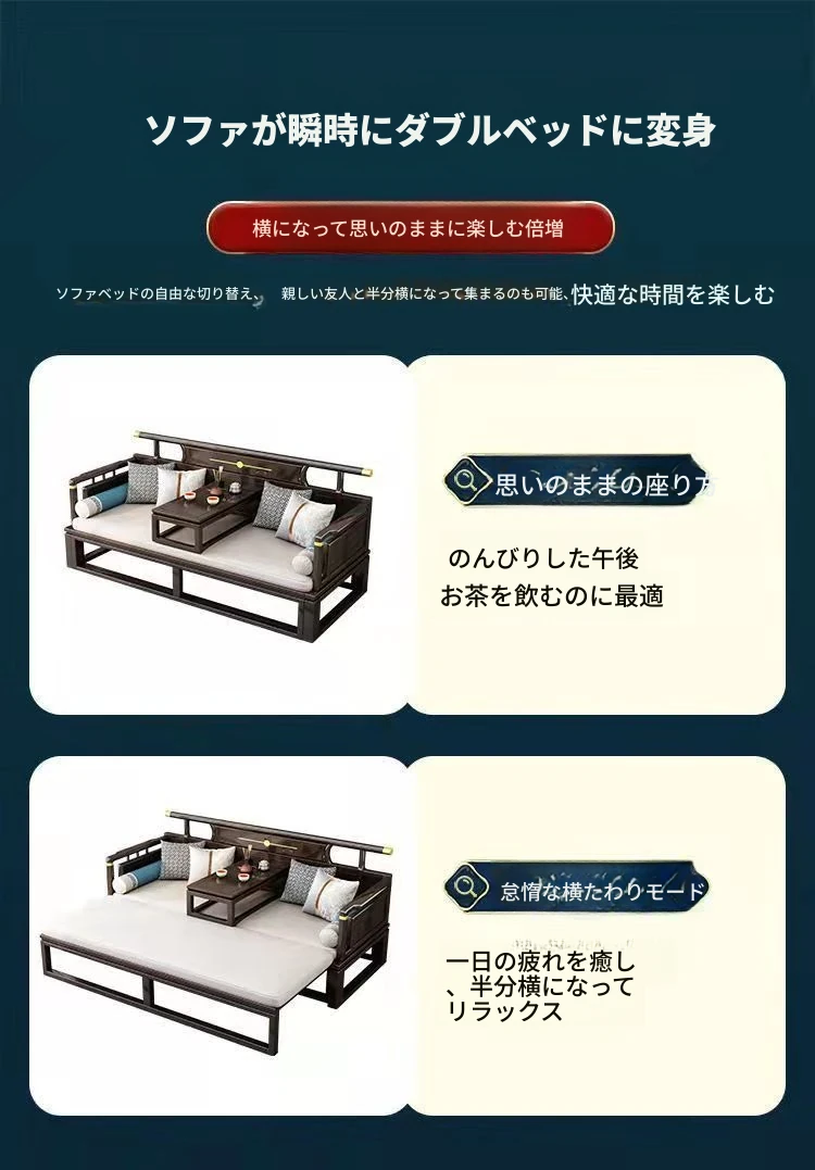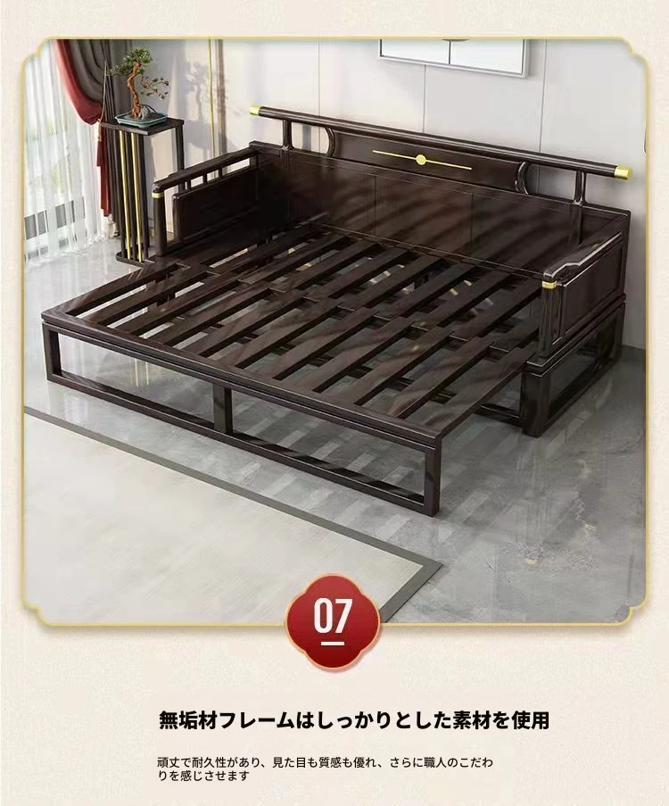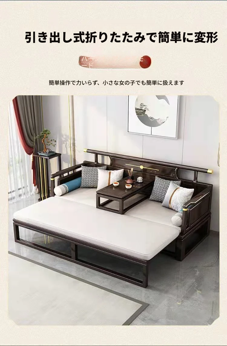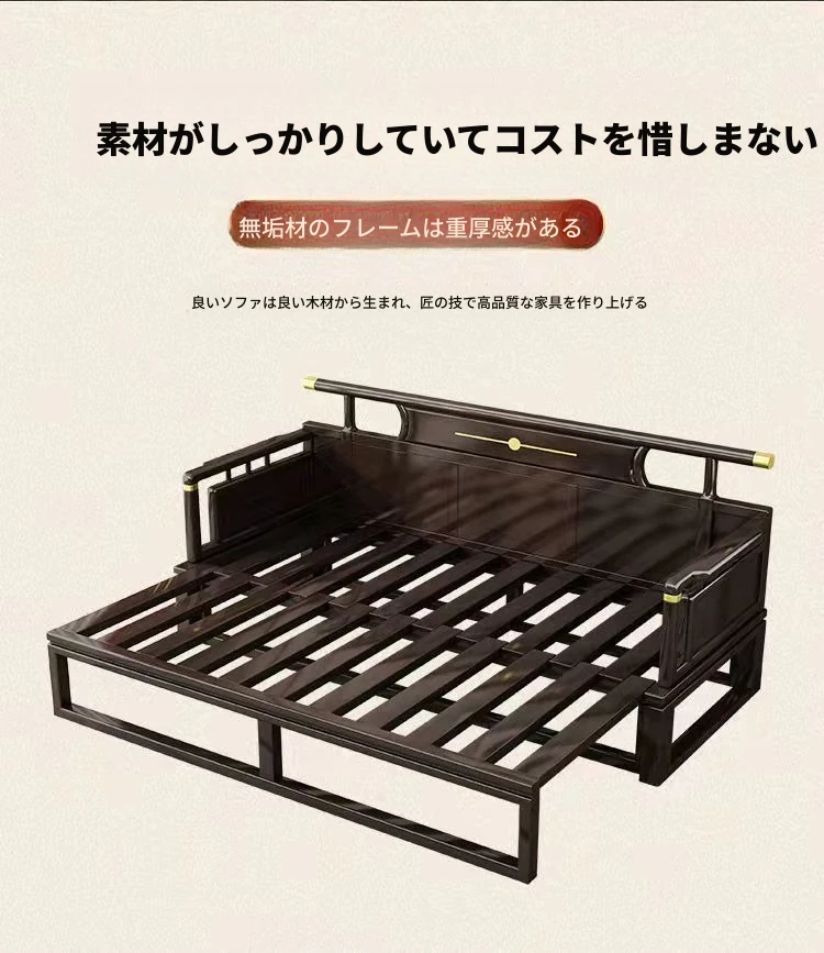 新中式スタイルの無垢材ロハンベッド - リビングや家庭に最適!コンパクトなサイズで、シンプルな伸縮式デザインのソファベッド。多機能で使いやすく、どんなお部屋にもマッチします!