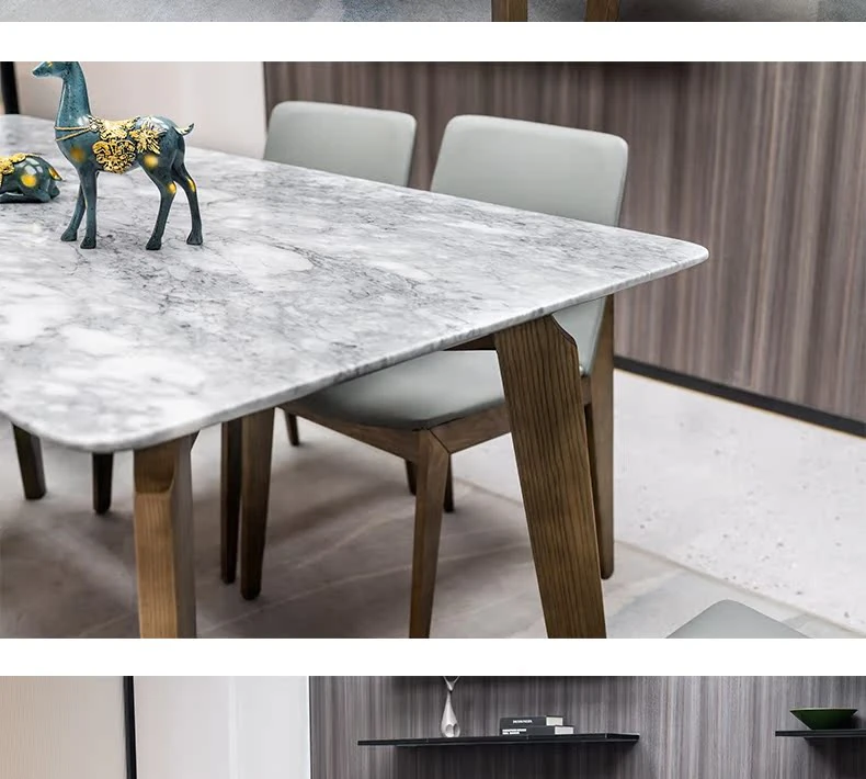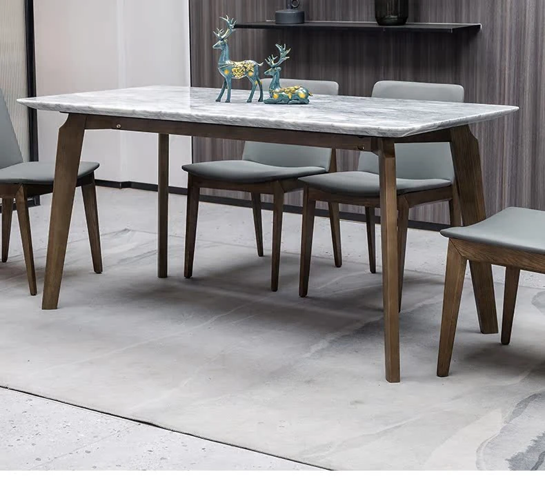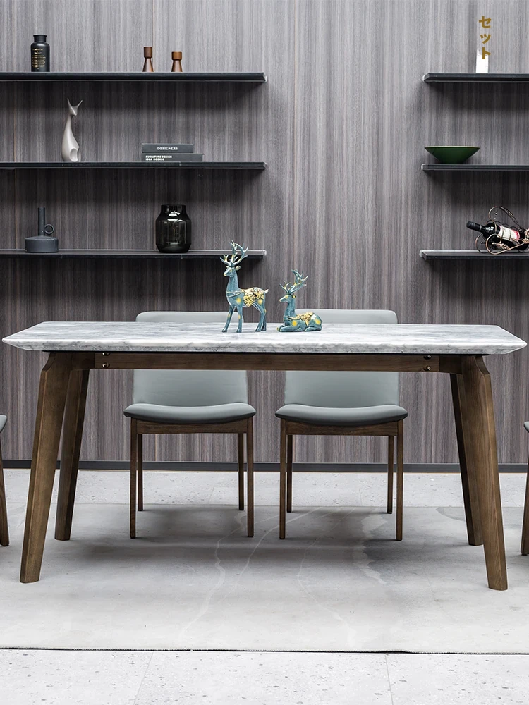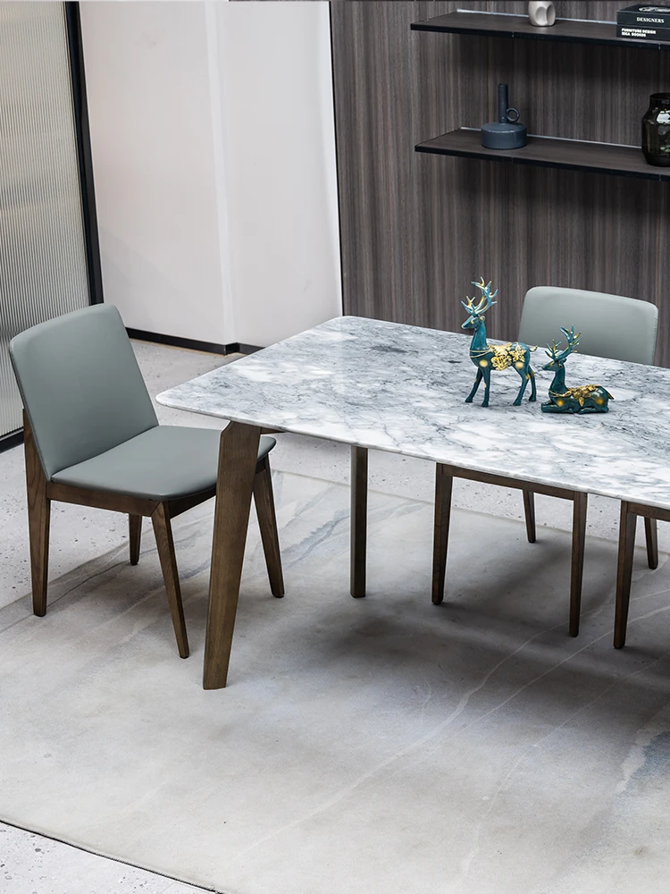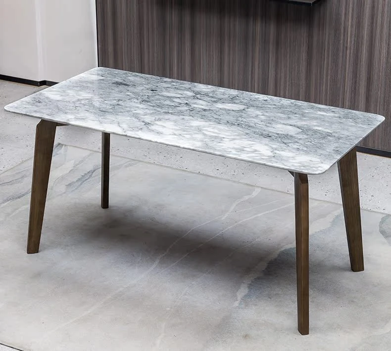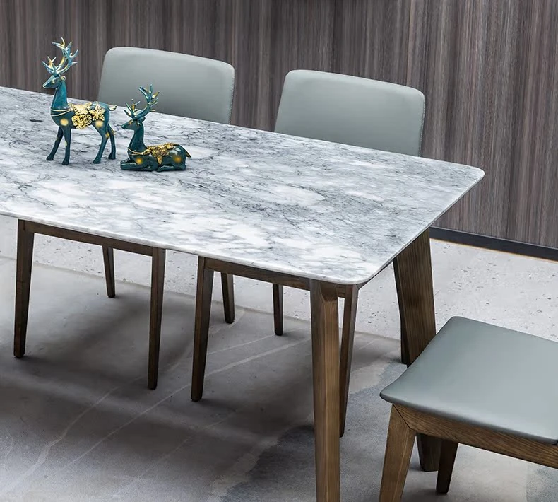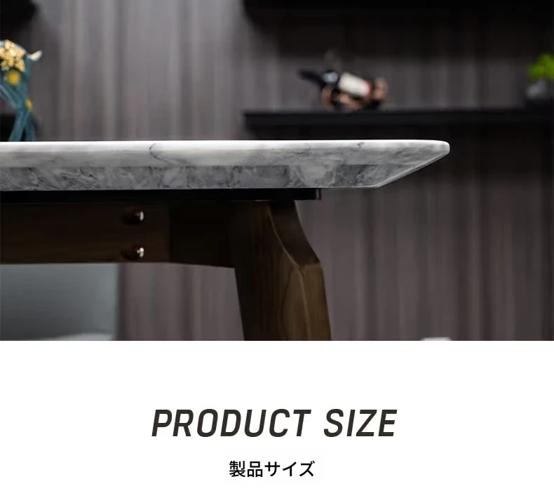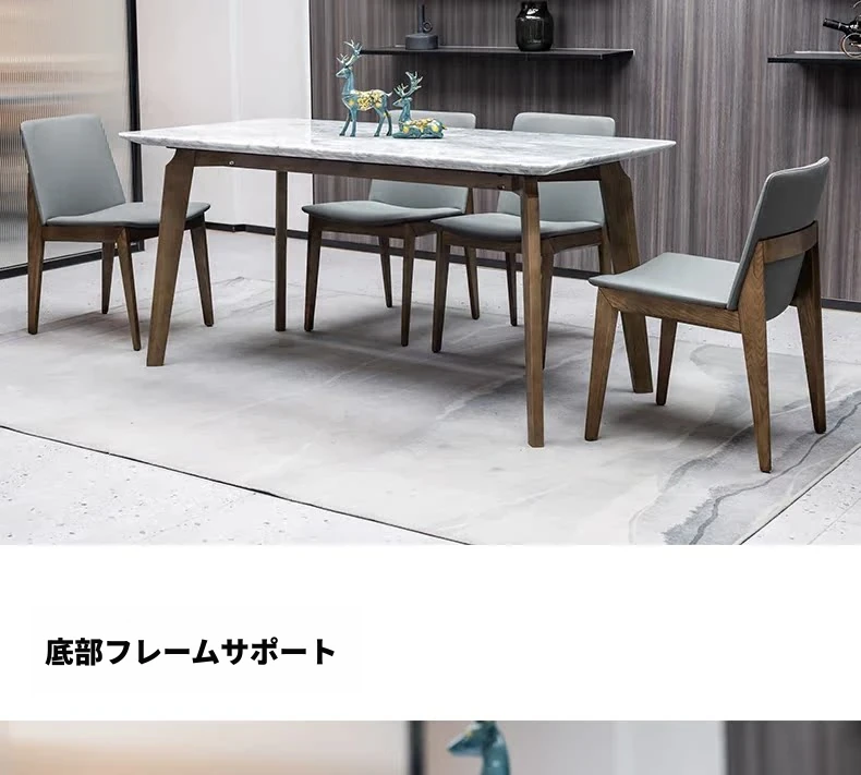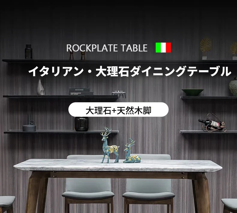 イタリアンスタイルの天然石ダイニングテーブル|モダンでシンプルなデザイン、軽やかなラグジュアリー感|狭いお部屋にもぴったりな長方形の大理石テーブルと木製チェアのコンビネーション