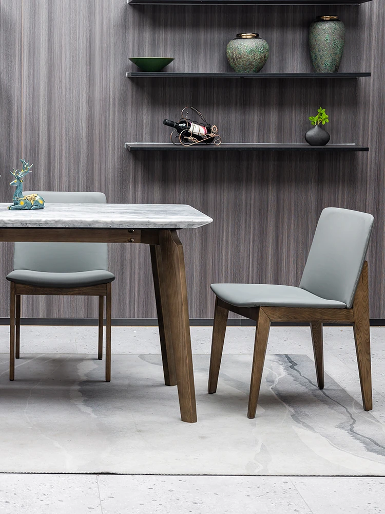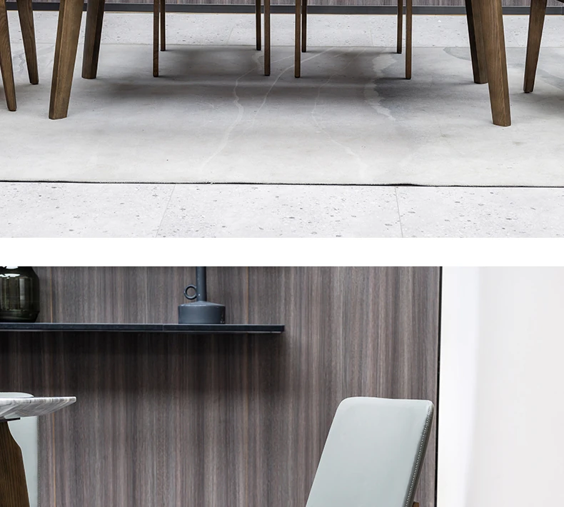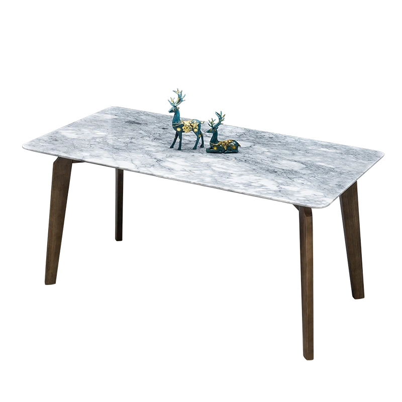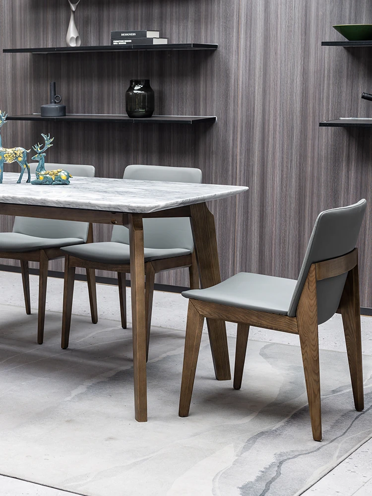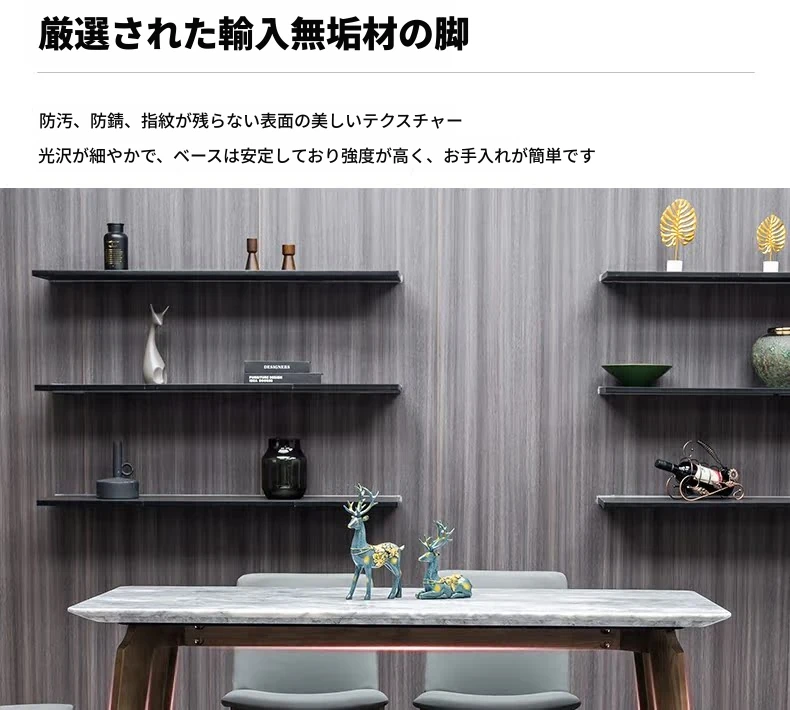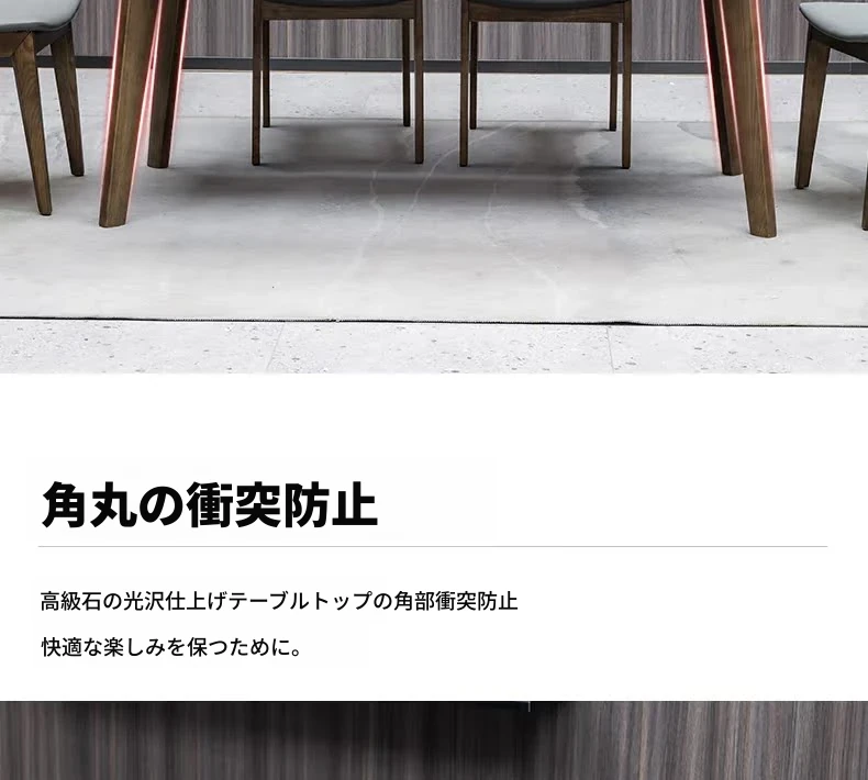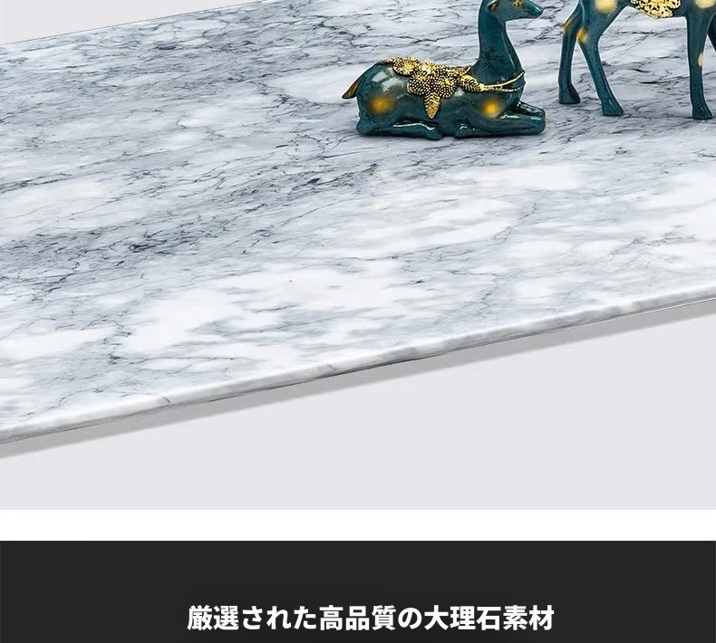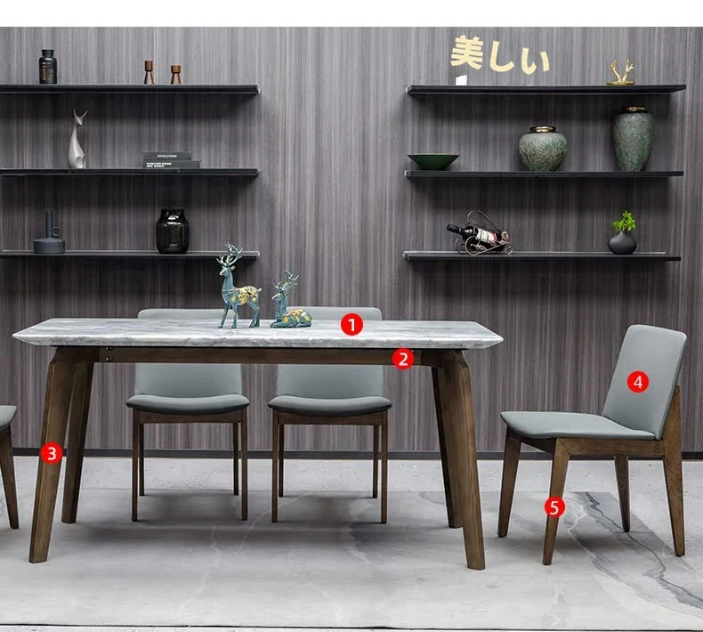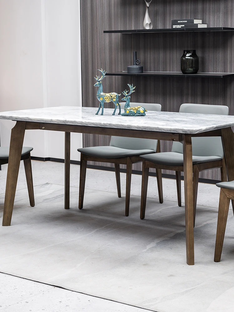 イタリアンスタイルの天然石ダイニングテーブル|モダンでシンプルなデザイン、軽やかなラグジュアリー感|狭いお部屋にもぴったりな長方形の大理石テーブルと木製チェアのコンビネーション
