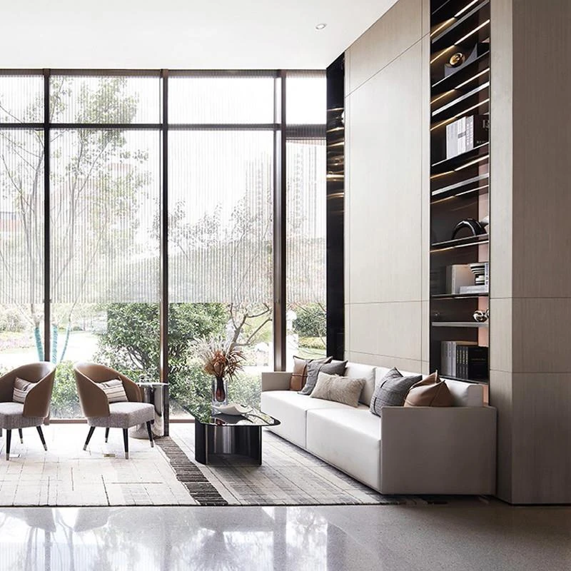 現代的でシンプルなラグジュアリー、モデルルームに最適なリビング家具。販売オフィスやホテルでの商談・接待にも最適なソファセットで、居心地の良い休息空間を演出します。