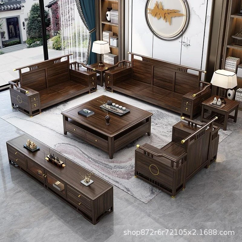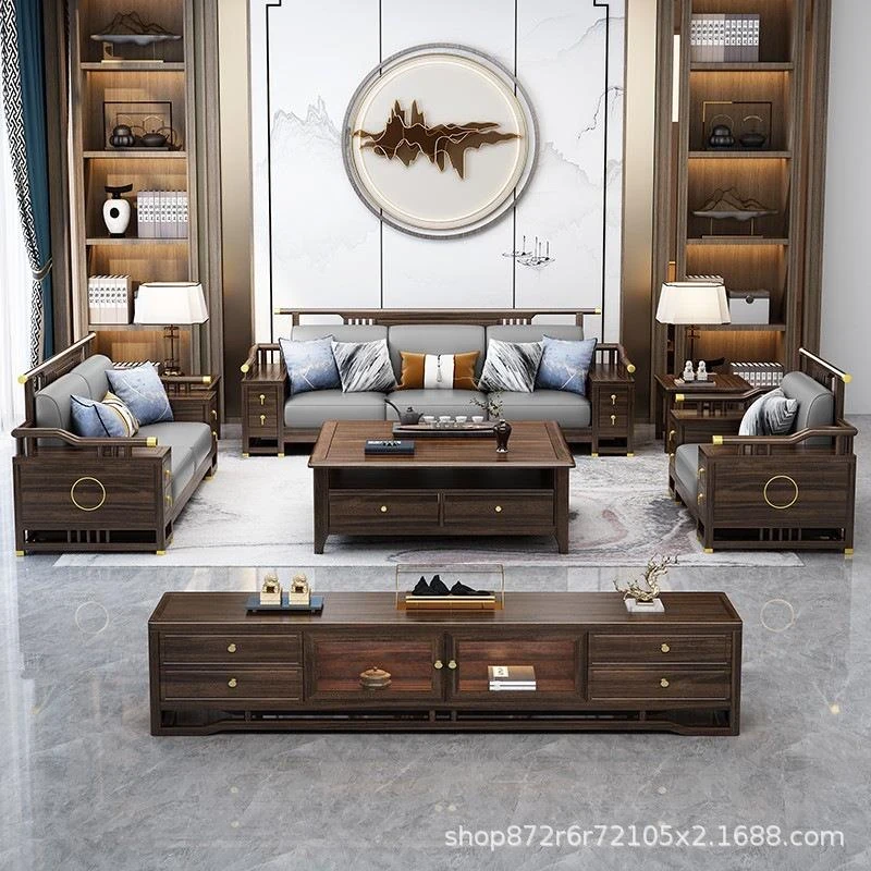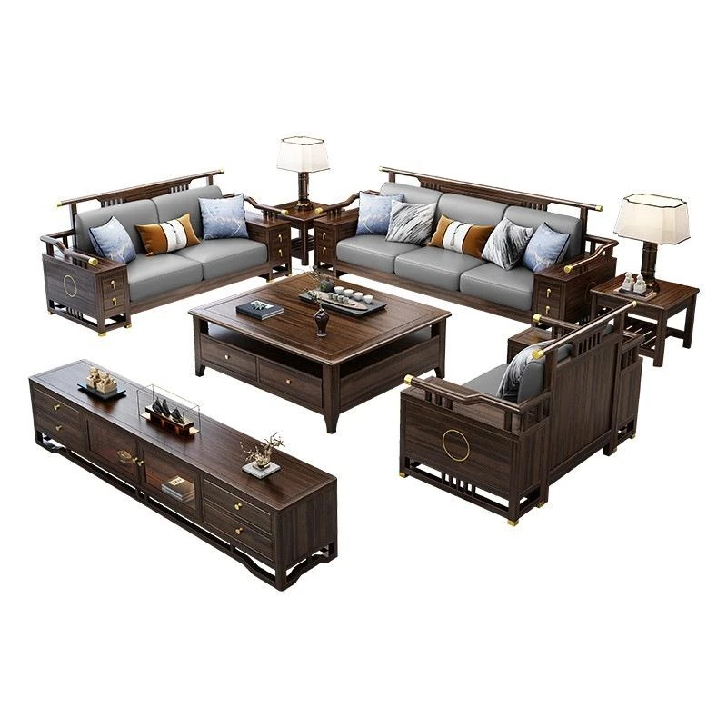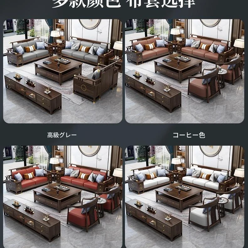 新中式ウッドソファセット - ウー金木製、モダンでシンプルなデザイン、大小様々な部屋にぴったりなラグジュアリー感漂う布張りのリビングセット。心地よい空間を演出します!