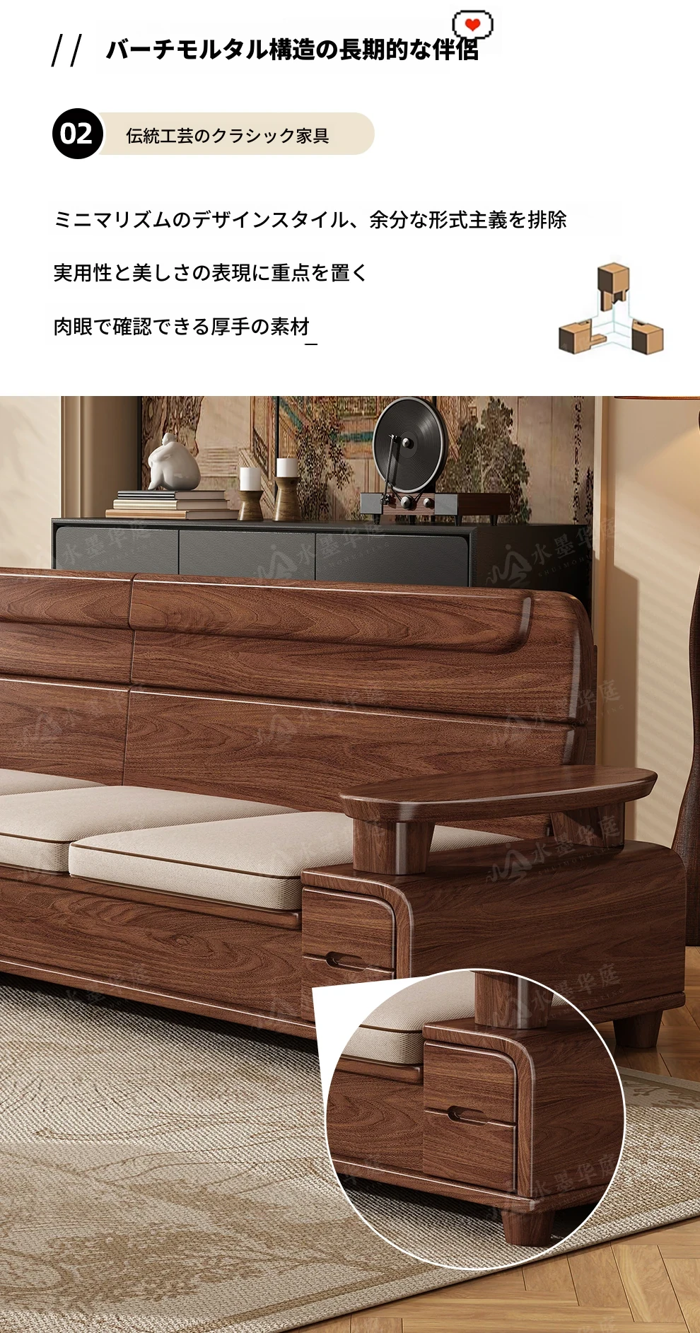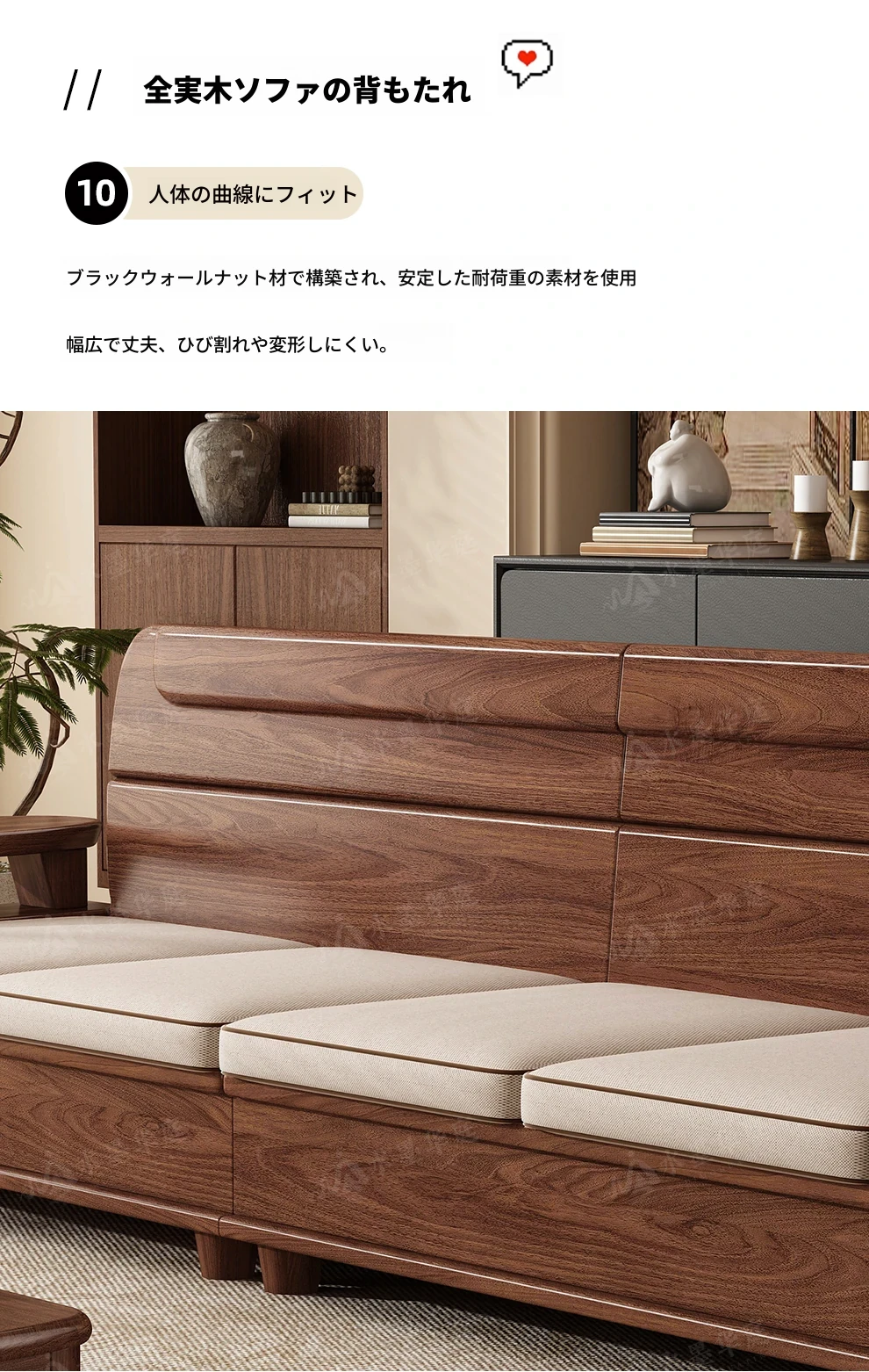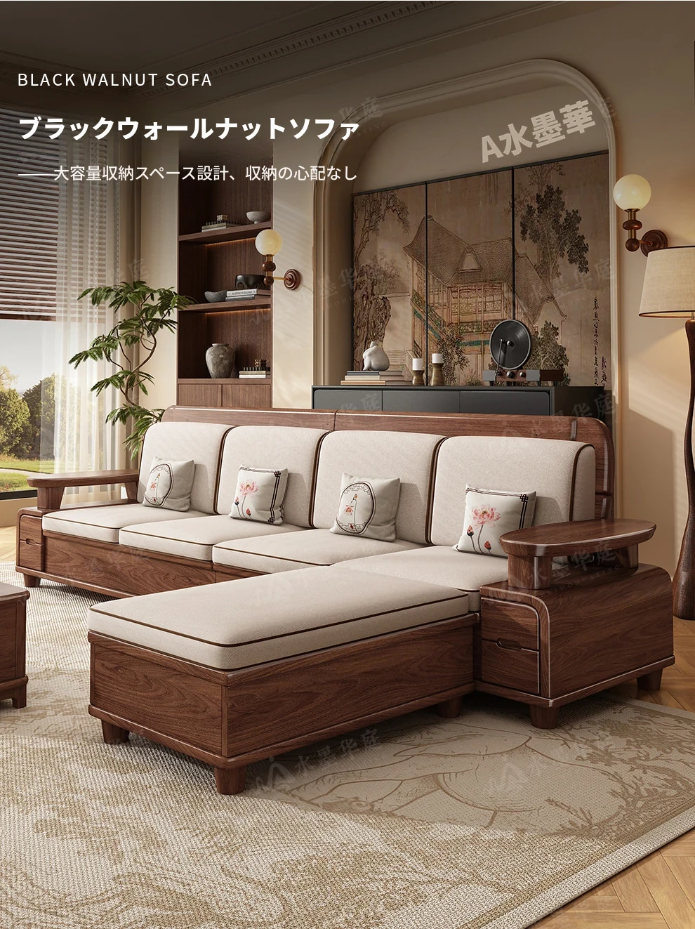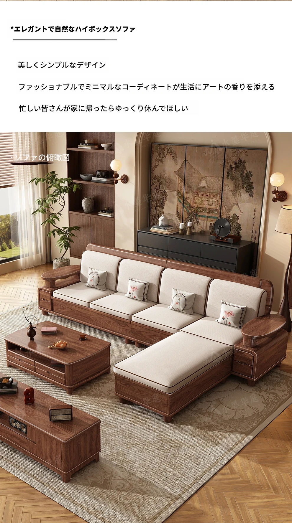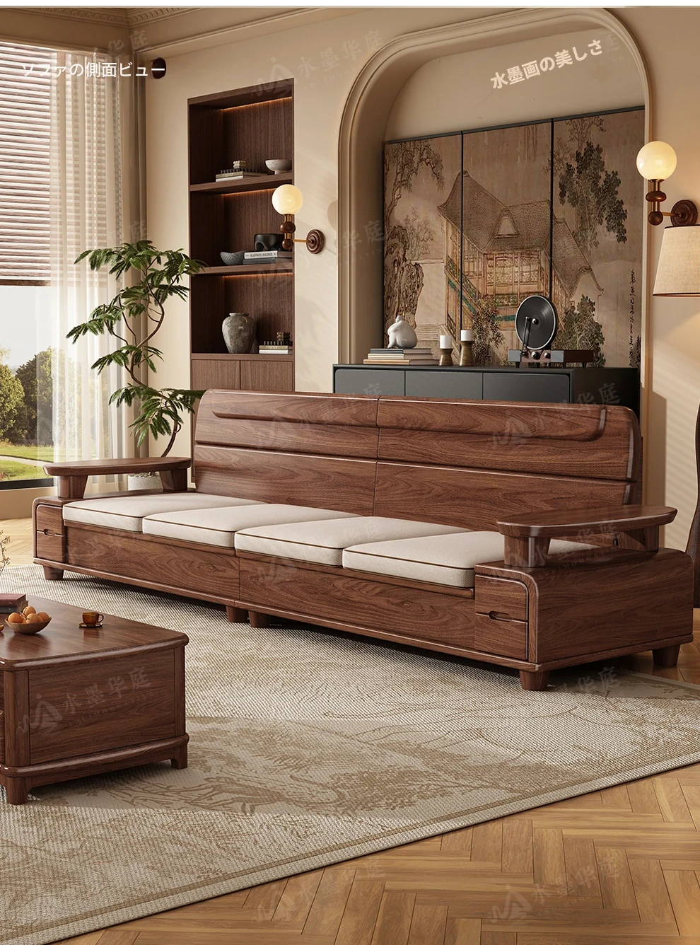 新中式スタイルのブラックウォールナット無垢材ソファー|コンパクトな高箱デザインで小さなリビングにも最適!モダンでシンプルな家具、洗練された空間を演出します。