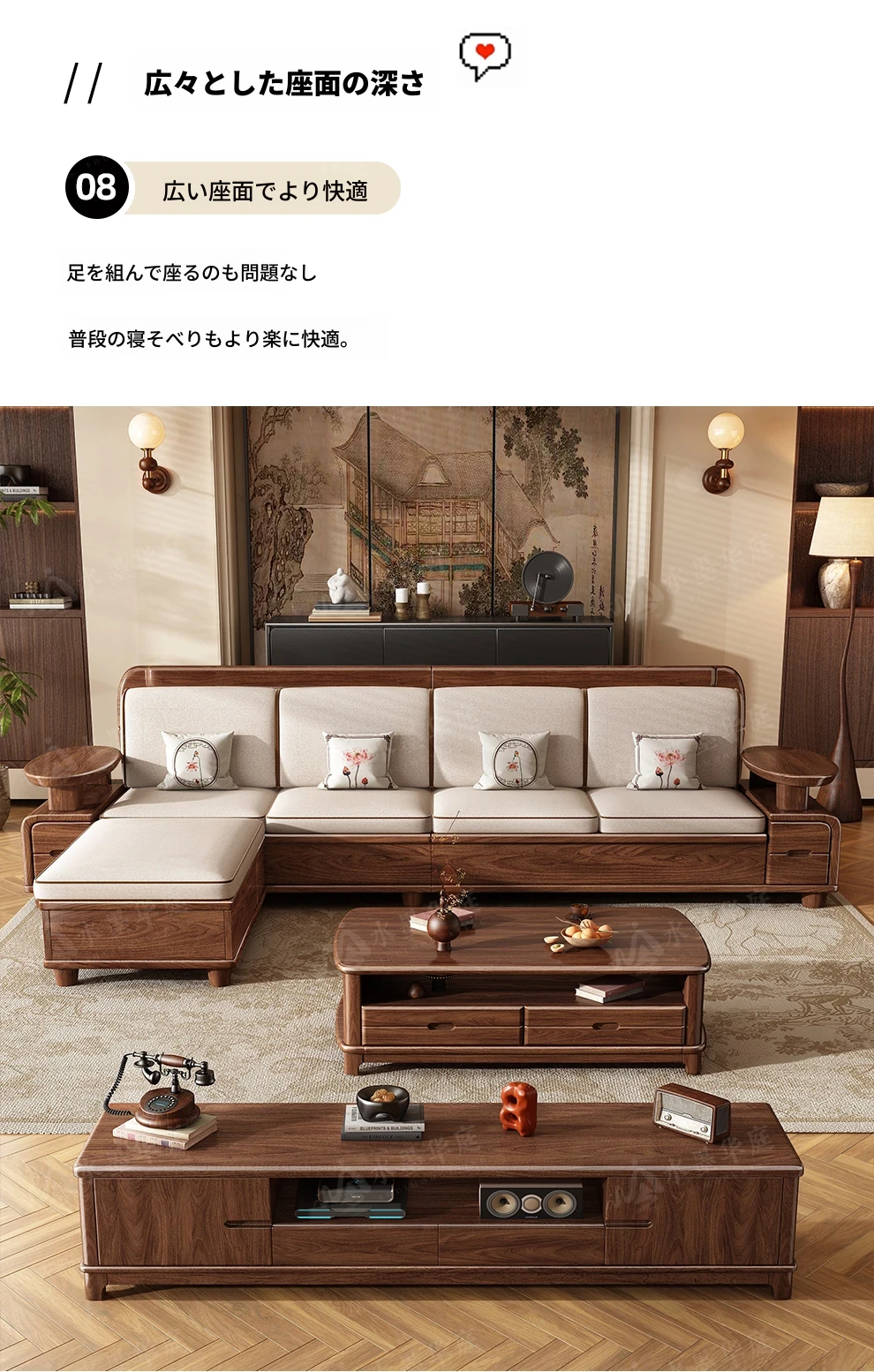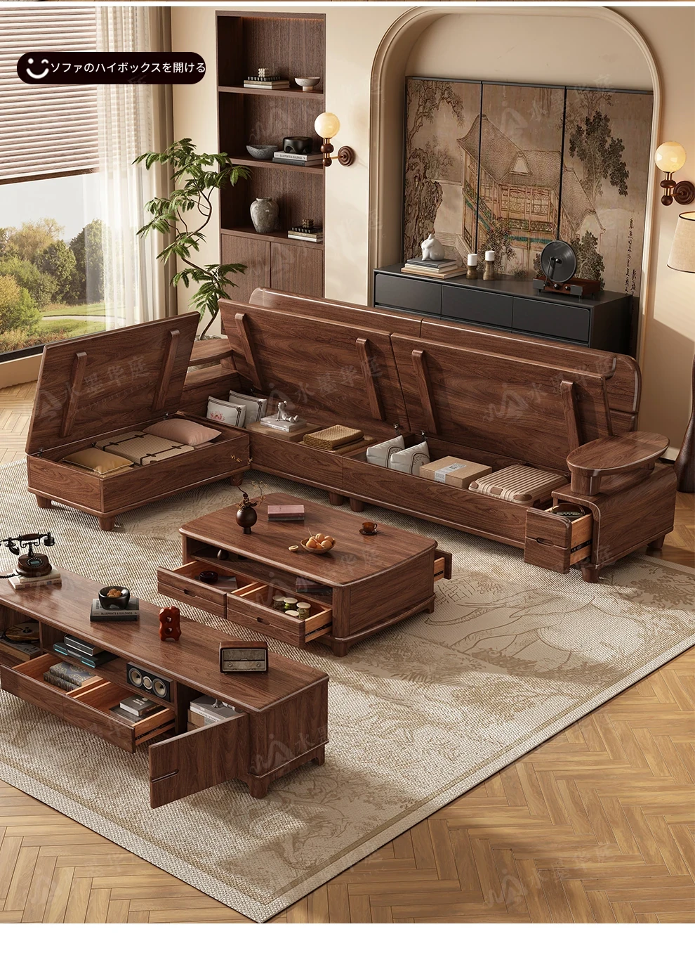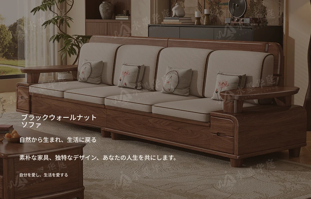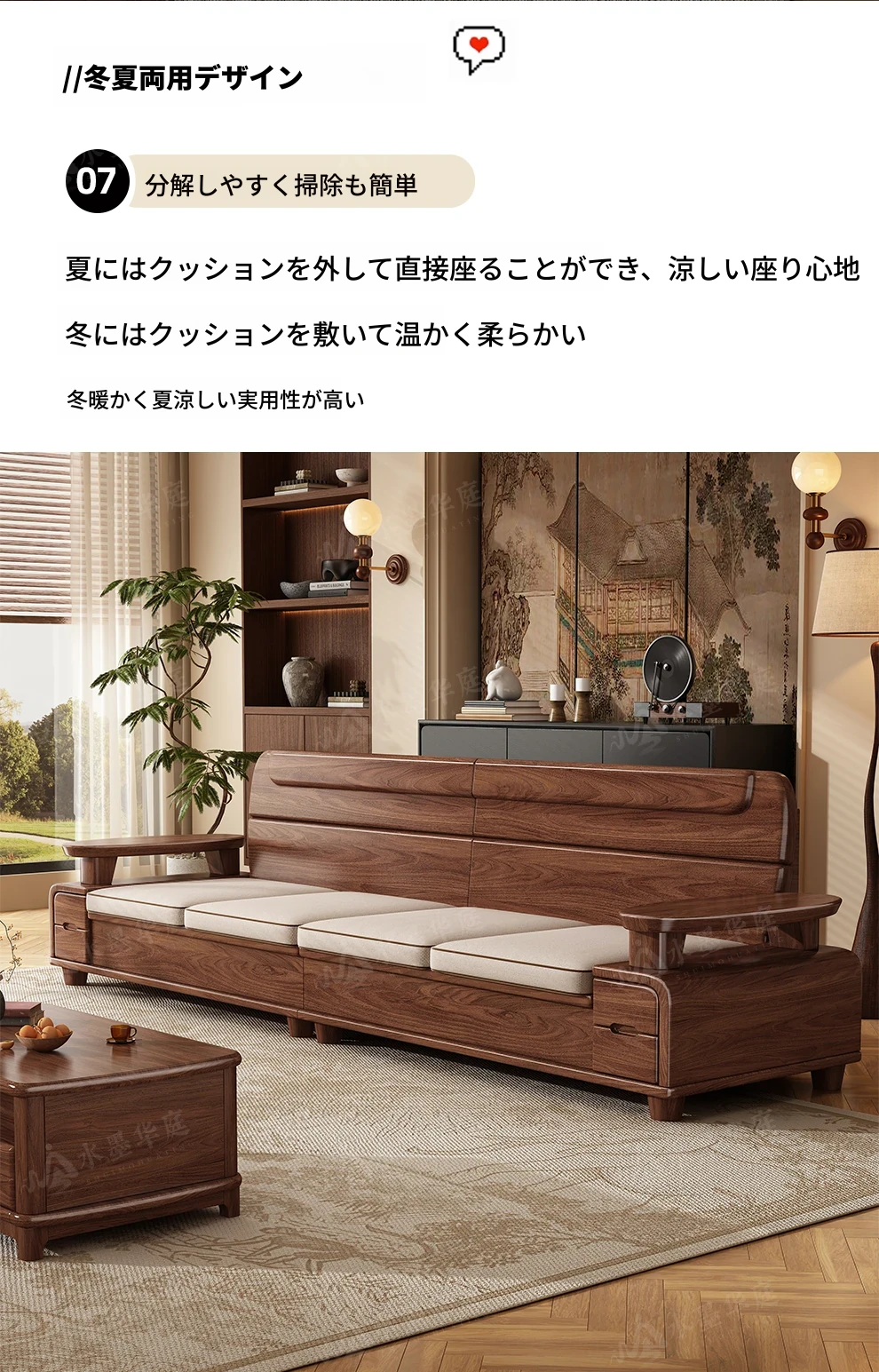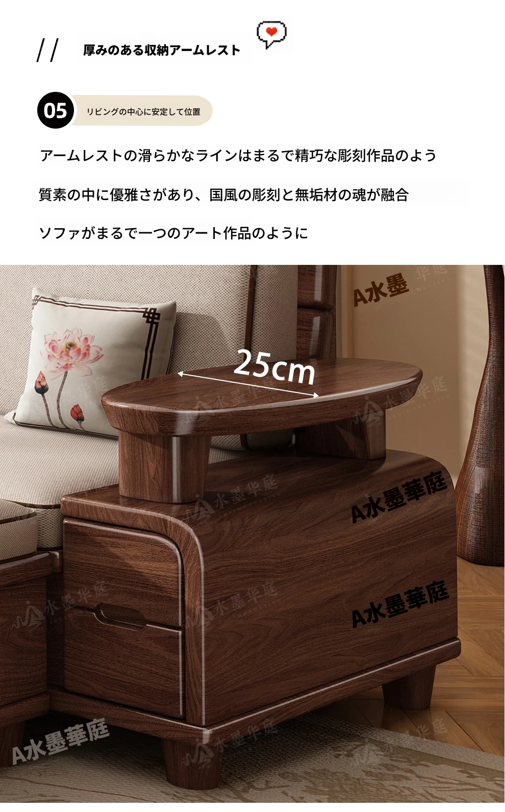 新中式スタイルのブラックウォールナット無垢材ソファー|コンパクトな高箱デザインで小さなリビングにも最適!モダンでシンプルな家具、洗練された空間を演出します。
