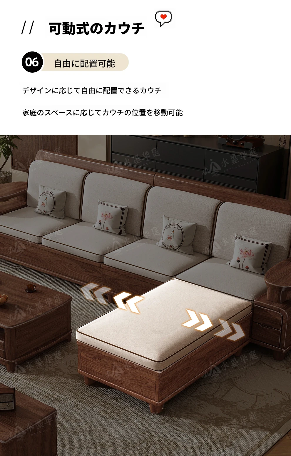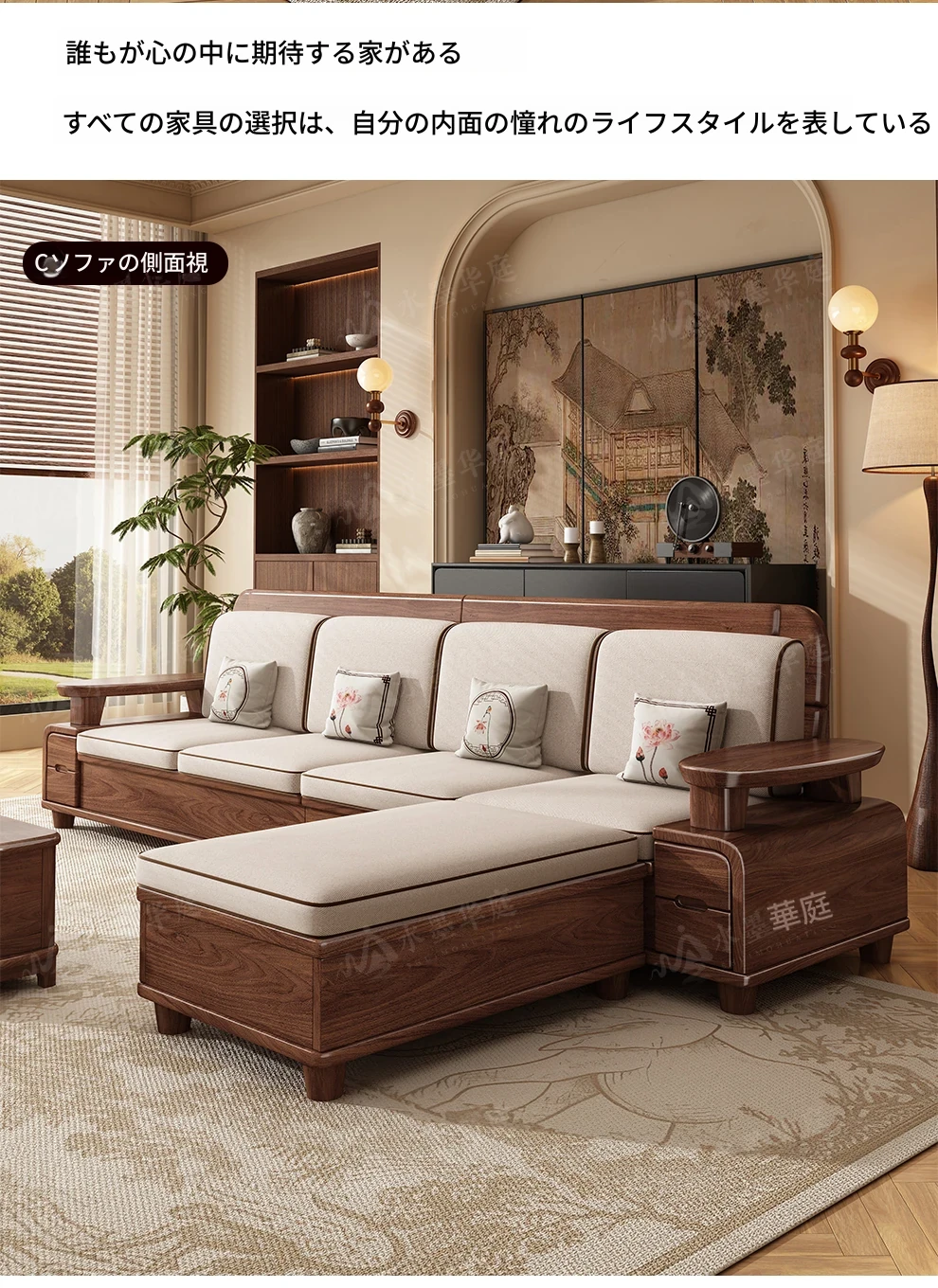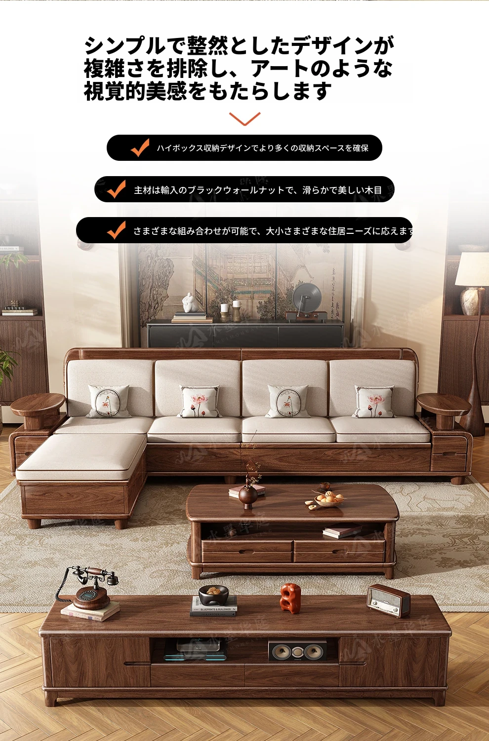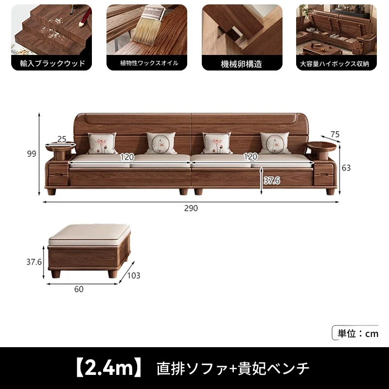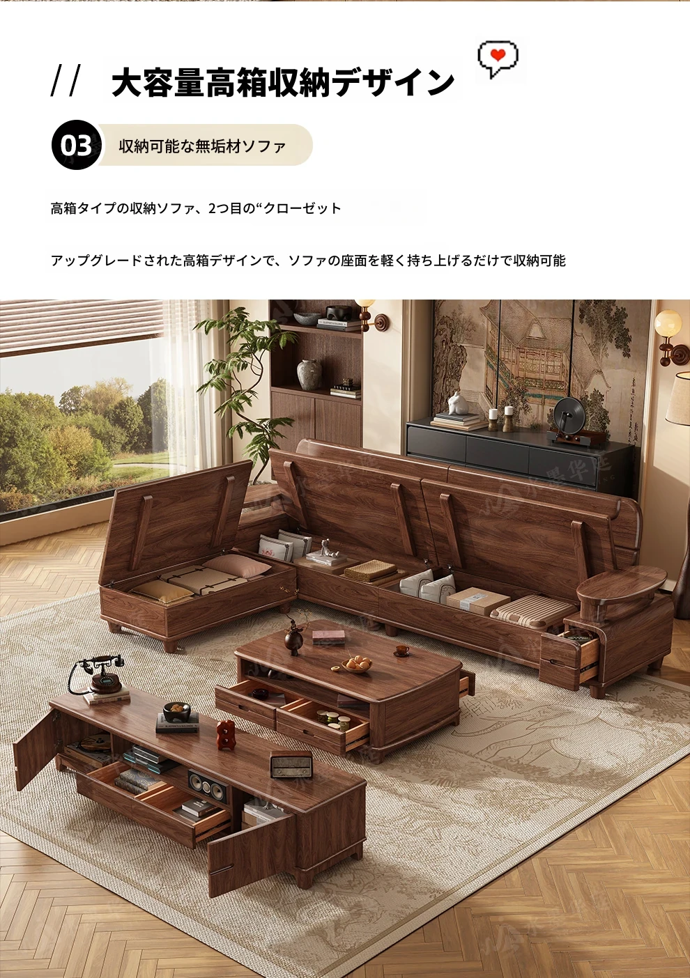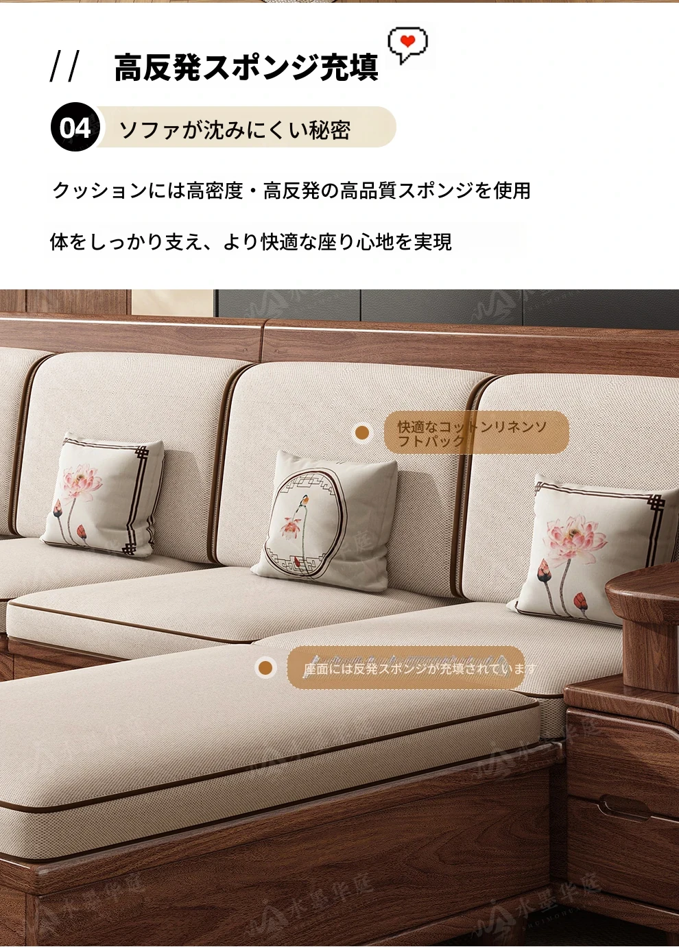 新中式スタイルのブラックウォールナット無垢材ソファー|コンパクトな高箱デザインで小さなリビングにも最適!モダンでシンプルな家具、洗練された空間を演出します。