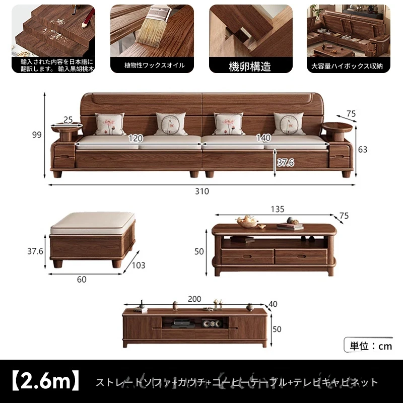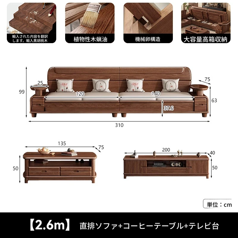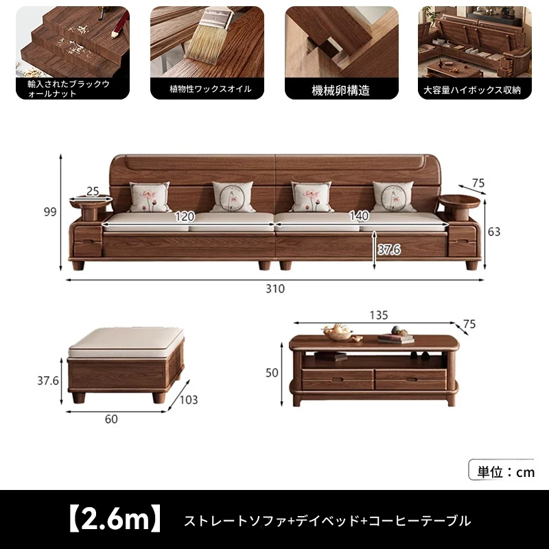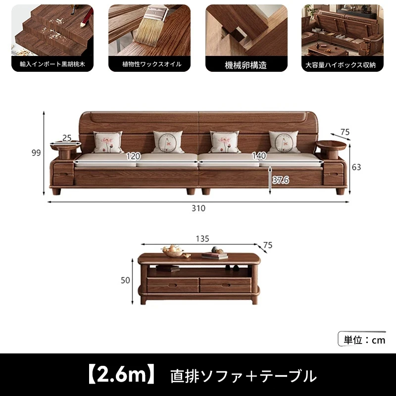 【2.6m】ストレートソファ+テーブル+テレビ台
