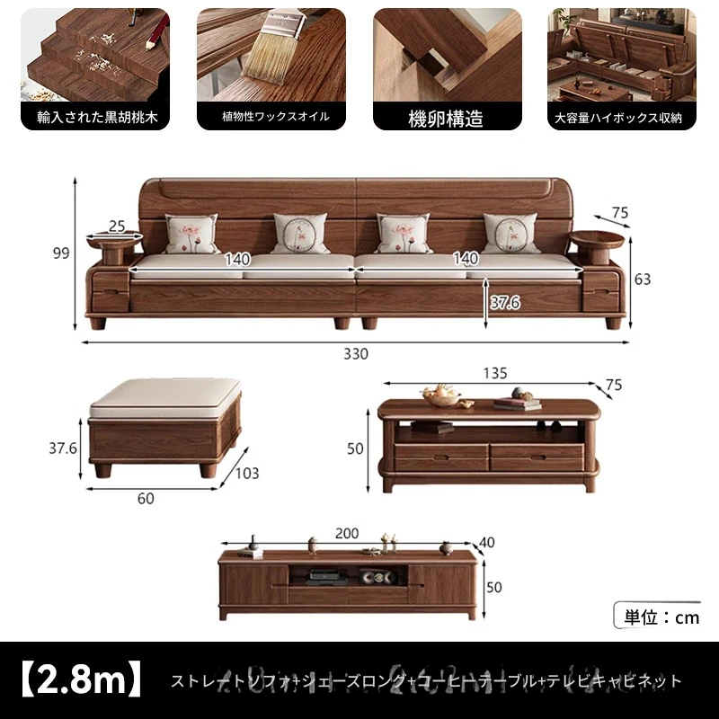 【2.8m】ストレートソファ+カウチ+テーブル+テレビ台