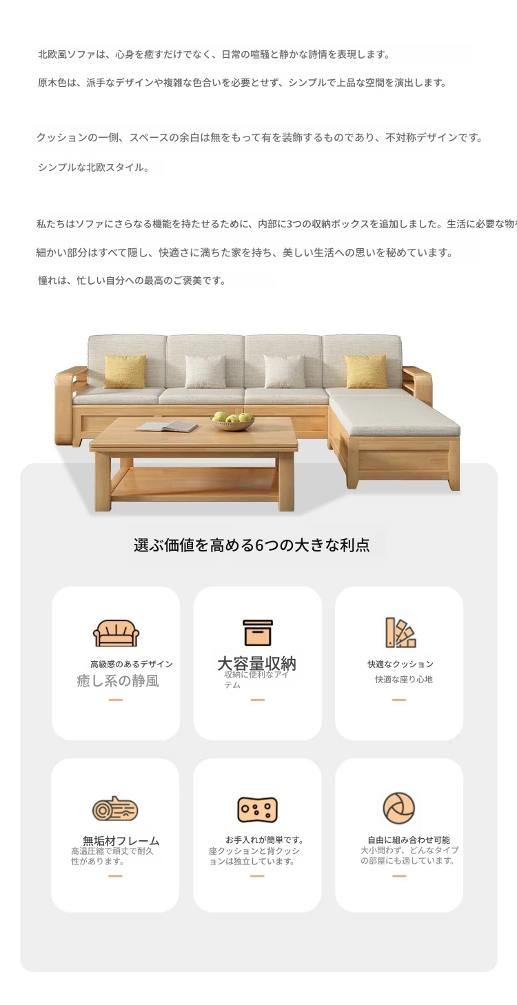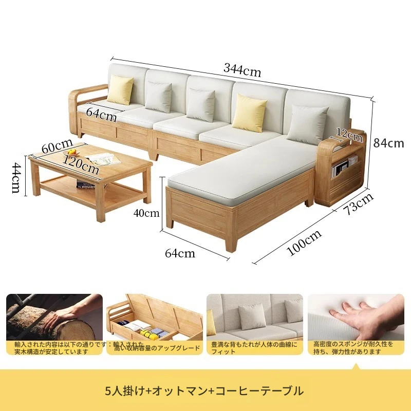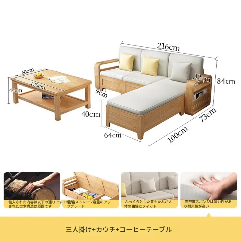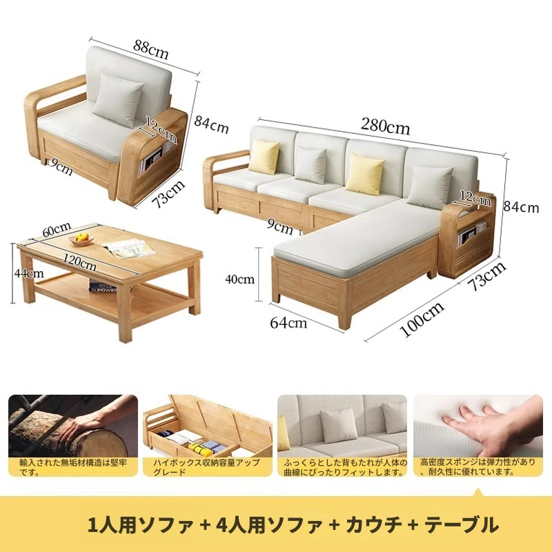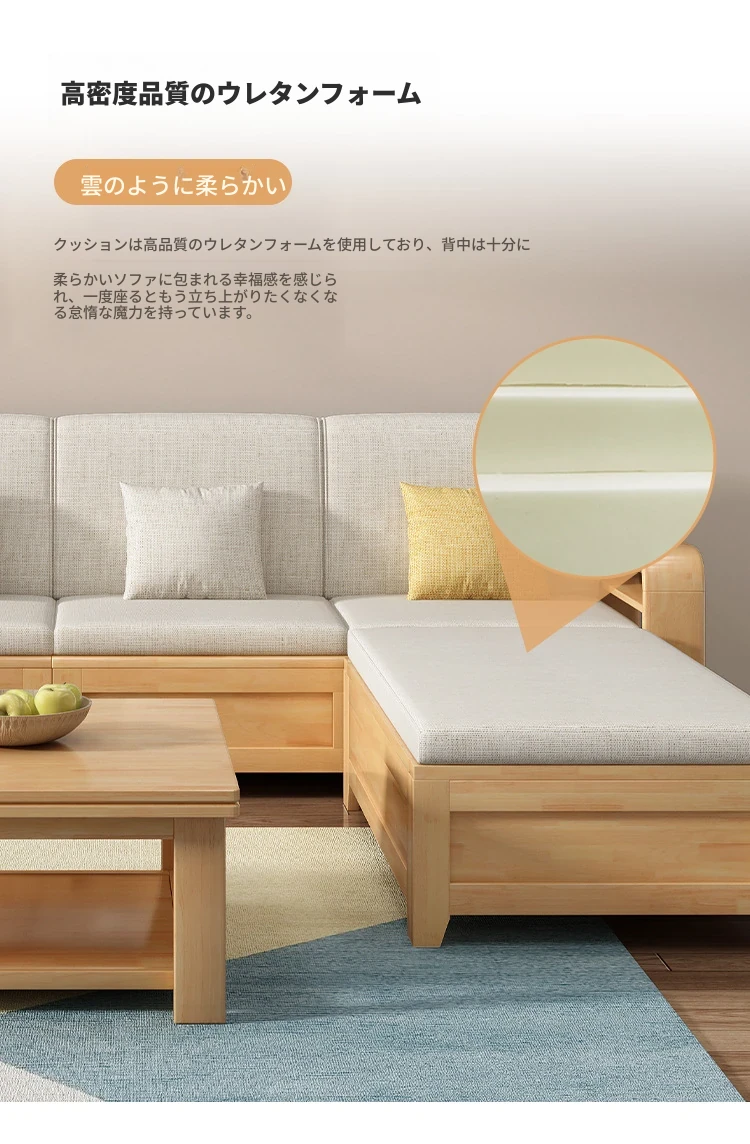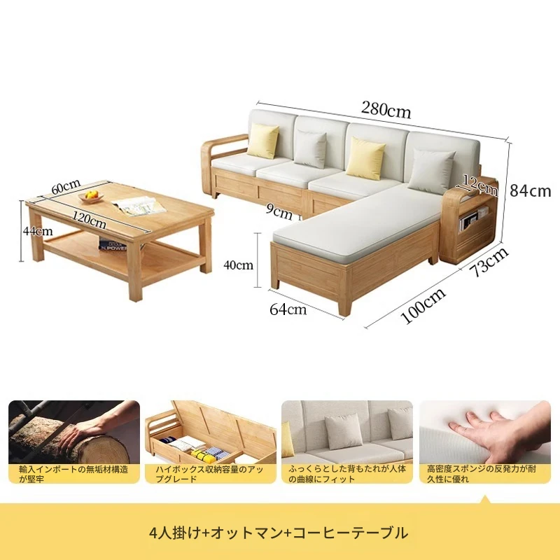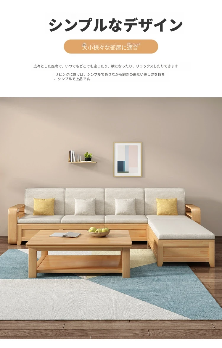 モダンでシンプルな実木ソファとコーヒーテーブルのセット - 冬夏両用の布製高箱収納付きコーナーソファ!おしゃれなリビングに最適な家具です。心地よい空間を演出し、収納力も抜群!