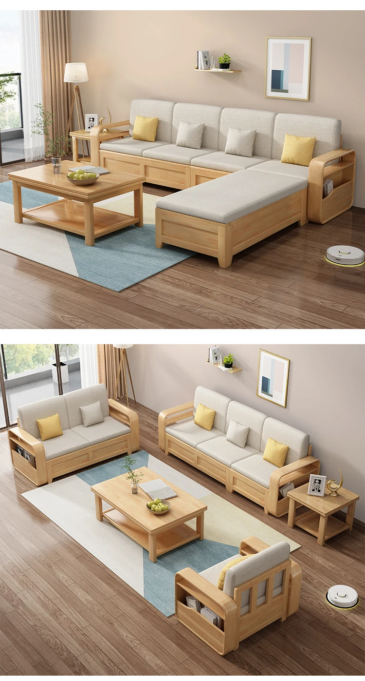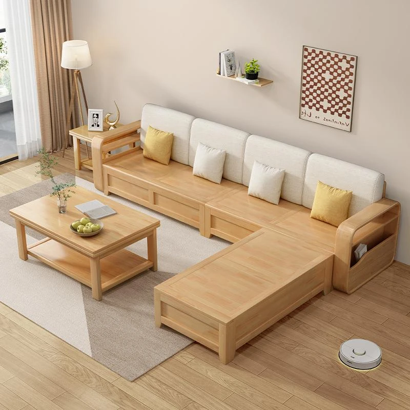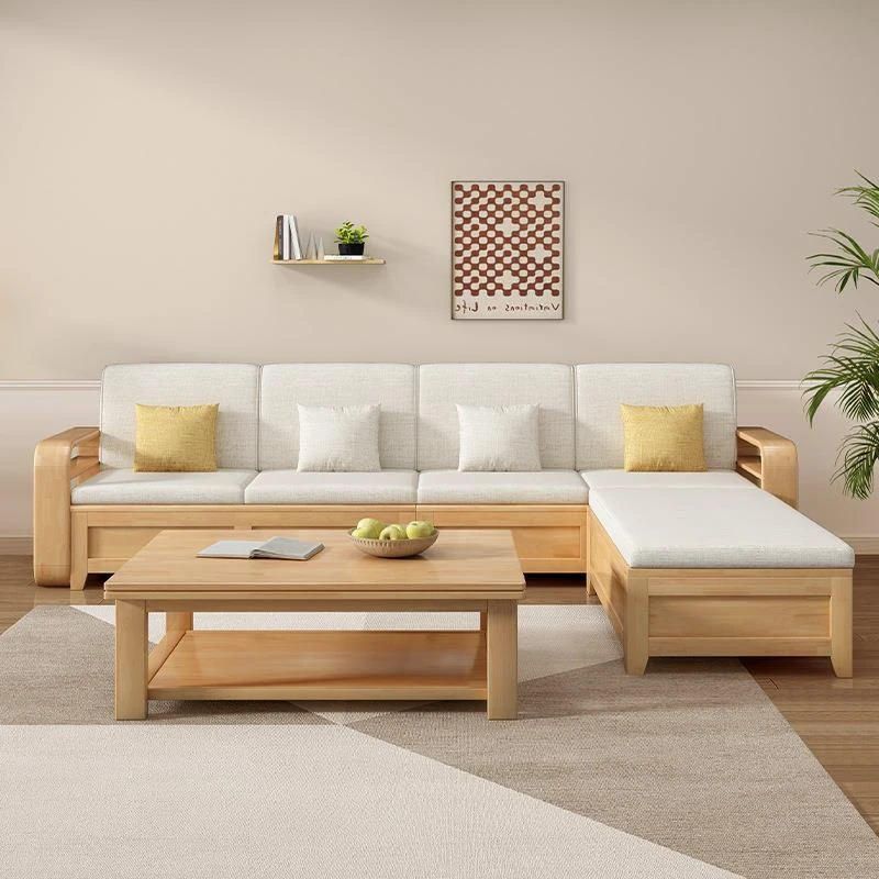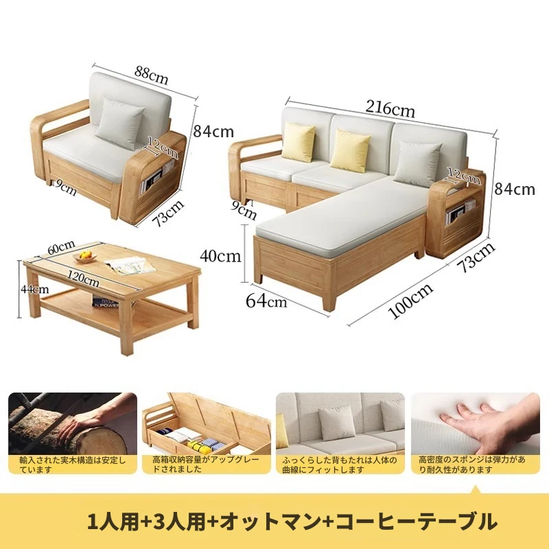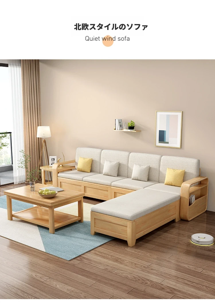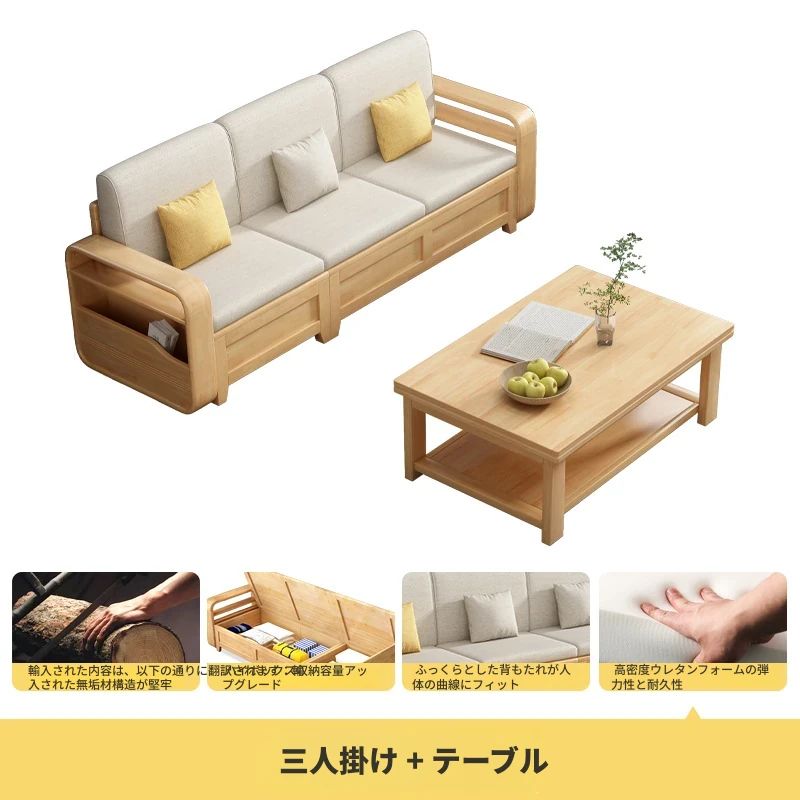 モダンでシンプルな実木ソファとコーヒーテーブルのセット - 冬夏両用の布製高箱収納付きコーナーソファ!おしゃれなリビングに最適な家具です。心地よい空間を演出し、収納力も抜群!