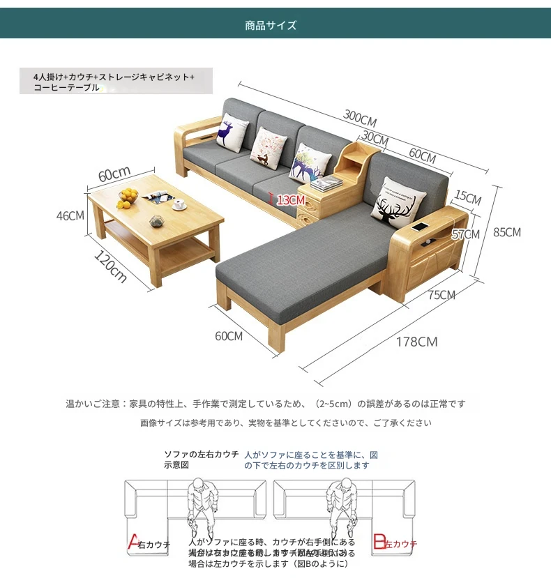 【アーム付きカウチ】4人用ソファ+オットマン+コーヒーテーブル+収納キャビネット【腰枕プレゼント】