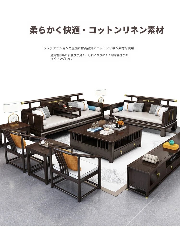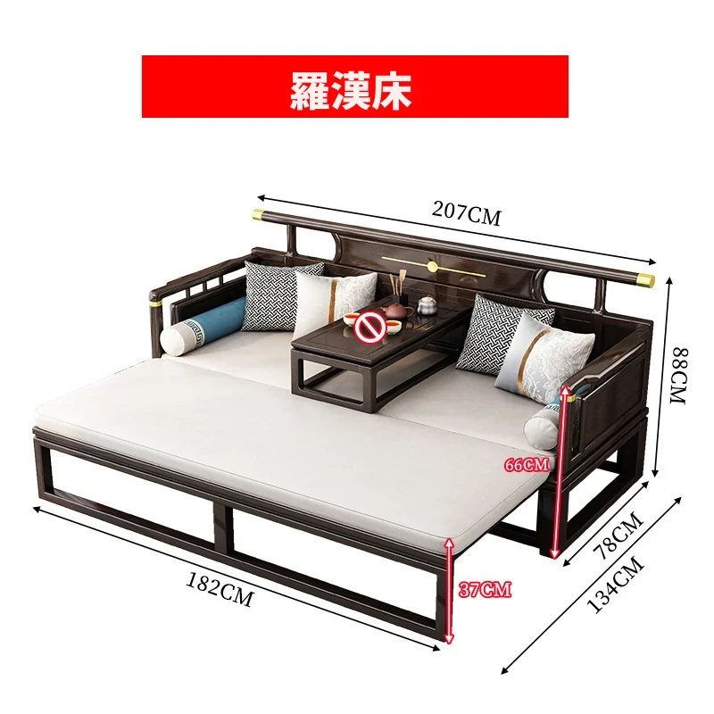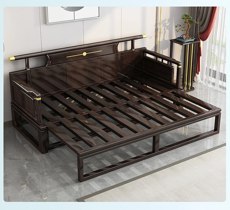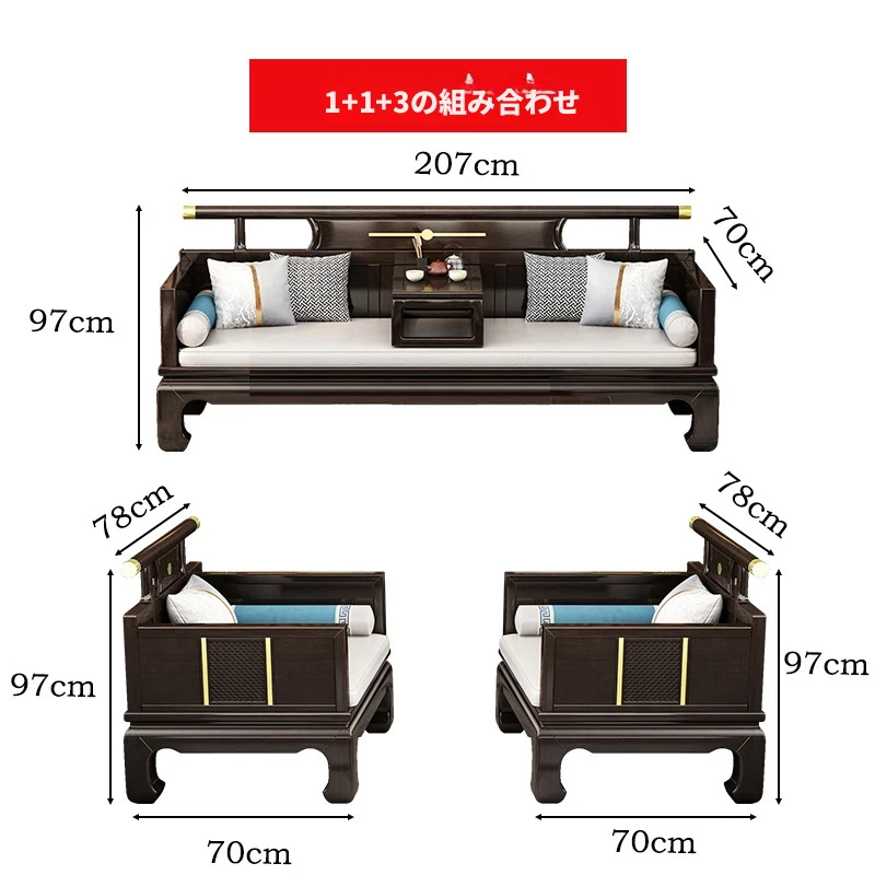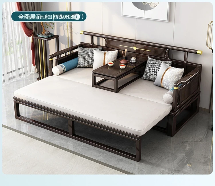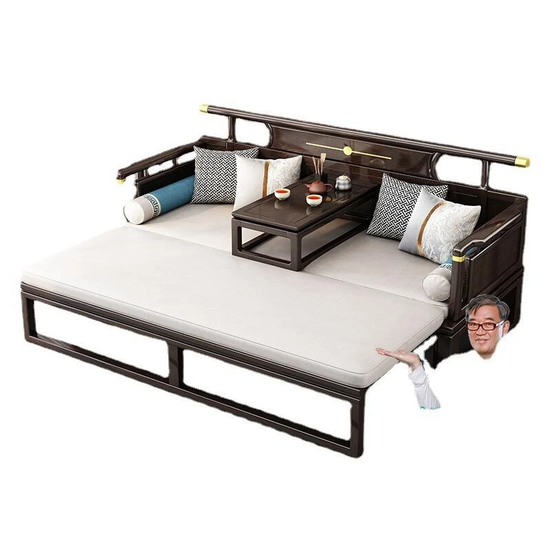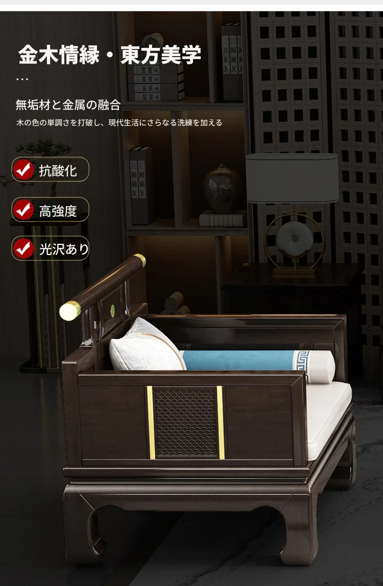 新中式の実木ソファセット - ローハンベッドとプッシュプル折りたたみ機能付き!小さなお部屋にもぴったりな多機能家具で、快適なリビング空間を演出します。