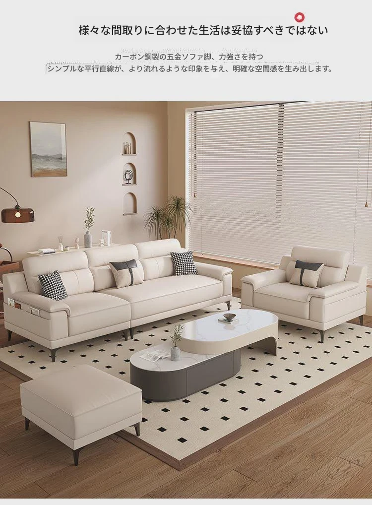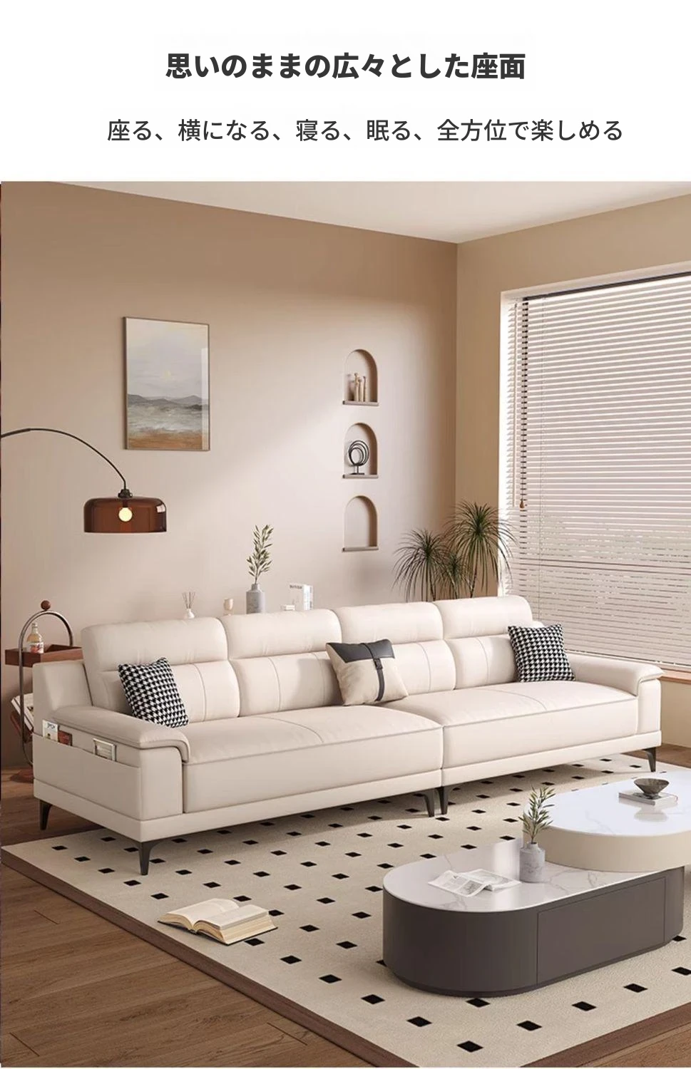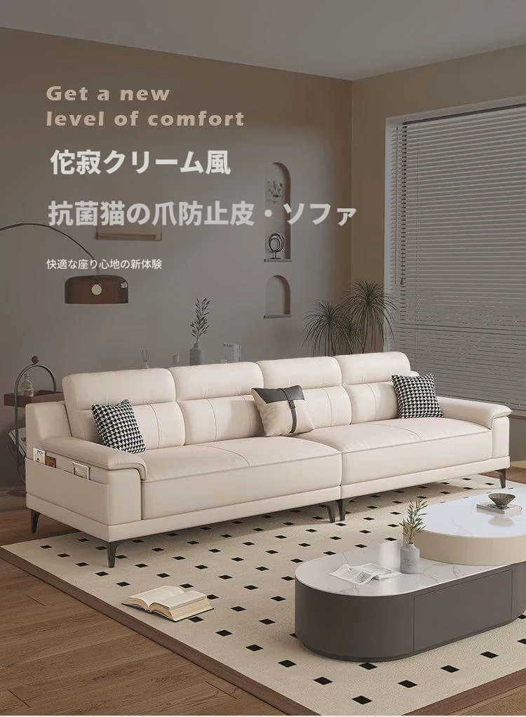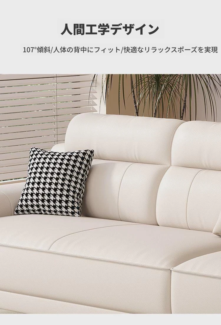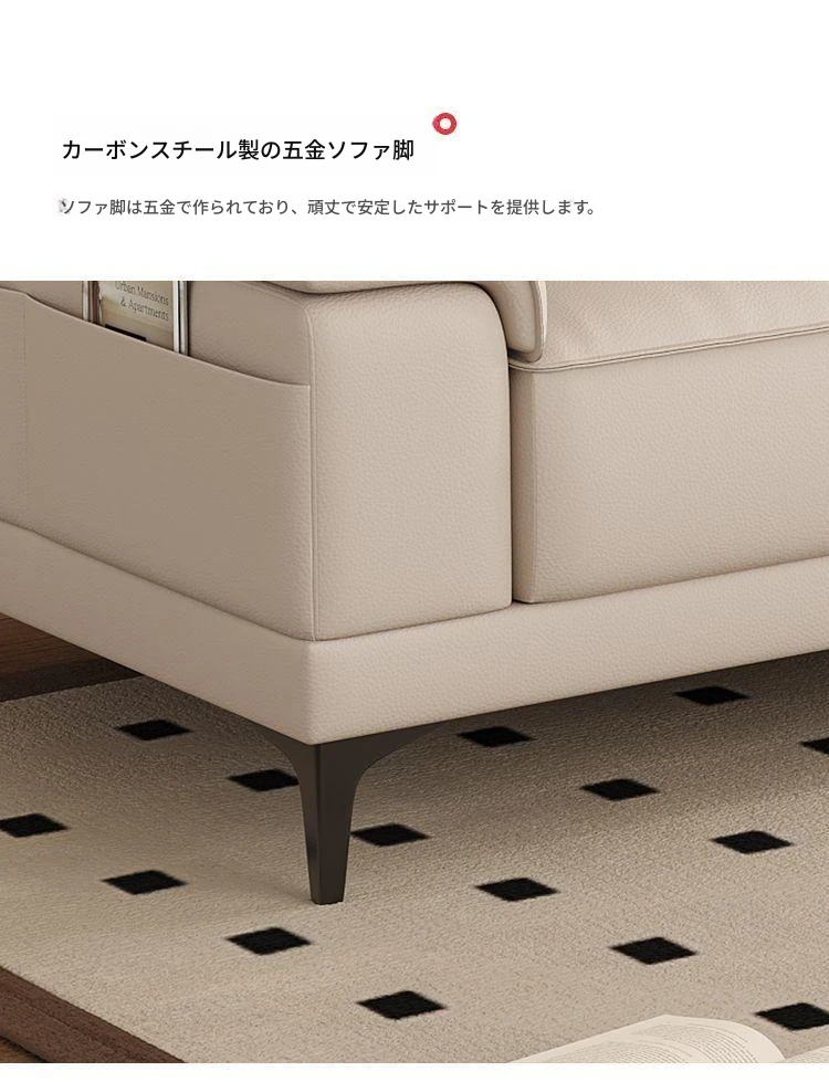 新作!ミニマリストデザインのクリーム色キャットクロー真皮ソファー。北欧モダンスタイルで、リビングルームに最適。小型スペースにもぴったり!お手入れ不要で、シンプルな美しさをお楽しみください。