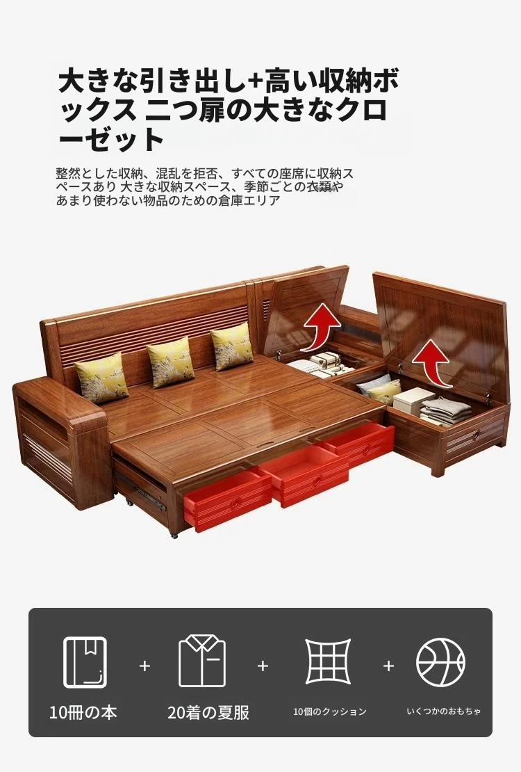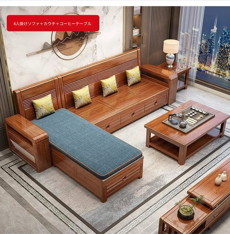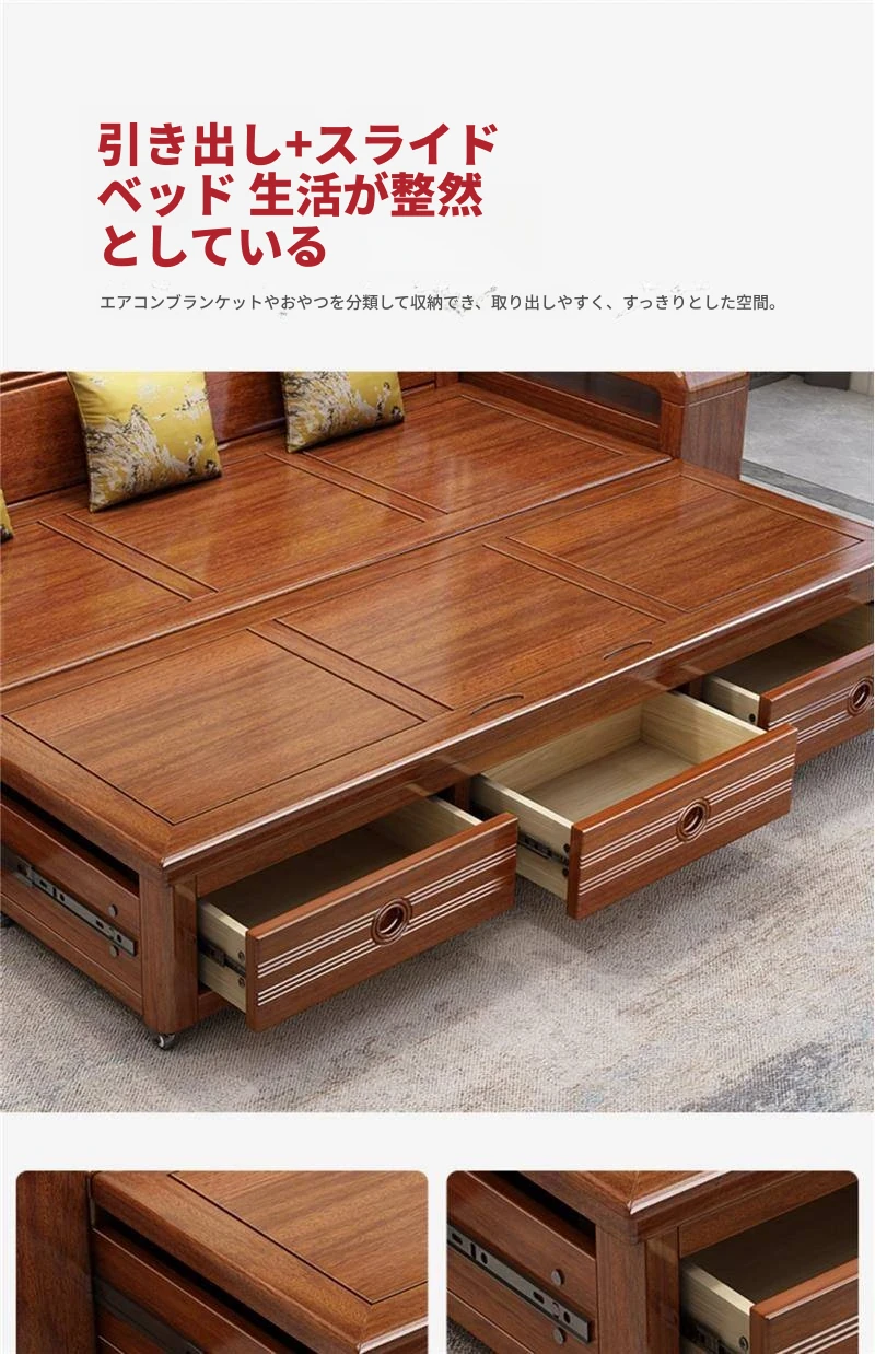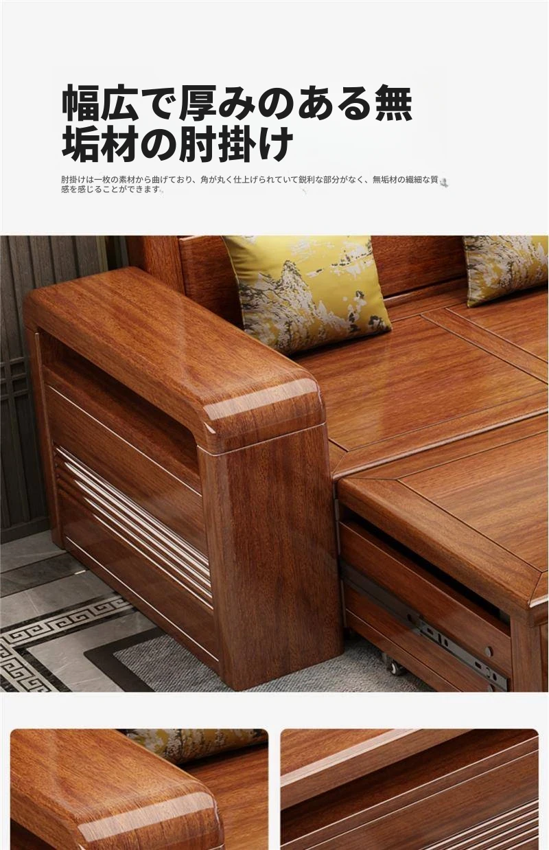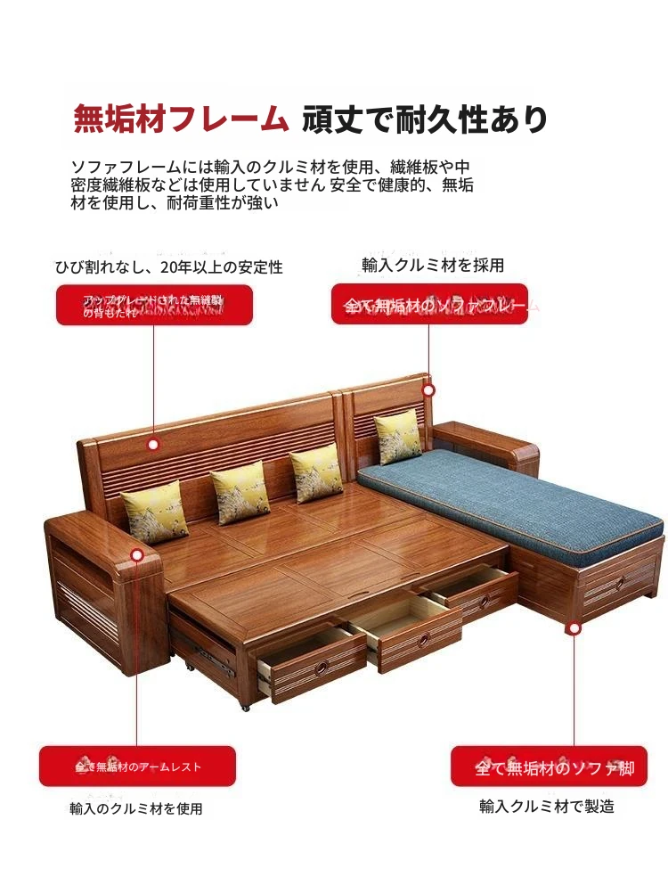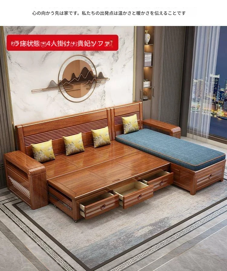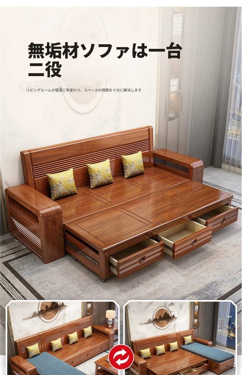 新作!おしゃれなリビング用無垢材ソファ - コンパクトな3人掛け、引き出し収納付き・新中式デザインの多機能ソファベッド!狭いお部屋にもぴったりなスタイルと機能性を兼ね備えた一品です。