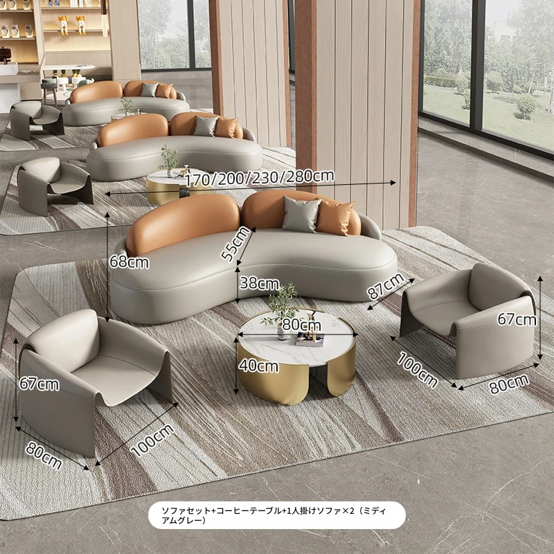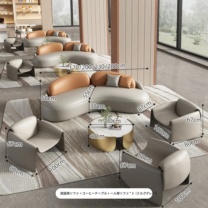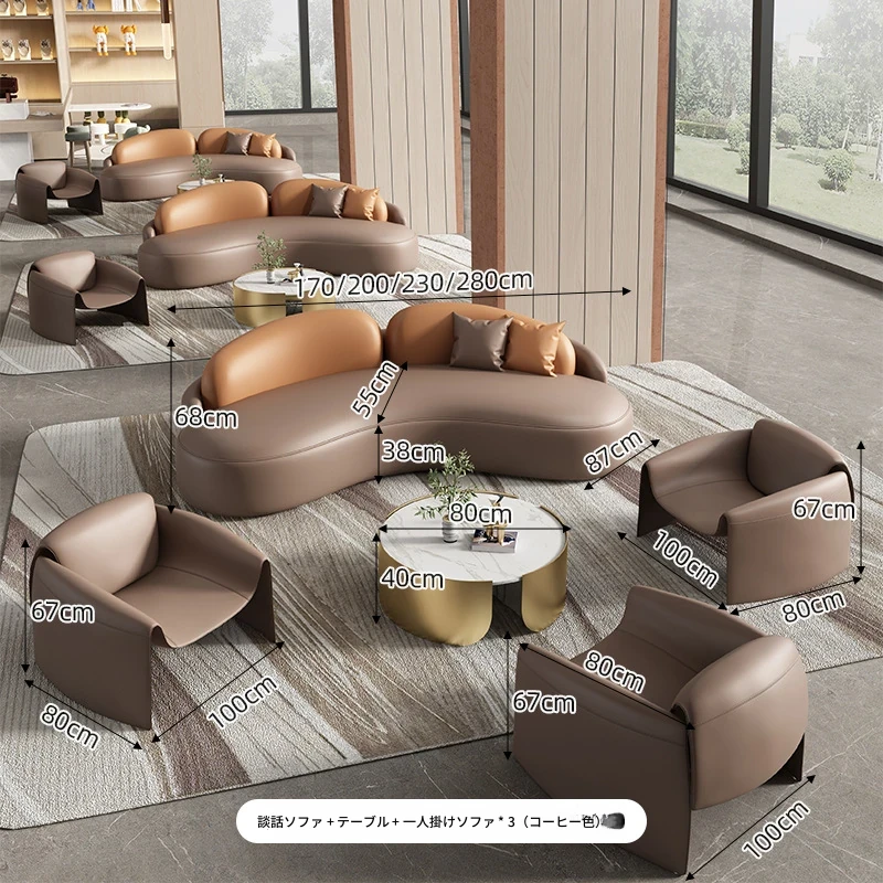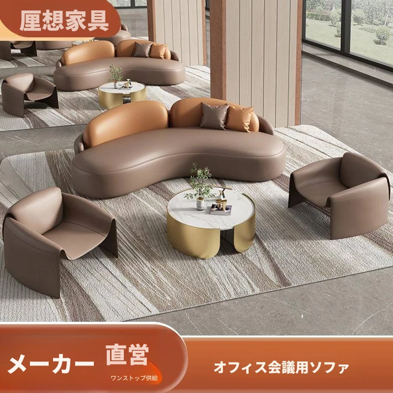 北欧スタイルのホテルロビー用ソファセット | オフィスビジネス向け高級レザーソファ & レセプションテーブル | おしゃれで快適な打ち合わせスペースを演出!