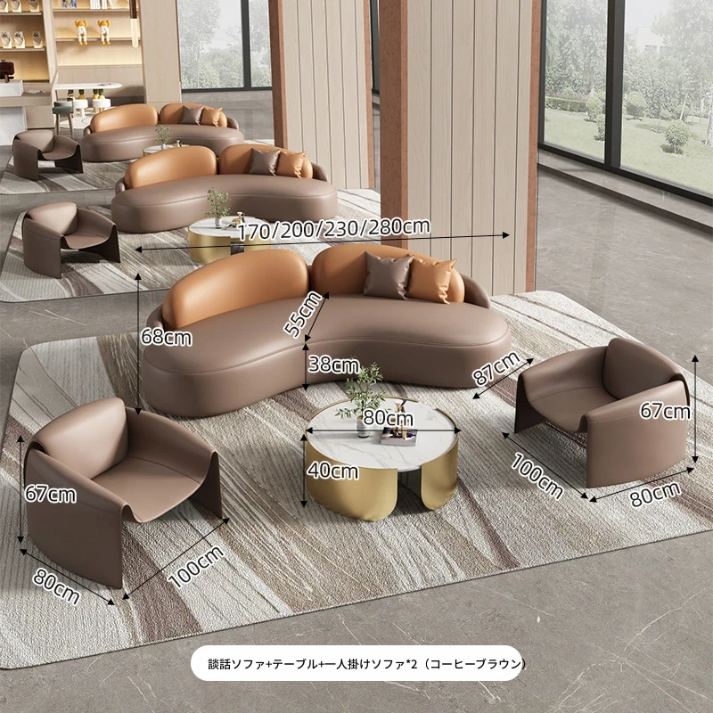 【セットE】2メートルソファ+コーヒーテーブル+一人用*3【コーヒー色】